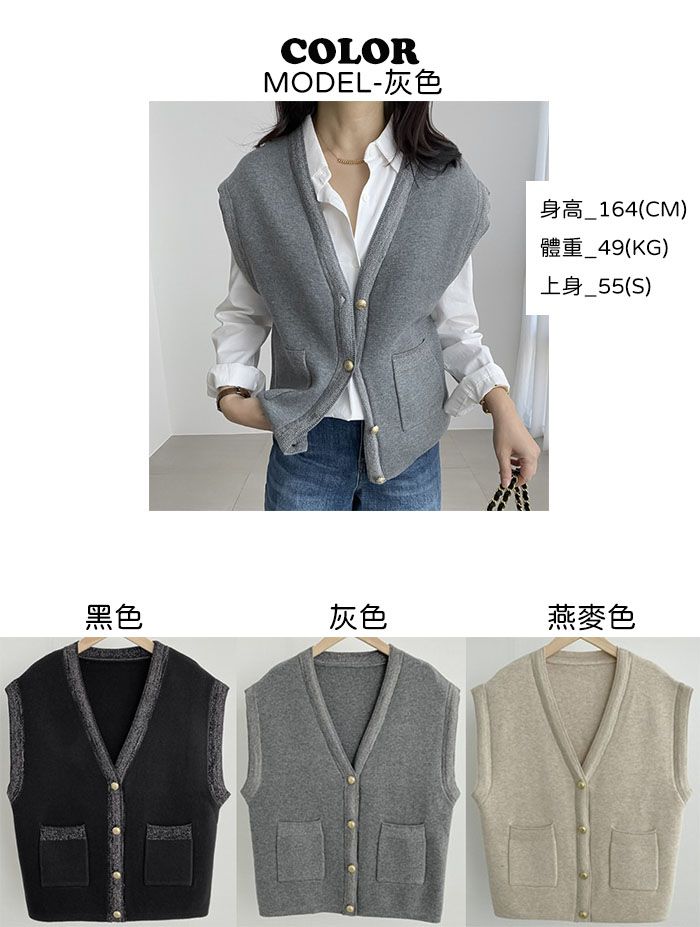★限時24H優惠★【C55711】韓國RUN 銀絲滾邊針織衫-素面V領雙口袋排釦無袖背心外套