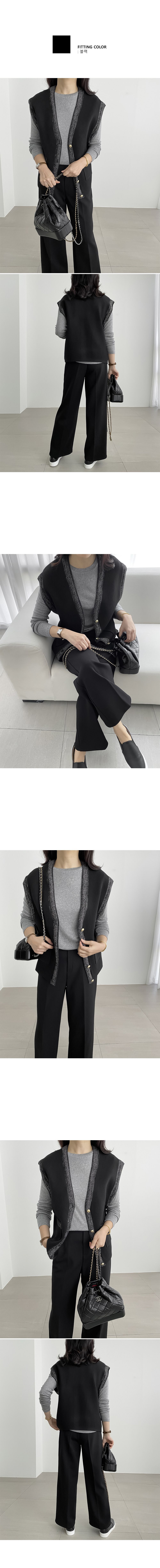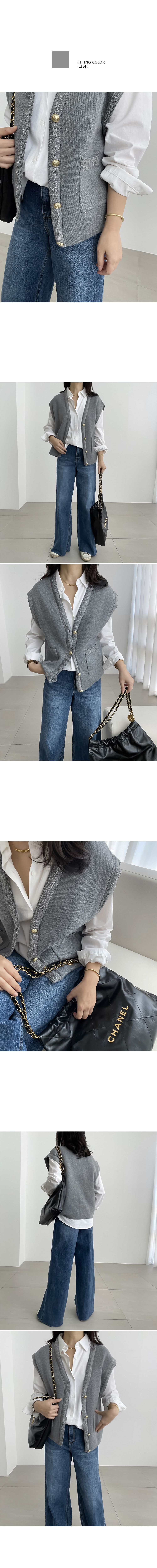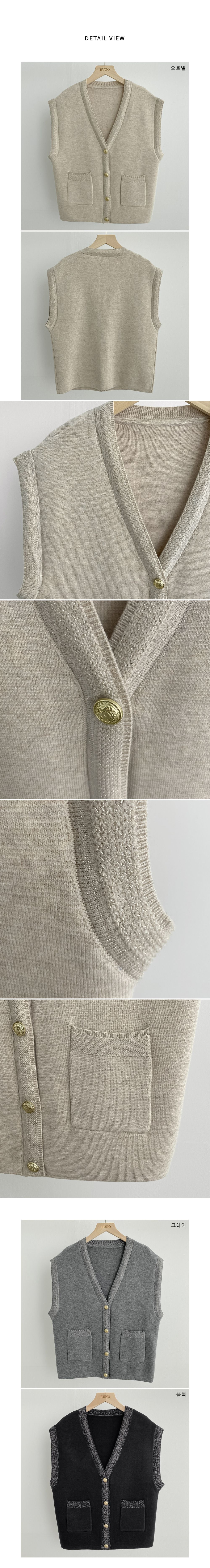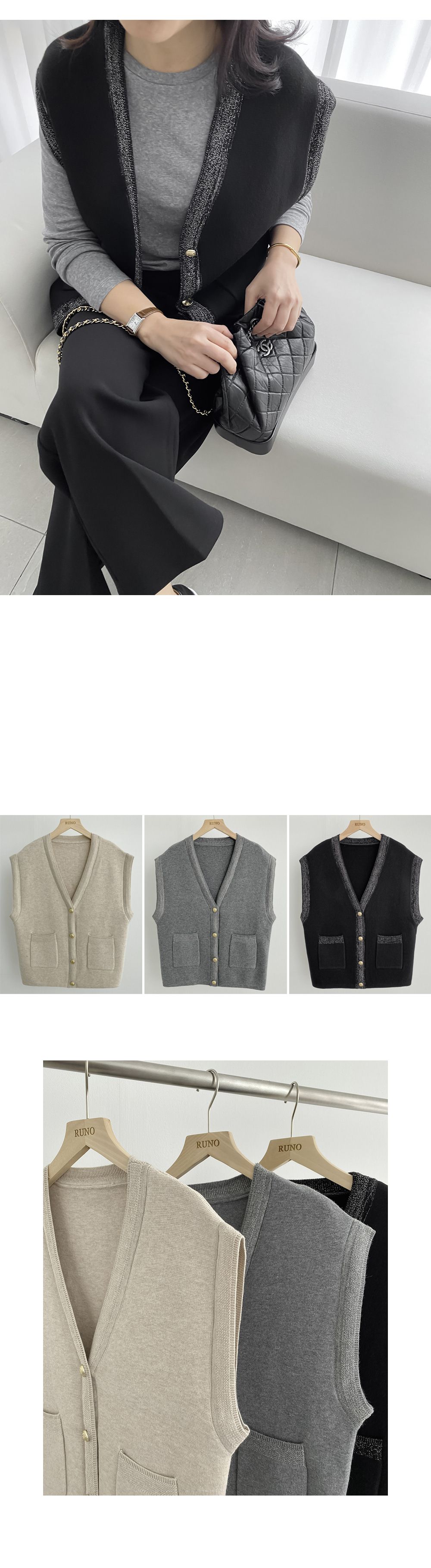 閃亮絲線滾邊/V領/開襟排釦/金色鈕釦/雙口袋/寬肩無袖 - 休閒婚禮OL上班族簡約百搭素面銀絲滾邊針織衫針織背心針織外套無袖背心外套黑色灰色燕麥色