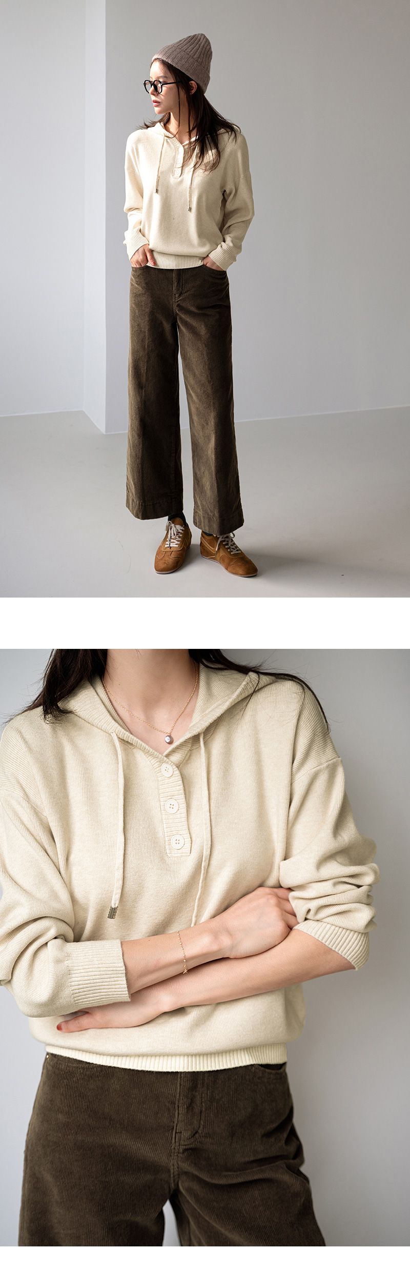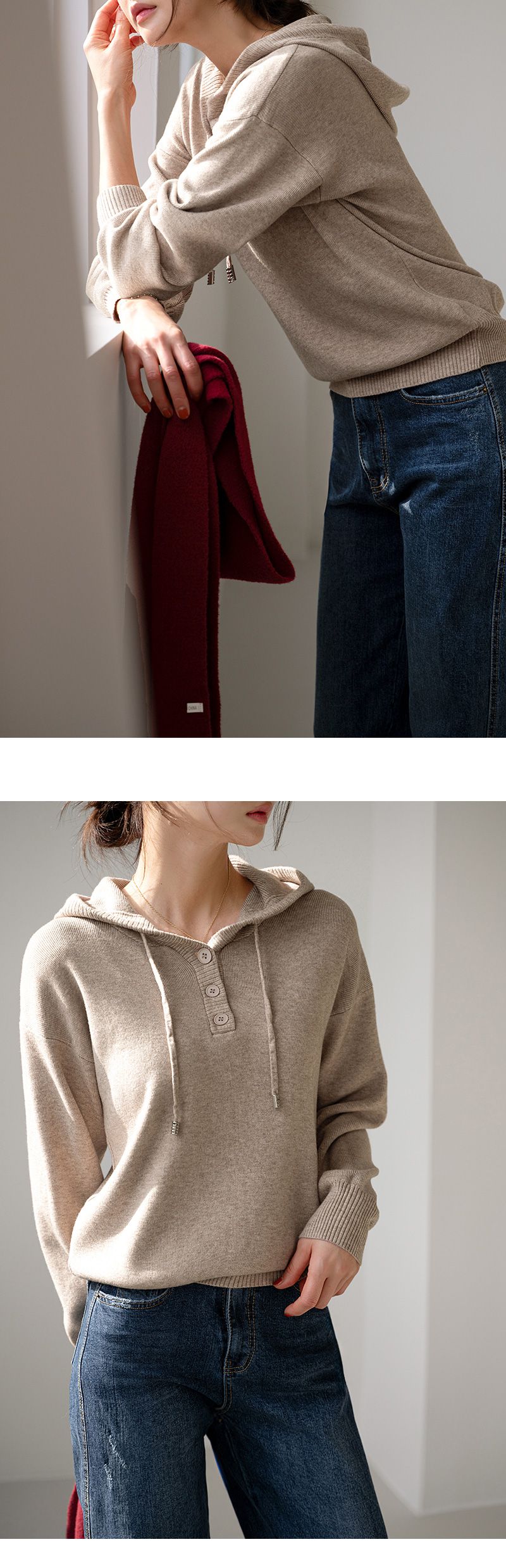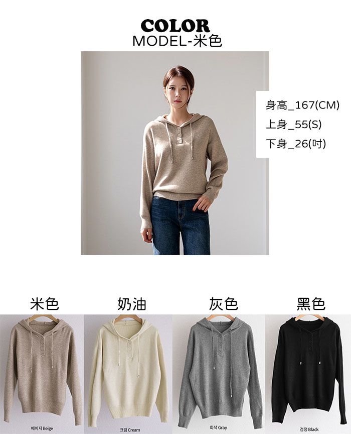 半開襟排釦領/抽繩連帽 - 休閒居家簡約百搭素面抽繩連帽針織衫連帽上衣針織上衣落肩長袖上衣米色奶油色灰色黑色