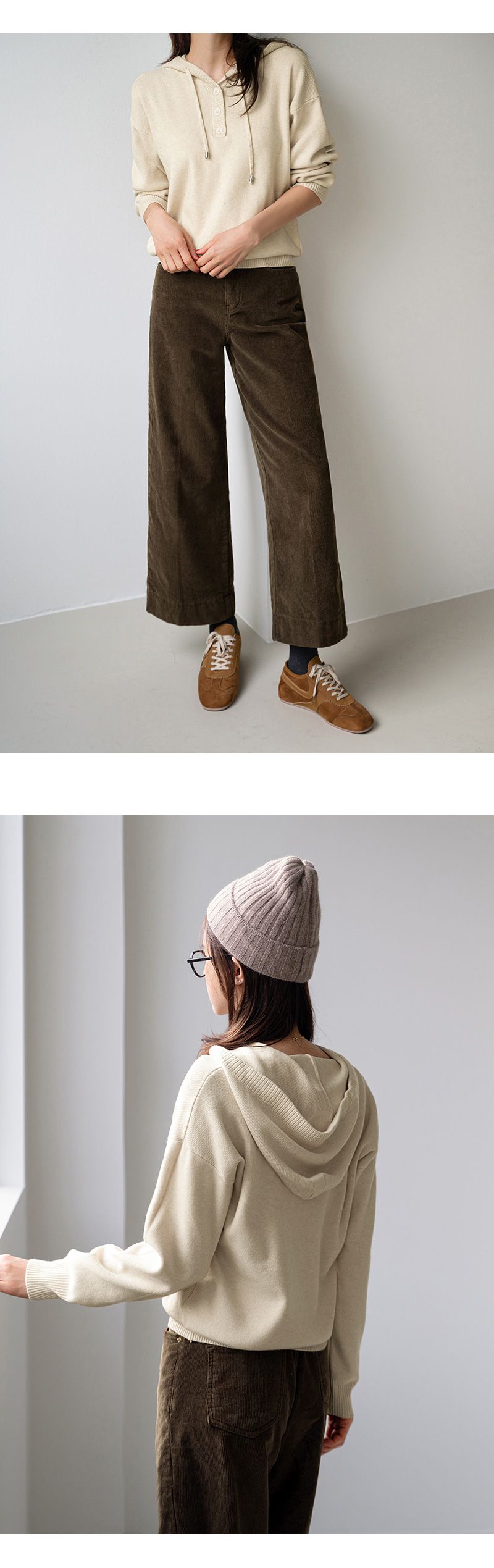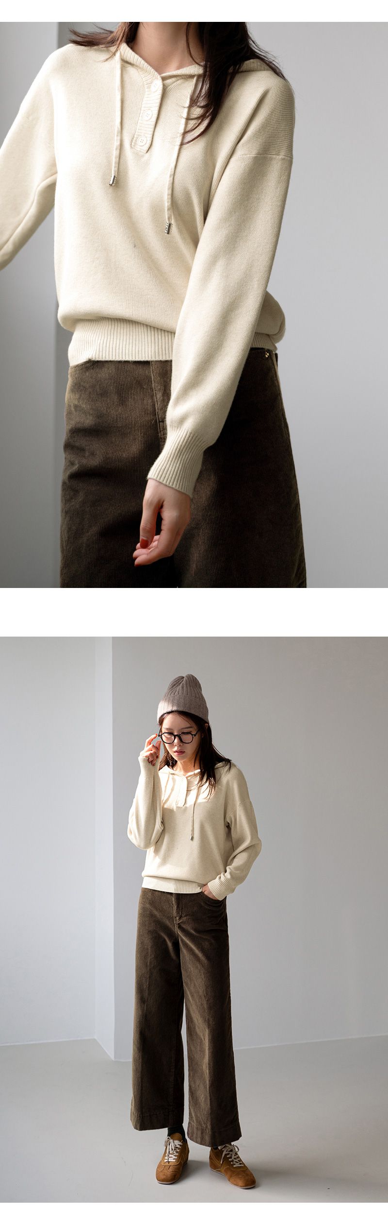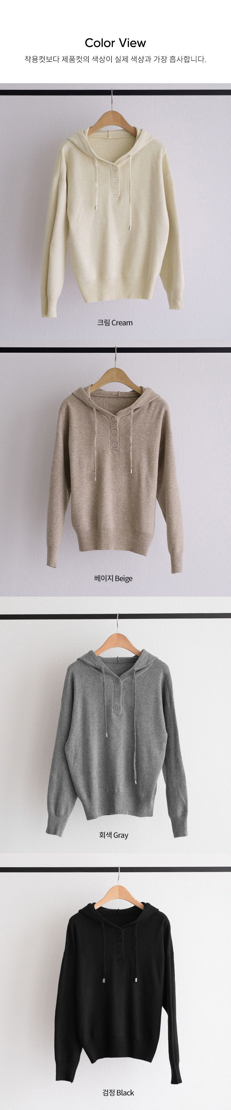 半開襟排釦領/抽繩連帽 - 休閒居家簡約百搭素面抽繩連帽針織衫連帽上衣針織上衣落肩長袖上衣米色奶油色灰色黑色