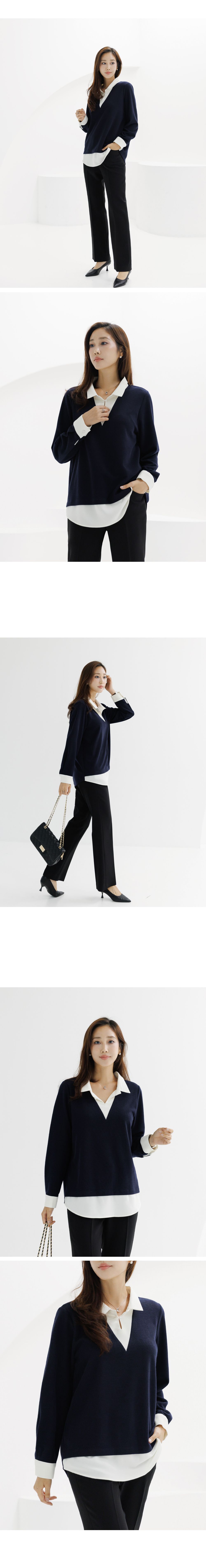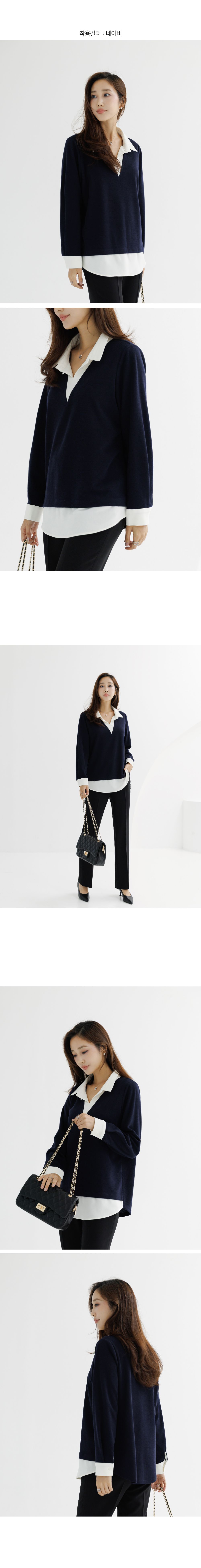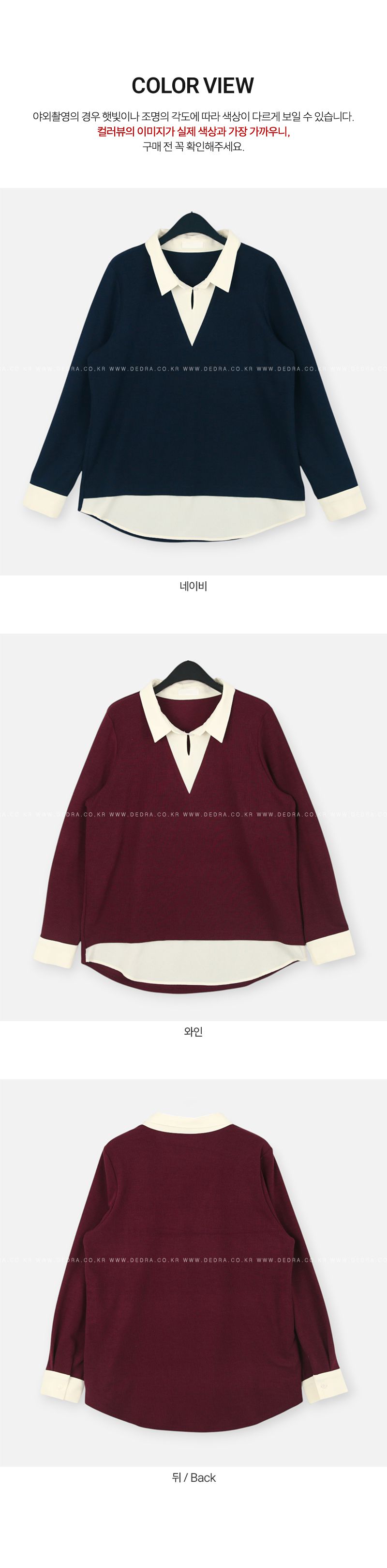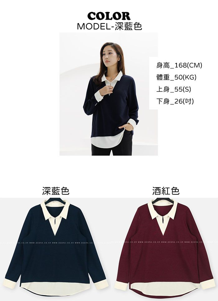 假兩件拼接更有層次感/長版遮住肉肉臀部/兩種尺寸可選-休閒居家簡約百搭單釦假兩件素面V領寬鬆圓弧下襬長版長袖上衣深藍色酒紅色