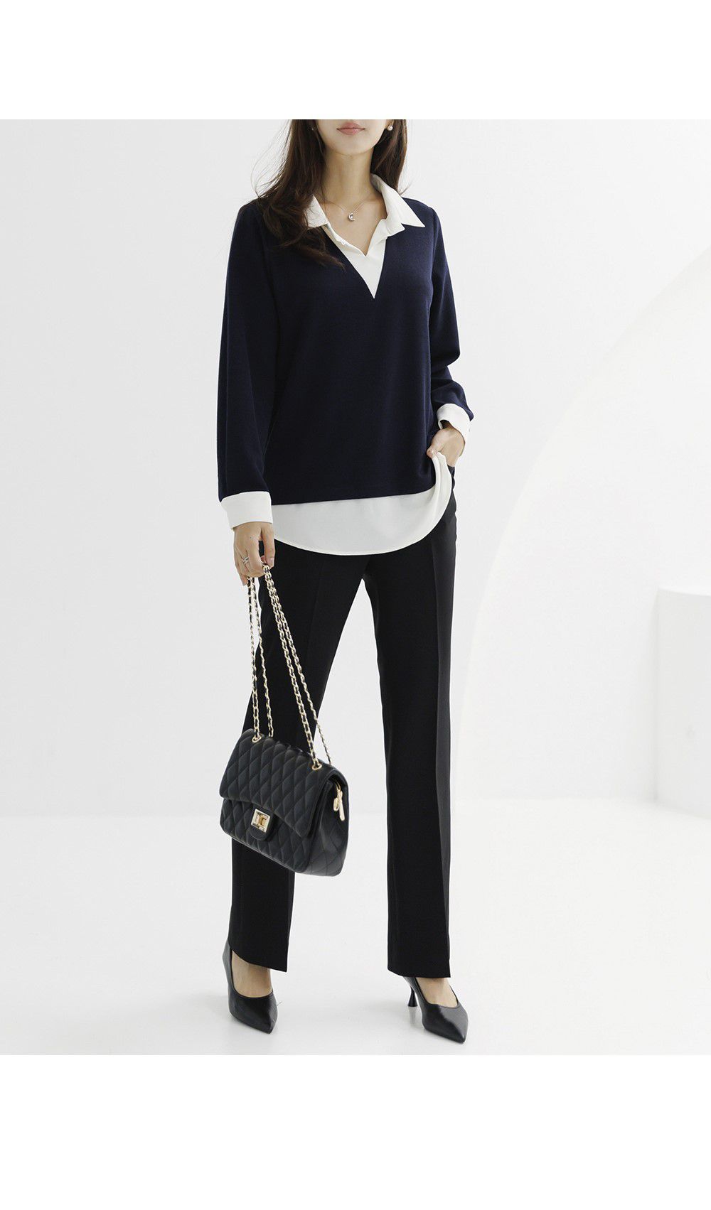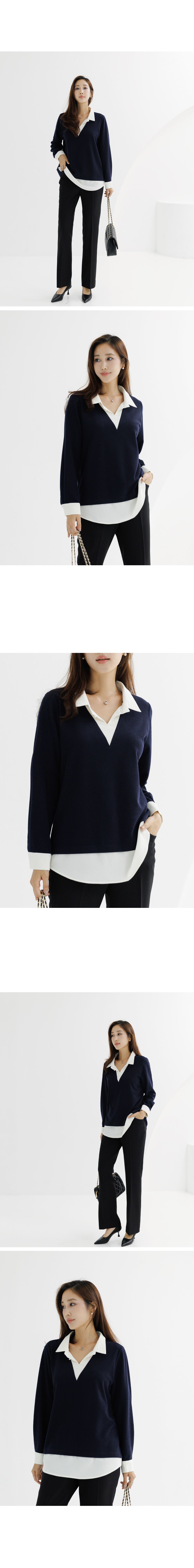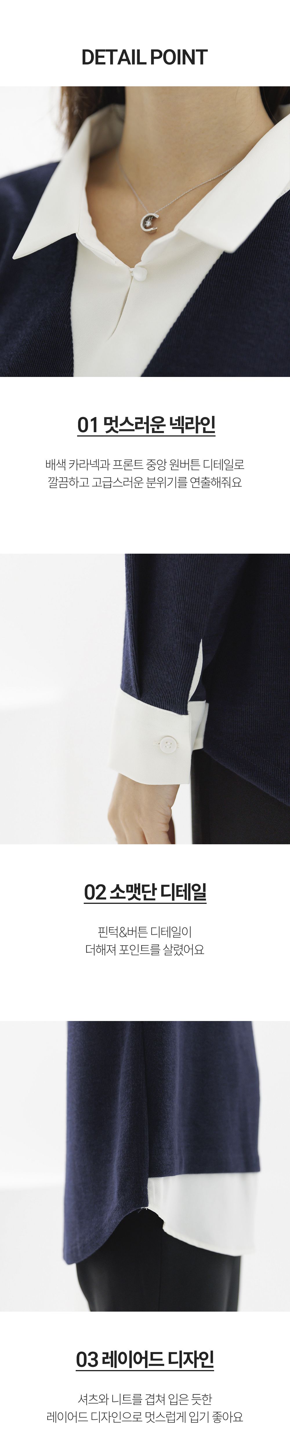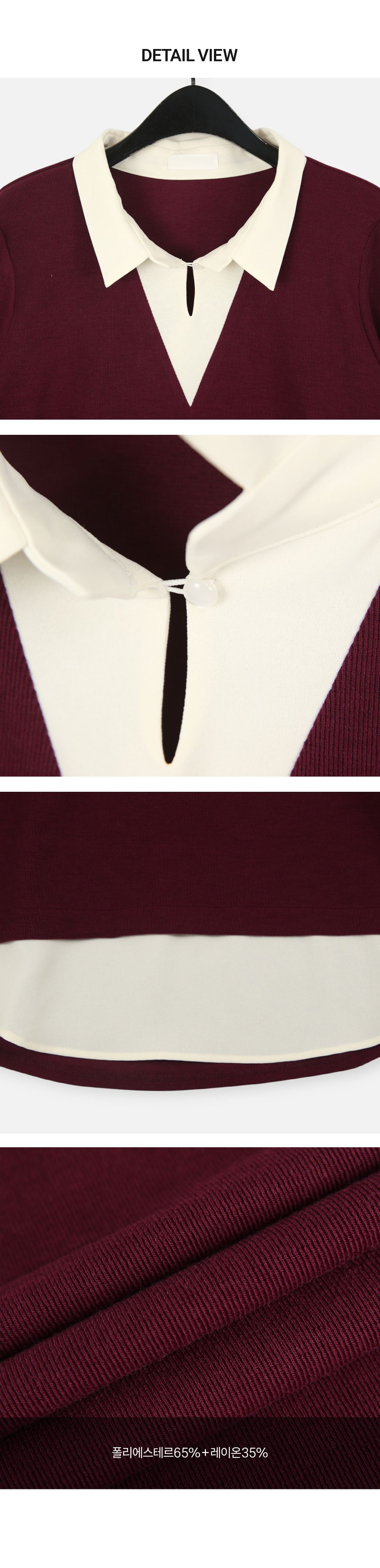 假兩件拼接更有層次感/長版遮住肉肉臀部/兩種尺寸可選-休閒居家簡約百搭單釦假兩件素面V領寬鬆圓弧下襬長版長袖上衣深藍色酒紅色