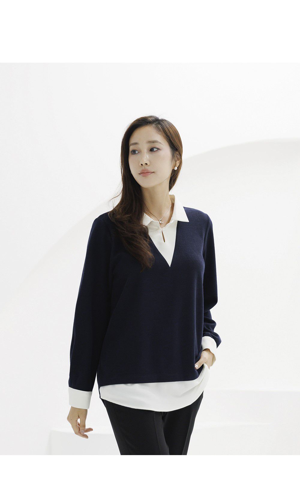 【C55720】韓國DED 單釦假兩件上衣-寬鬆圓弧下襬素面V領長版長袖