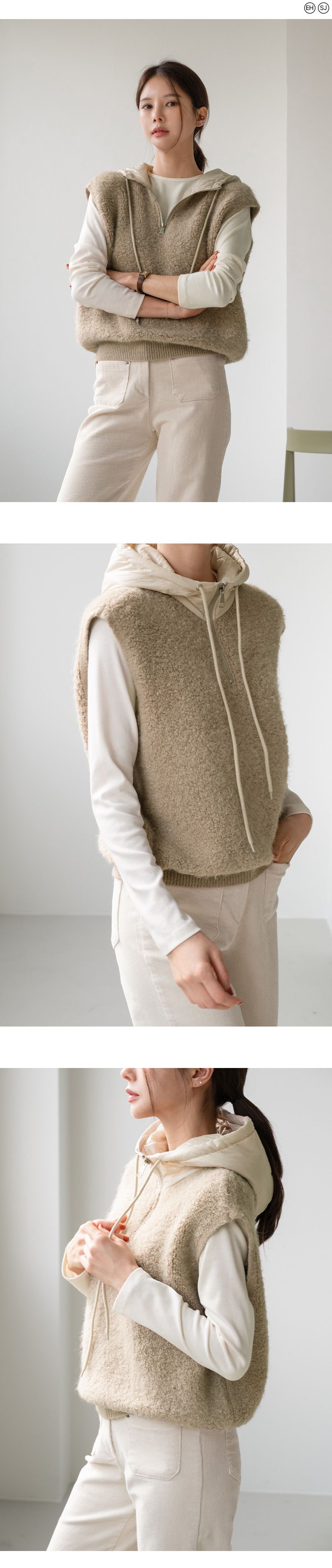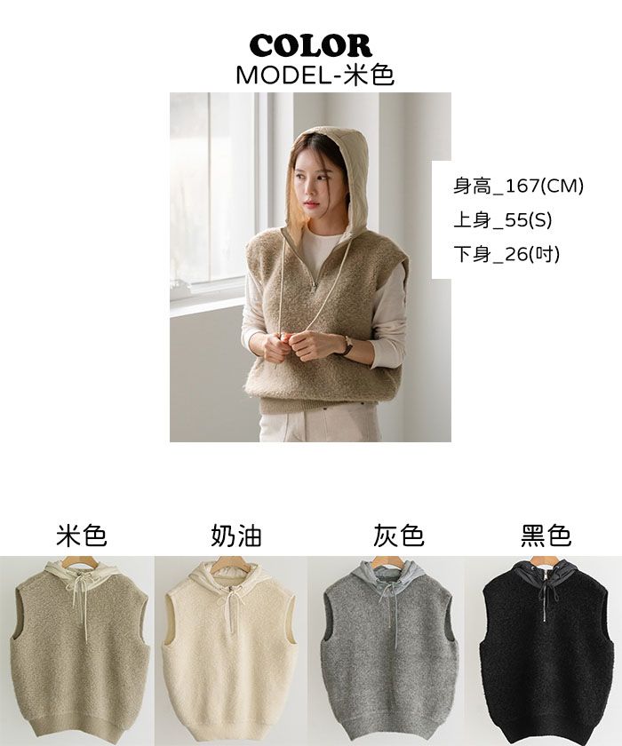 【C55722】韓國CAN 混羊毛拼接上衣-半開襟拉鍊抽繩無袖素面連帽帽T