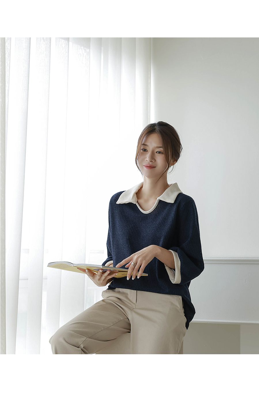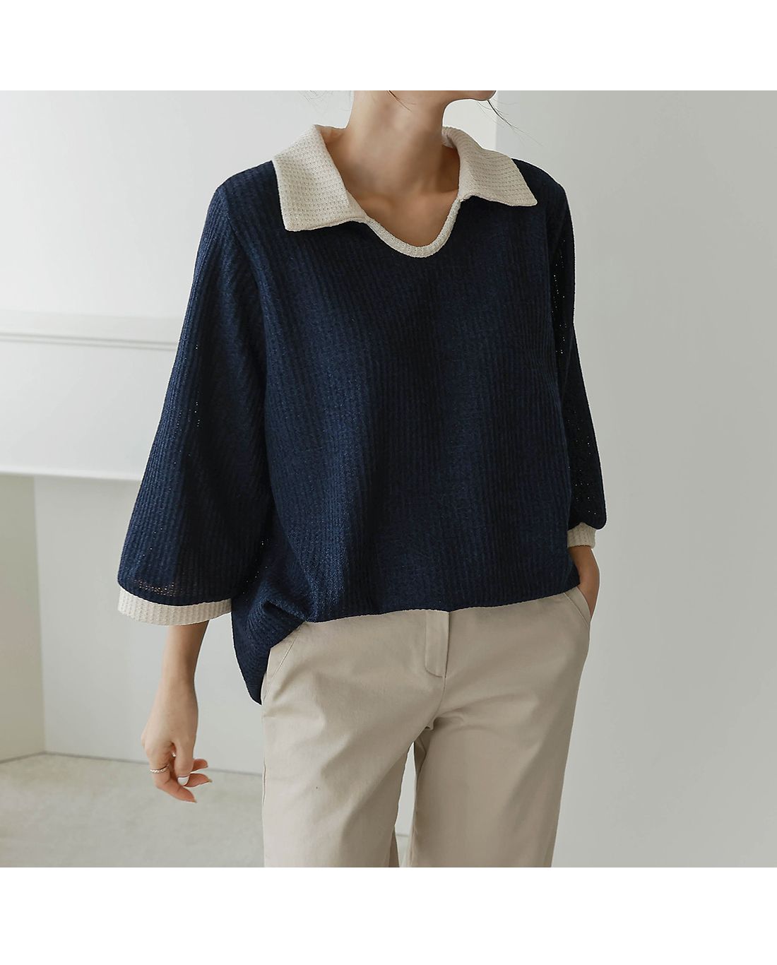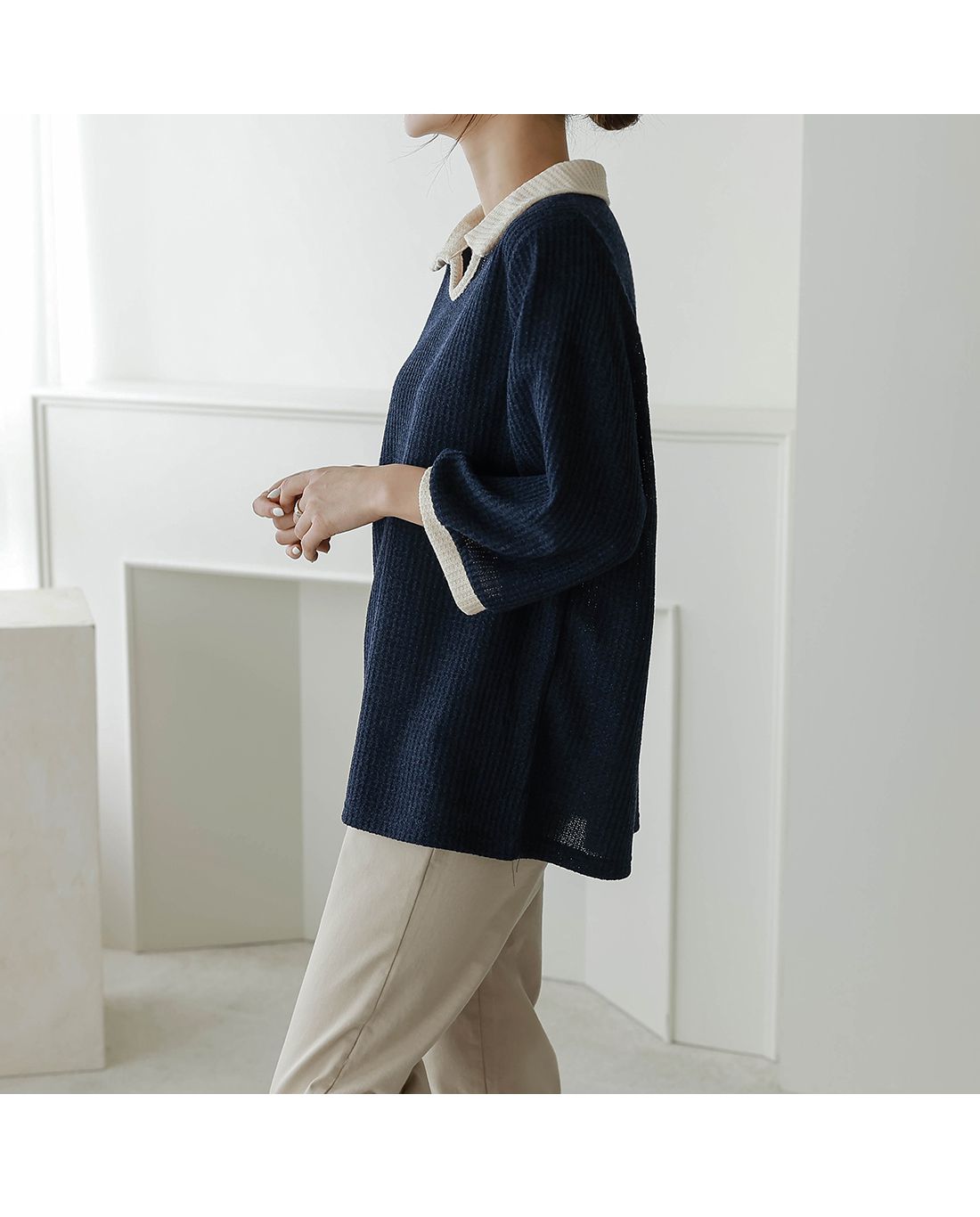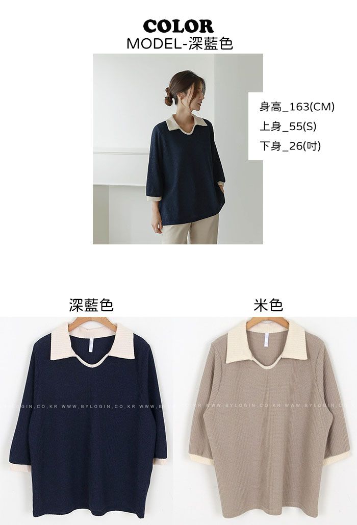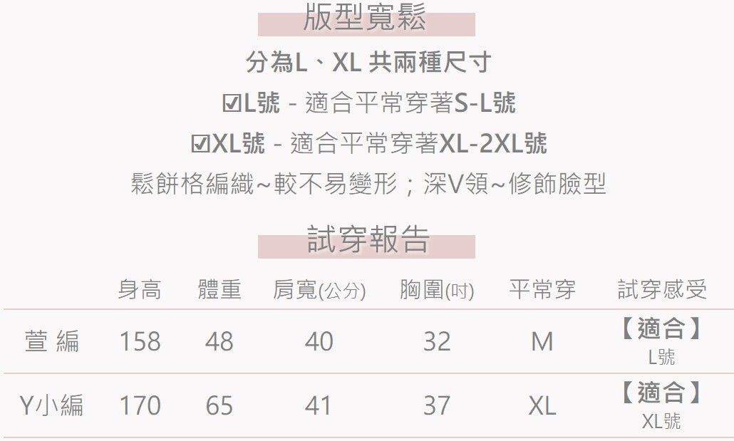兩種尺寸/寬袖/拼色V領/撞色滾邊/寬鬆長版/鬆餅格編織 - 休閒居家簡約百搭素面鬆餅格針織上衣針織衫七分袖上衣寬鬆大尺碼上衣長版上衣多尺寸LXL深藍色米色