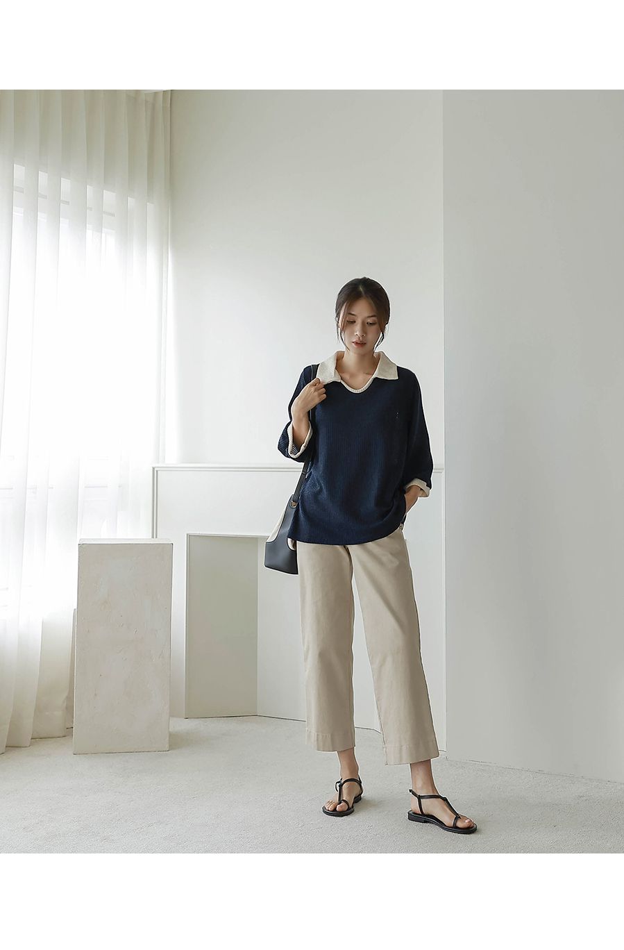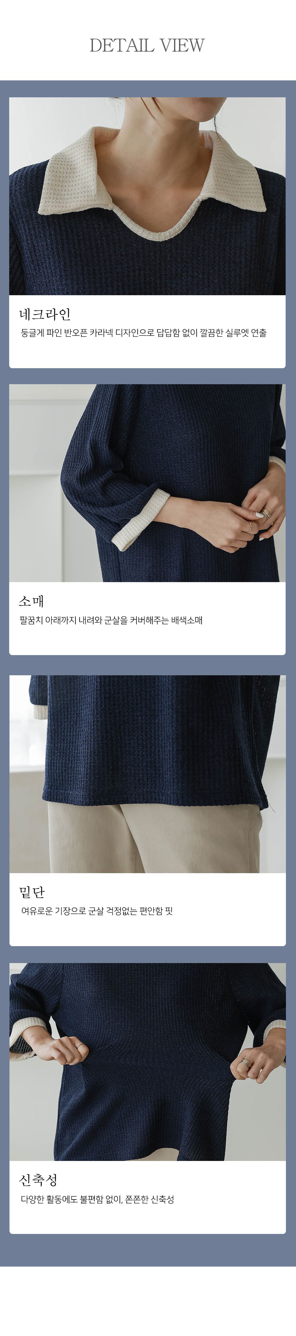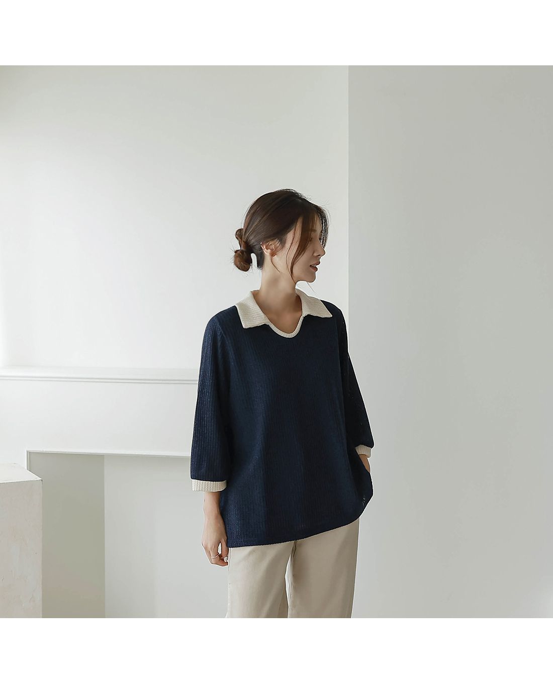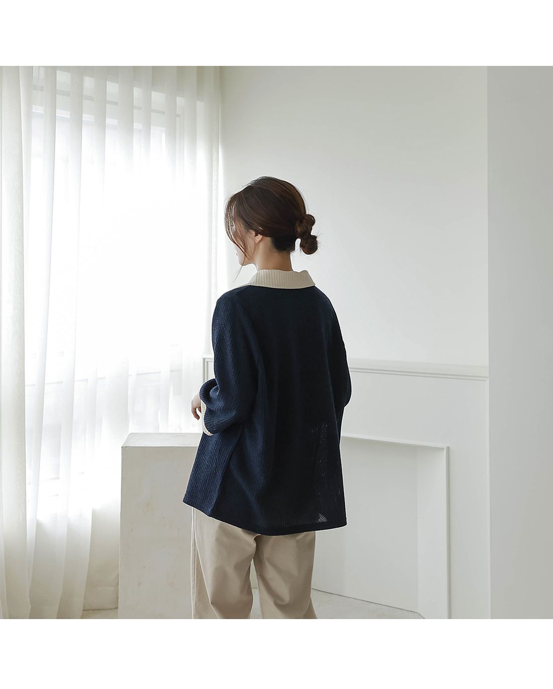 兩種尺寸/寬袖/拼色V領/撞色滾邊/寬鬆長版/鬆餅格編織 - 休閒居家簡約百搭素面鬆餅格針織上衣針織衫七分袖上衣寬鬆大尺碼上衣長版上衣多尺寸LXL深藍色米色
