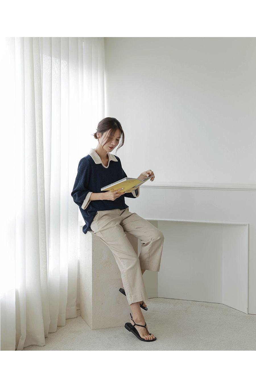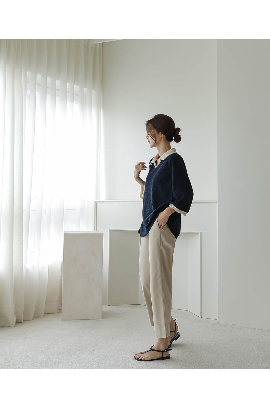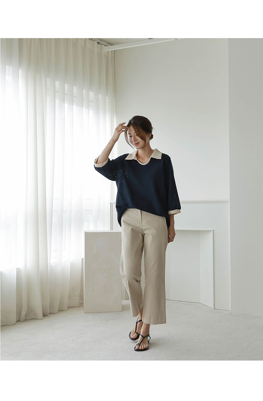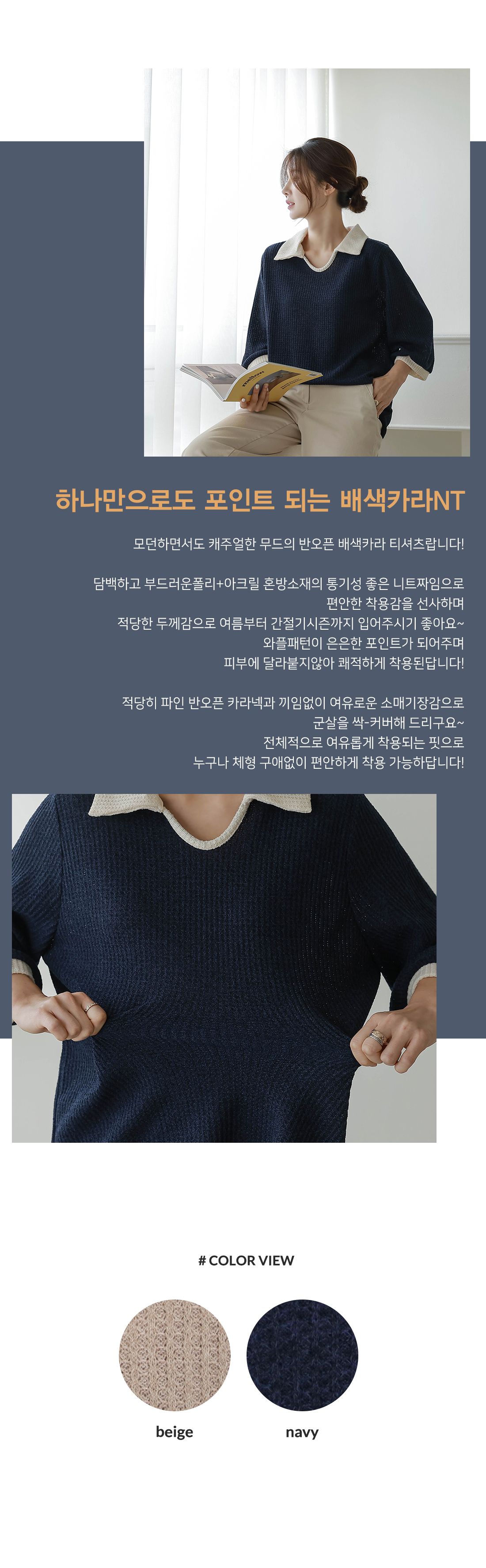 兩種尺寸/寬袖/拼色V領/撞色滾邊/寬鬆長版/鬆餅格編織 - 休閒居家簡約百搭素面鬆餅格針織上衣針織衫七分袖上衣寬鬆大尺碼上衣長版上衣多尺寸LXL深藍色米色