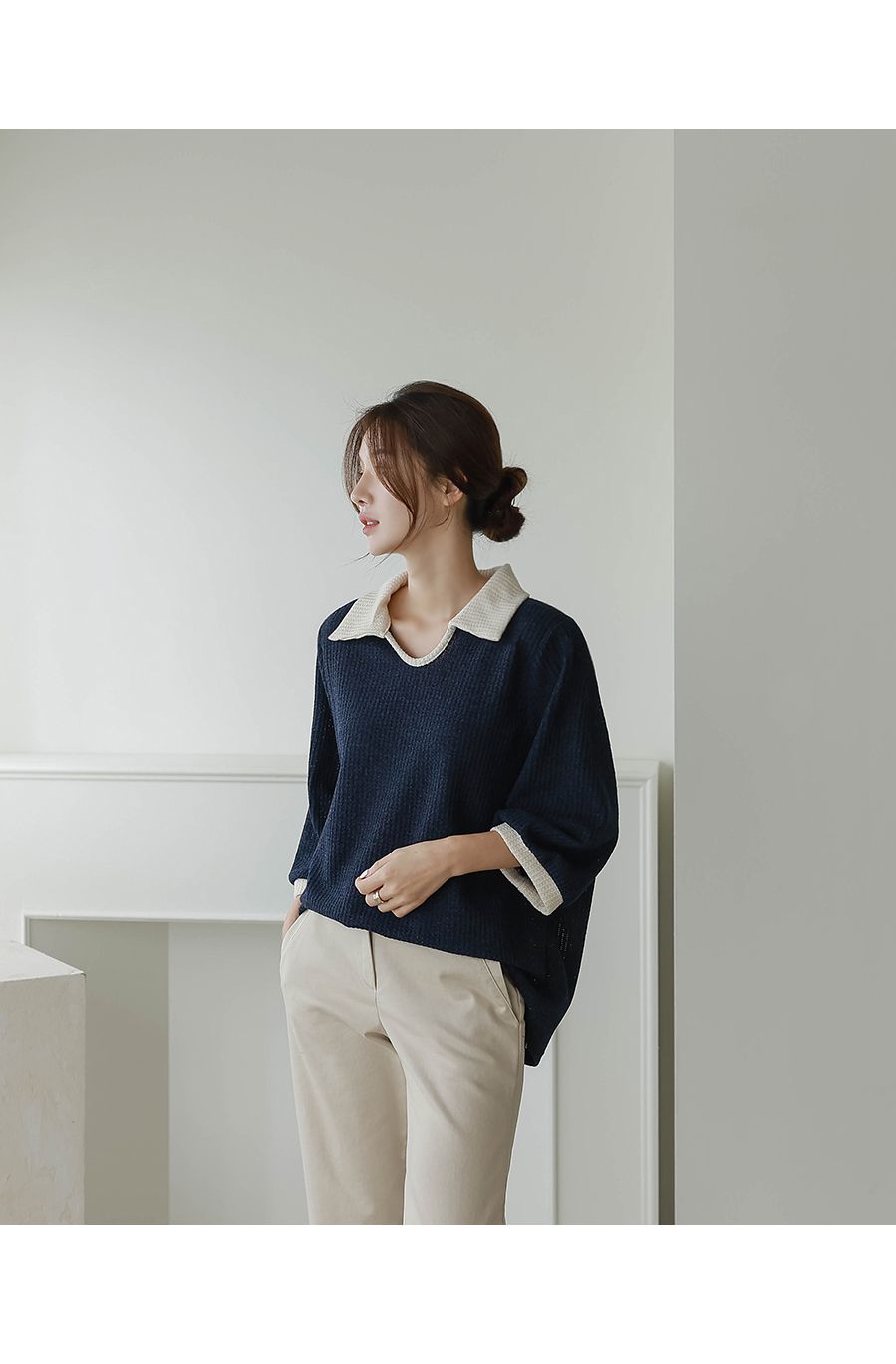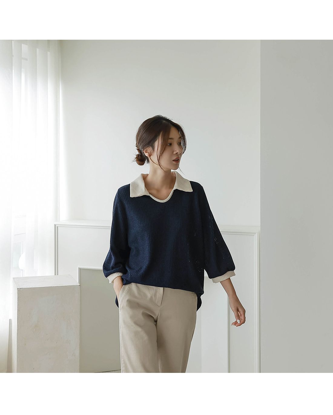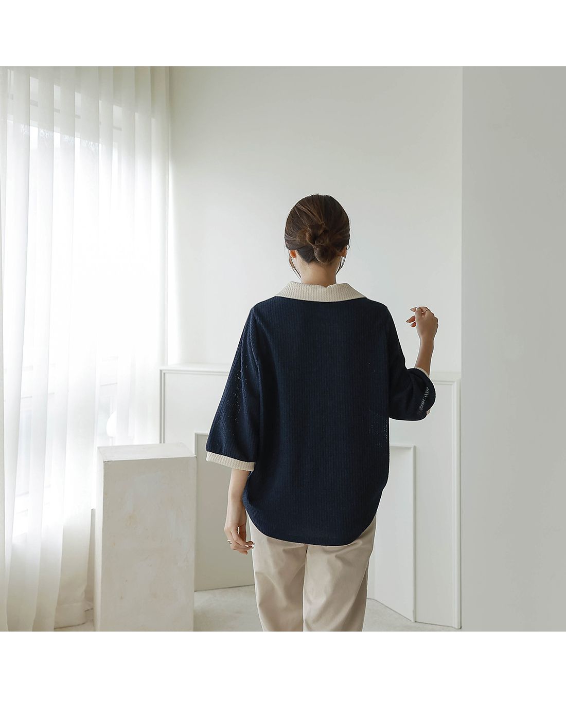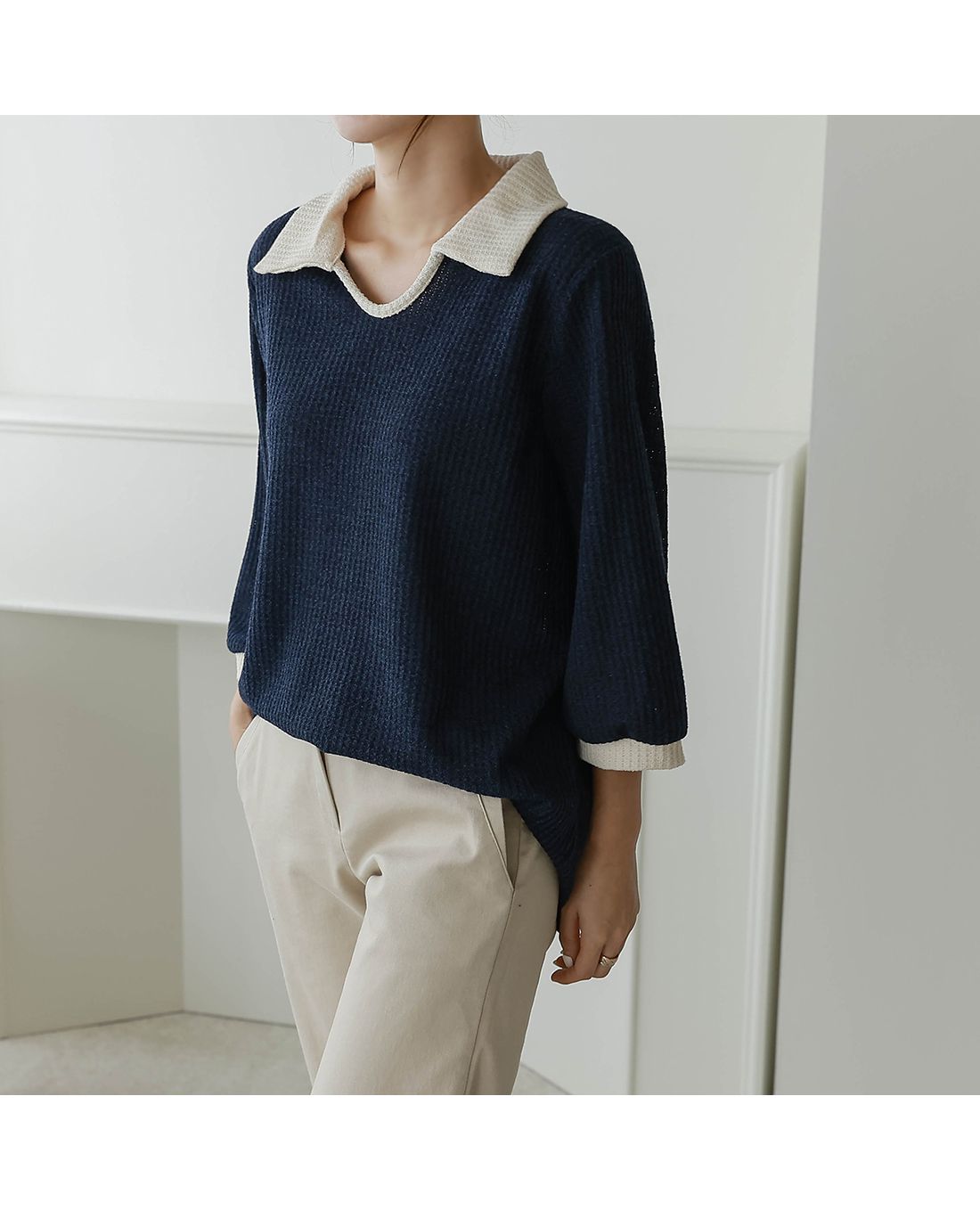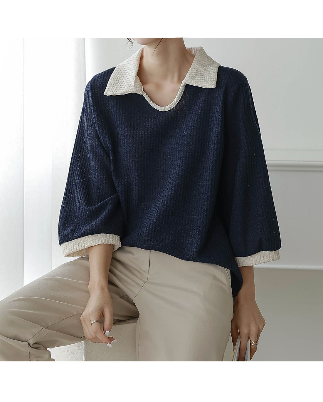 【C55734】韓國BLG 鬆餅格針織上衣-寬袖拼色V領寬鬆長版七分袖上衣