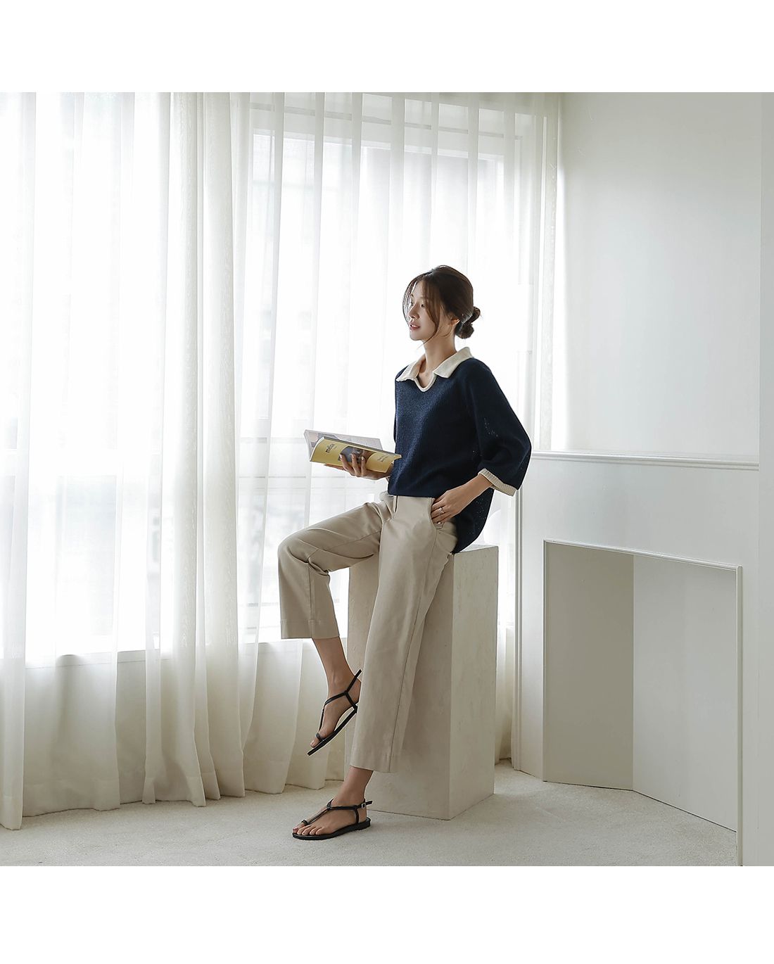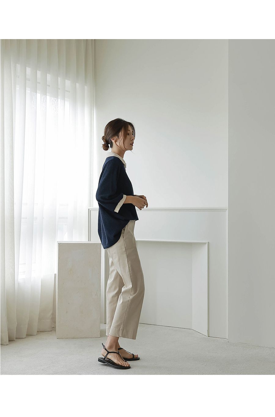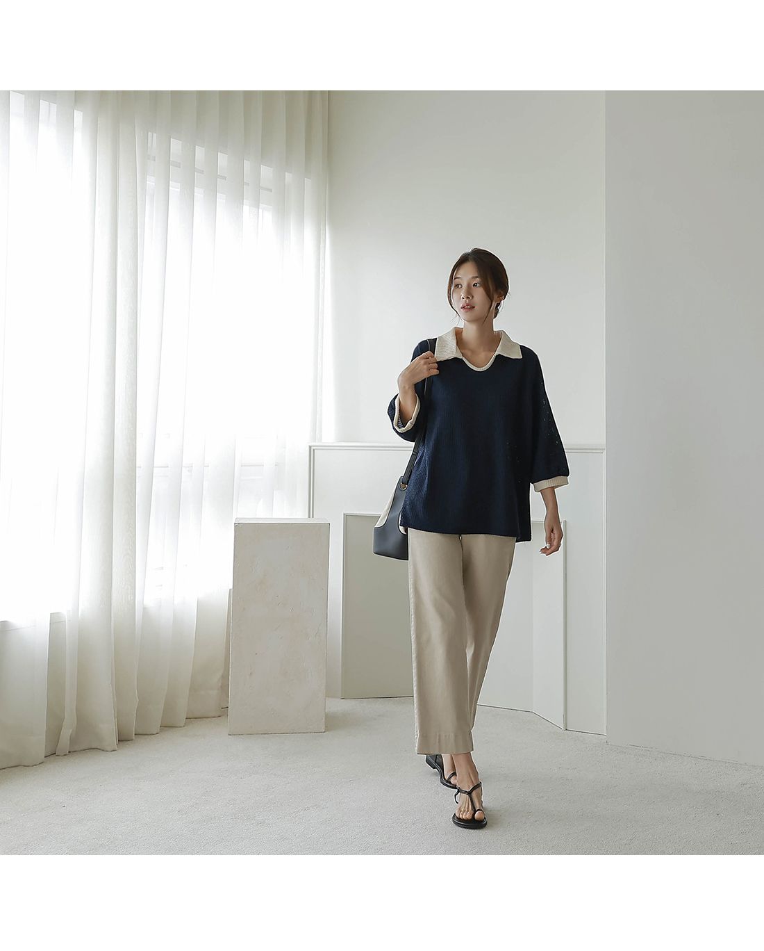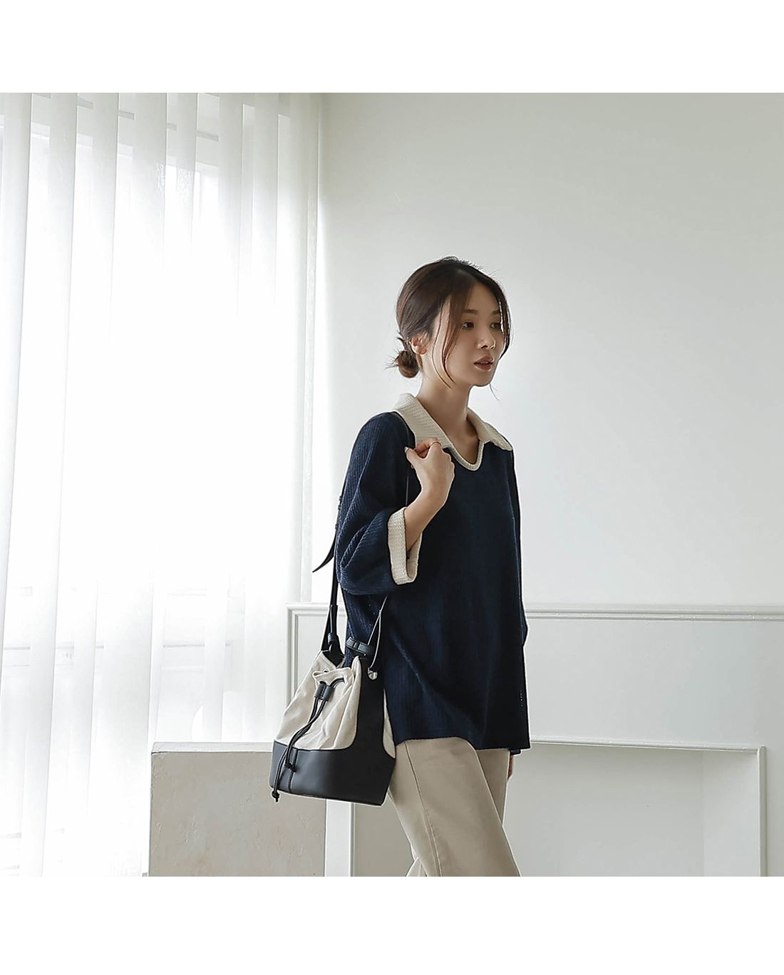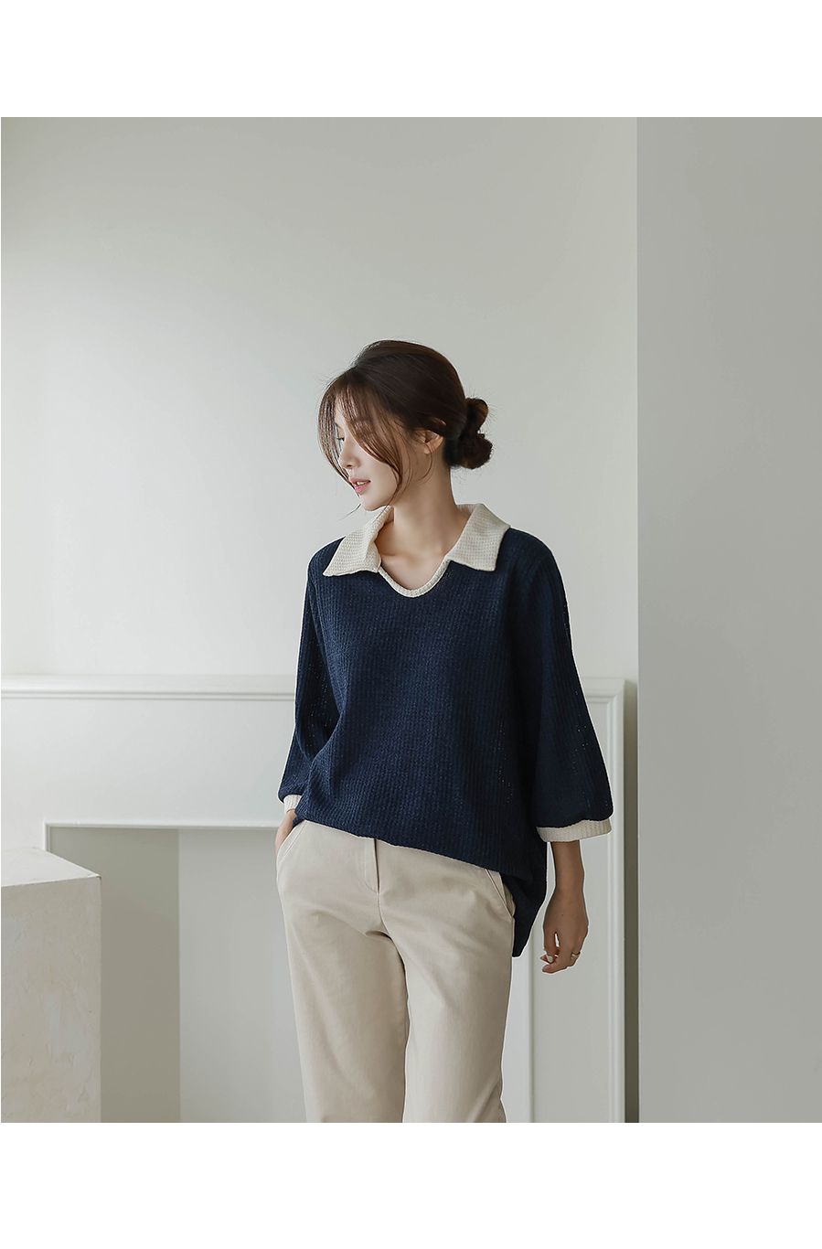 【C55734】韓國BLG 鬆餅格針織上衣-寬袖拼色V領寬鬆長版七分袖上衣