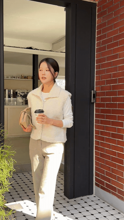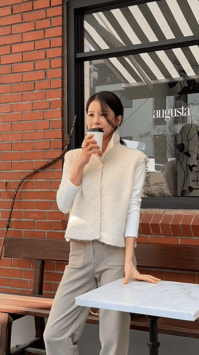 【C55740】韓國CAN 高領混羊毛背心-絨毛開襟排釦素面寬肩無袖外套★★