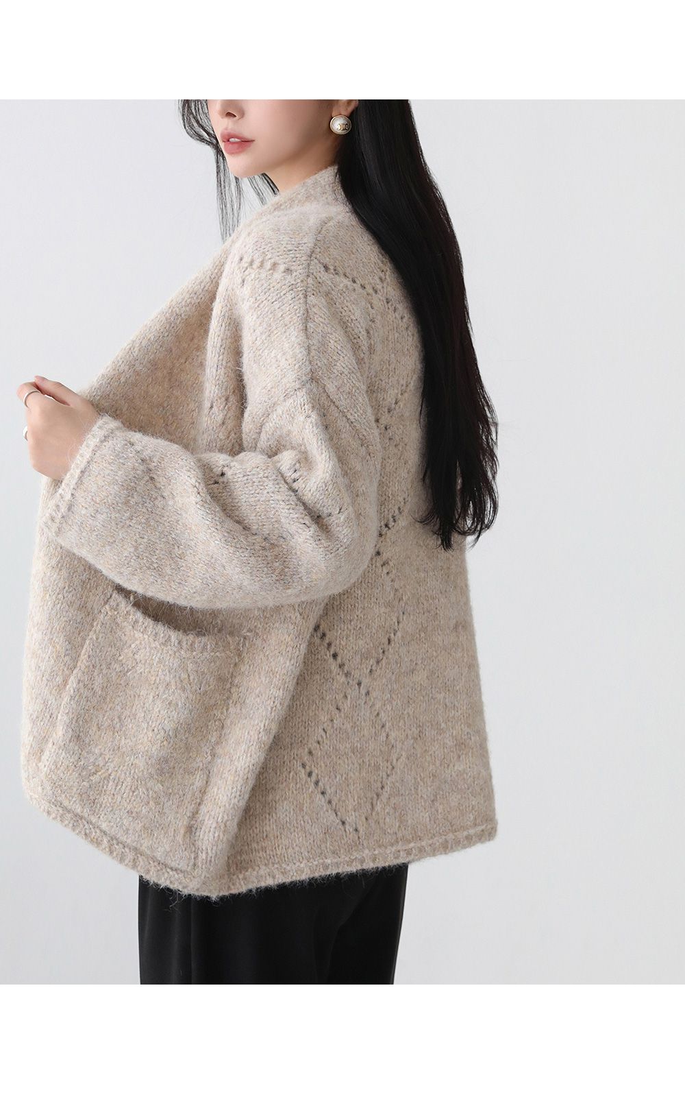寬袖修飾掰掰手/針織混羊毛好保暖/洞洞鏤空造型更吸睛-休閒居家簡約百搭針織無釦開襟鏤空編織寬鬆混羊毛素面長袖外套灰色米色粉色棕色