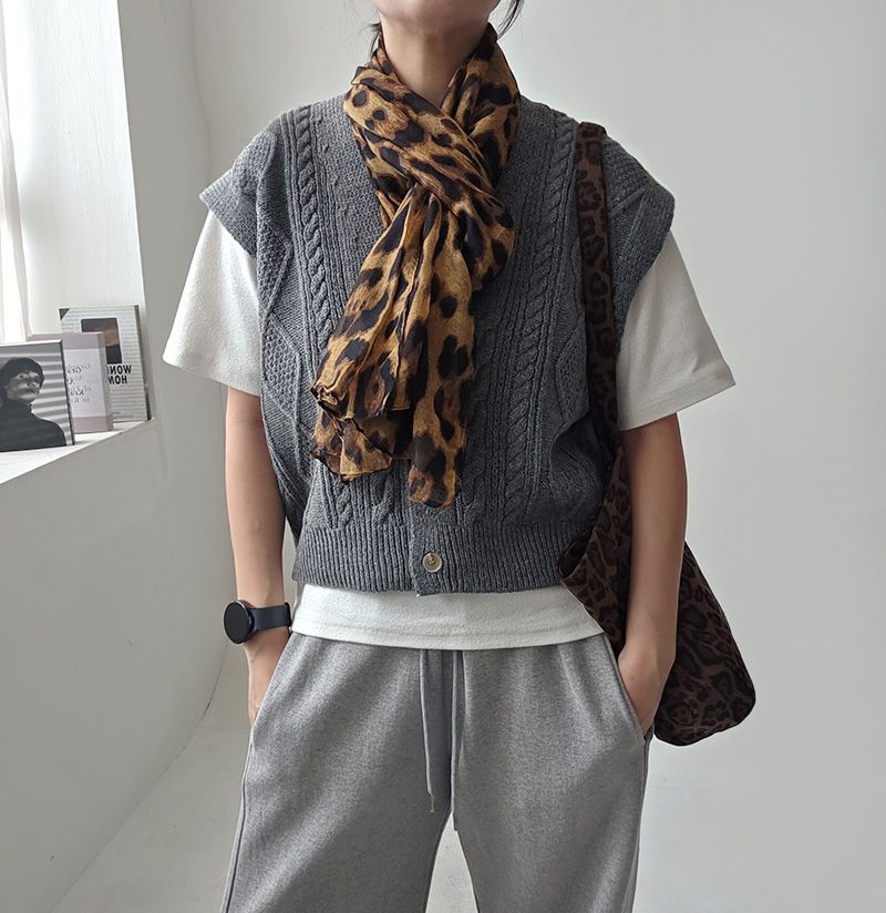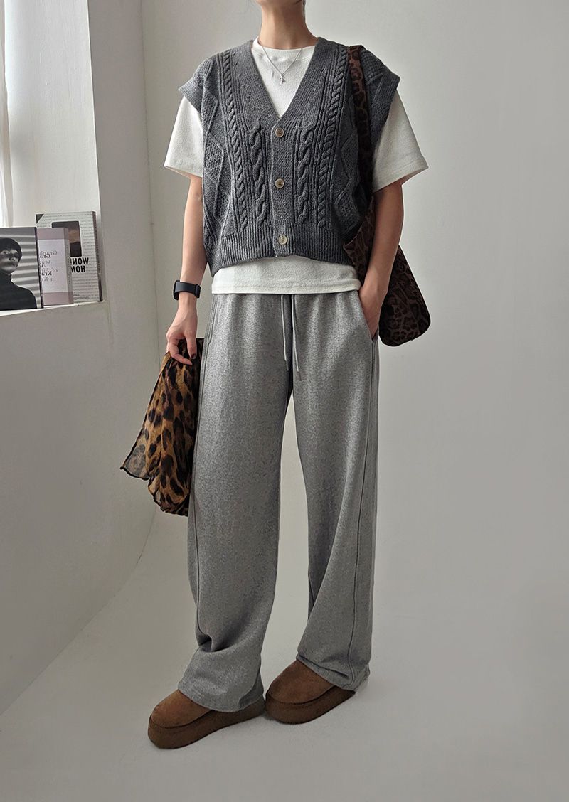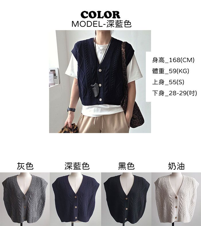 短版拉長下半身比例/開襟排釦好穿脫/簡約基本秋冬單品-休閒居家簡約百搭麻花針織短版素面深V領混羊毛開襟排釦無袖背心外套灰色深藍色黑色奶油色