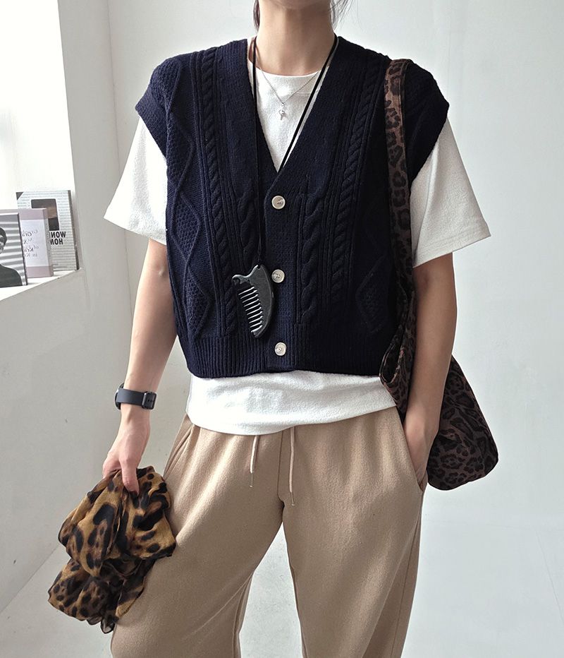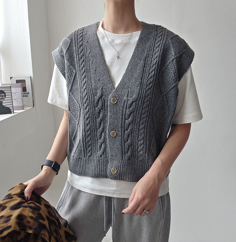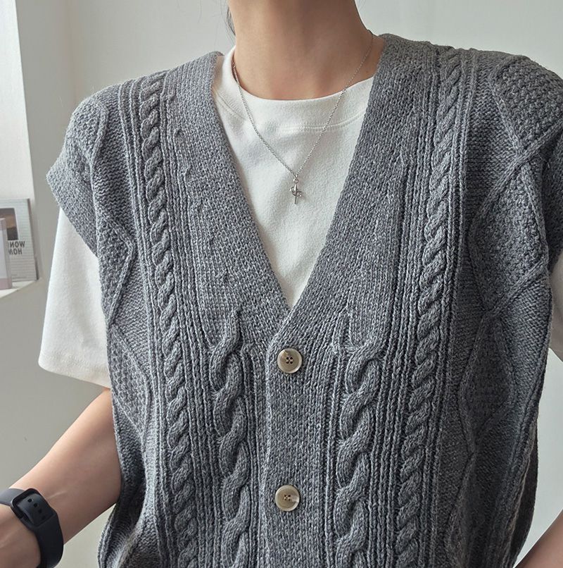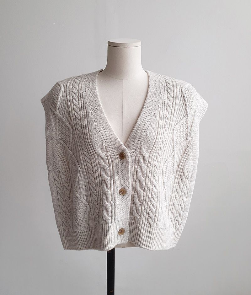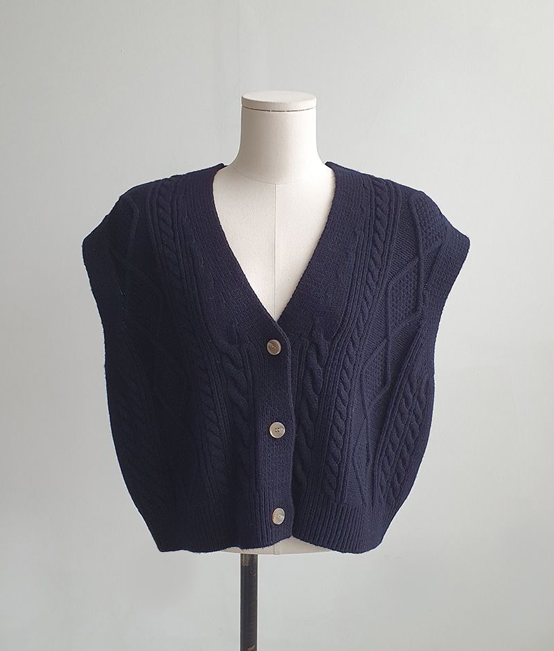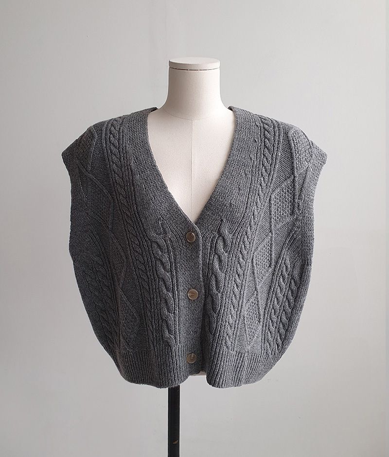 【C55744】韓國WTM 麻花針織外套-短版素面深V領混羊毛排釦無袖背心