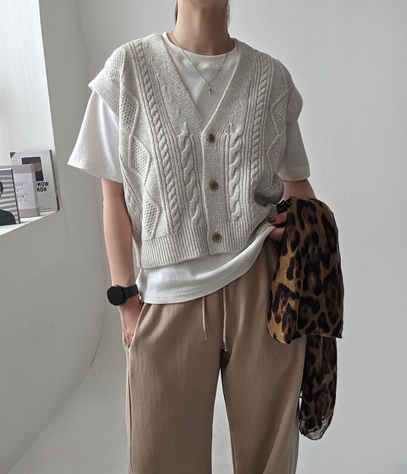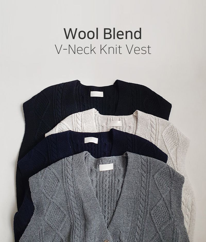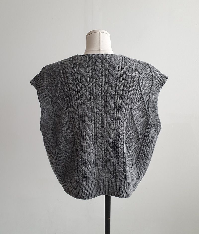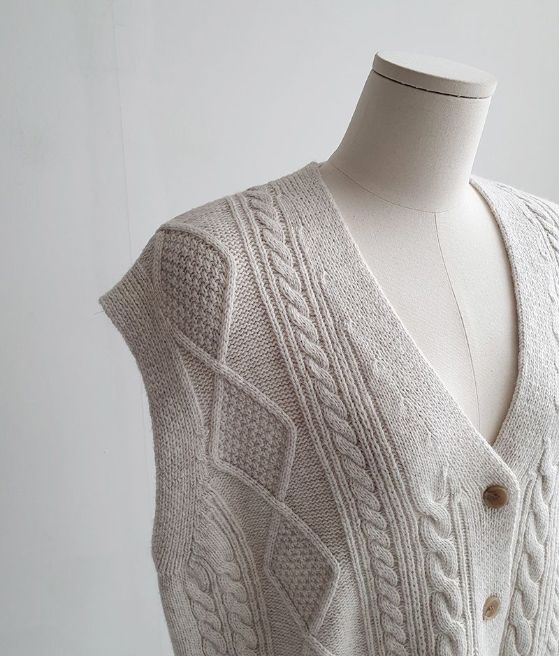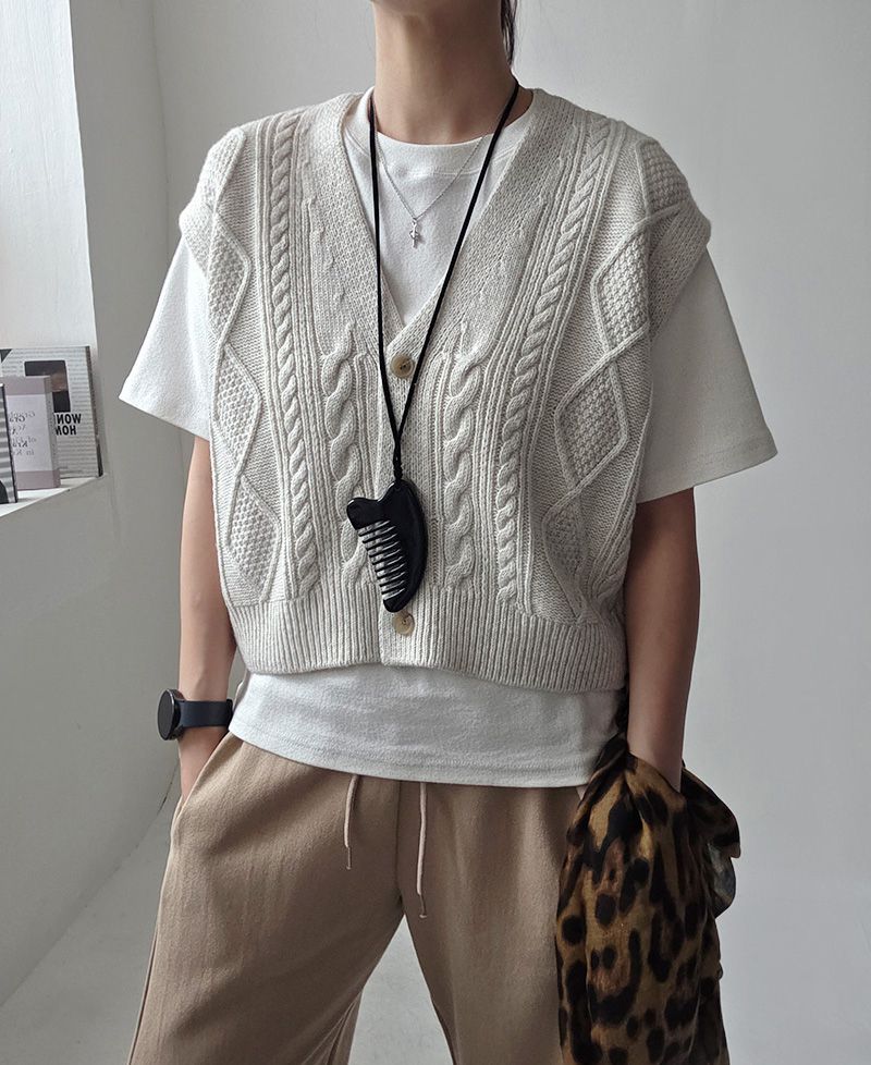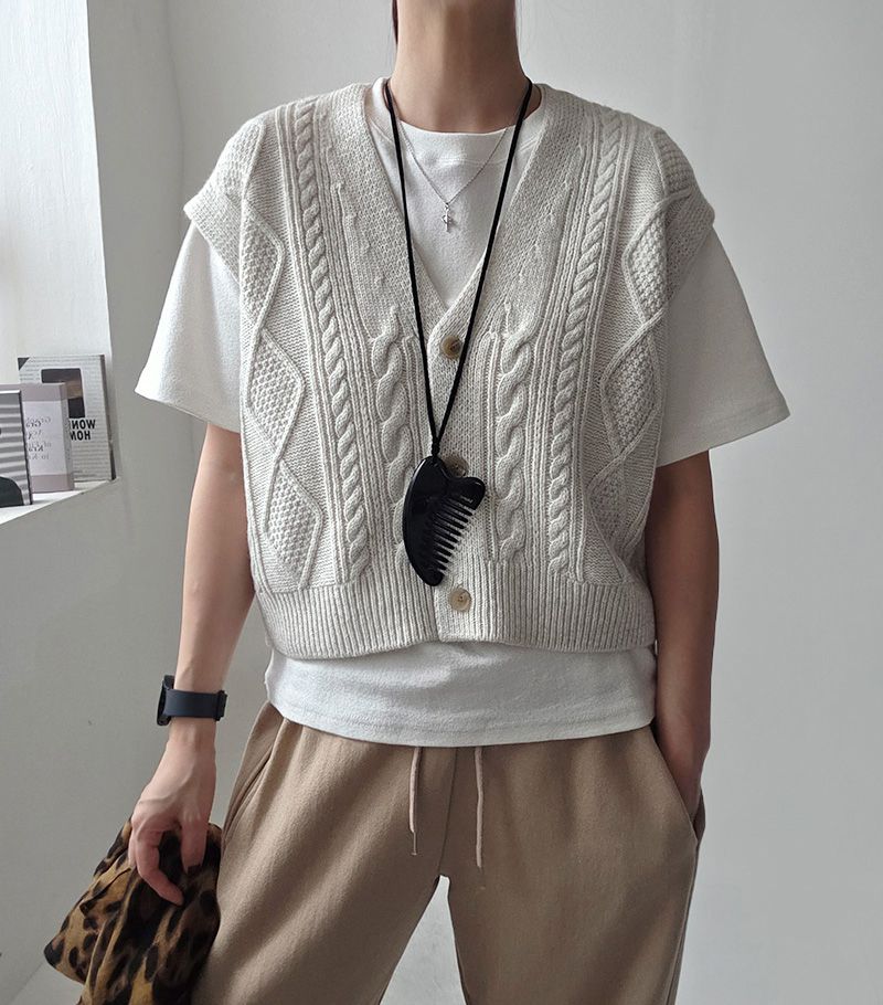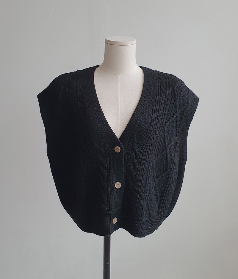 【C55744】韓國WTM 麻花針織外套-短版素面深V領混羊毛排釦無袖背心