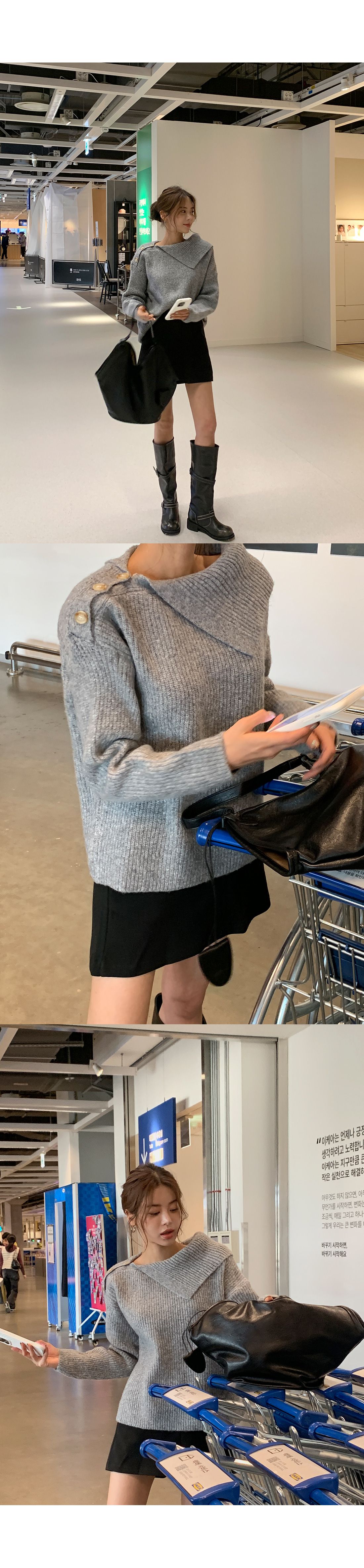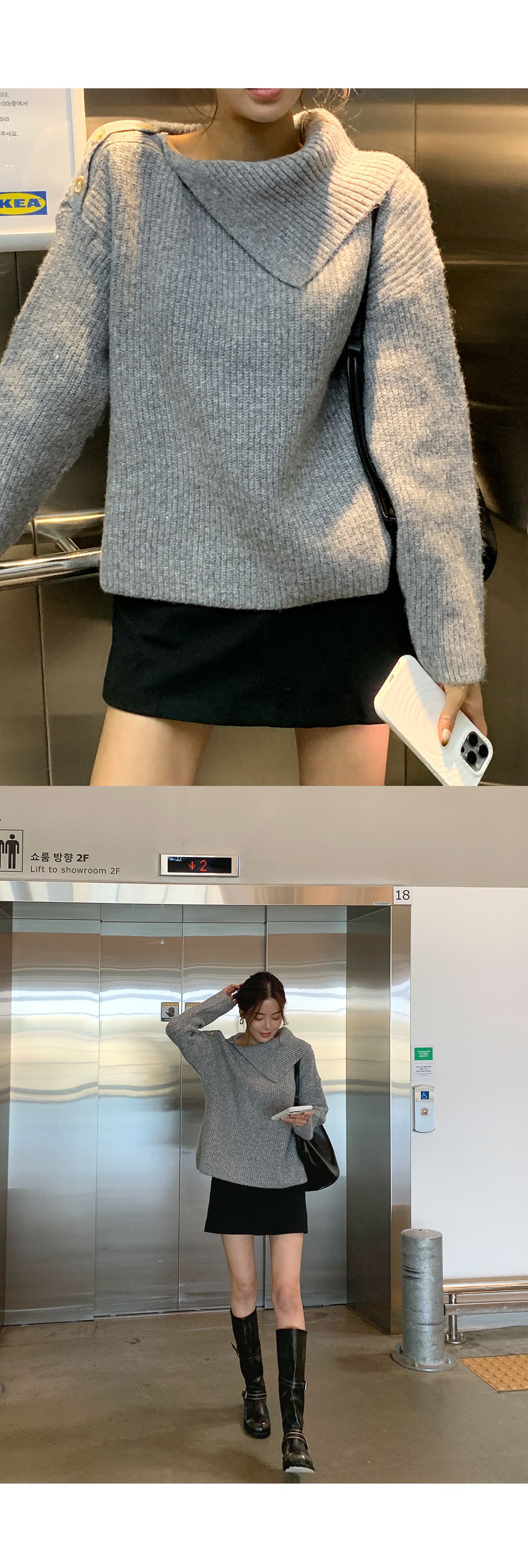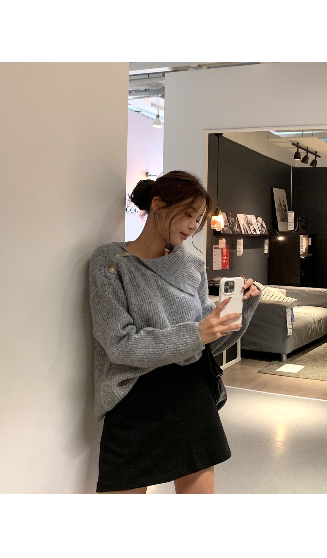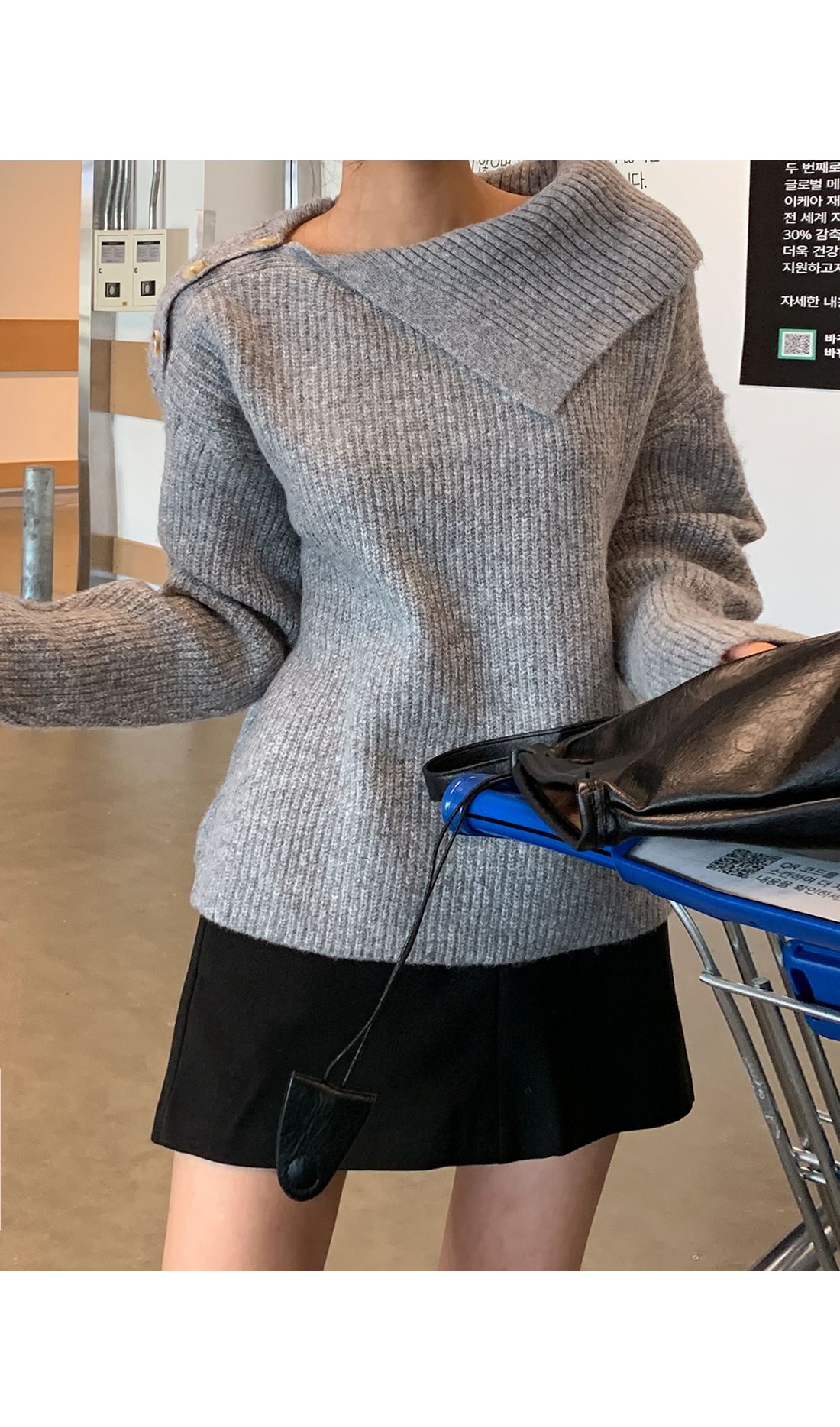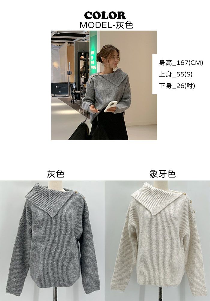 【C55746】韓國TMO 斜邊翻領針織衫-不對稱大領片素面排釦肩長袖上衣