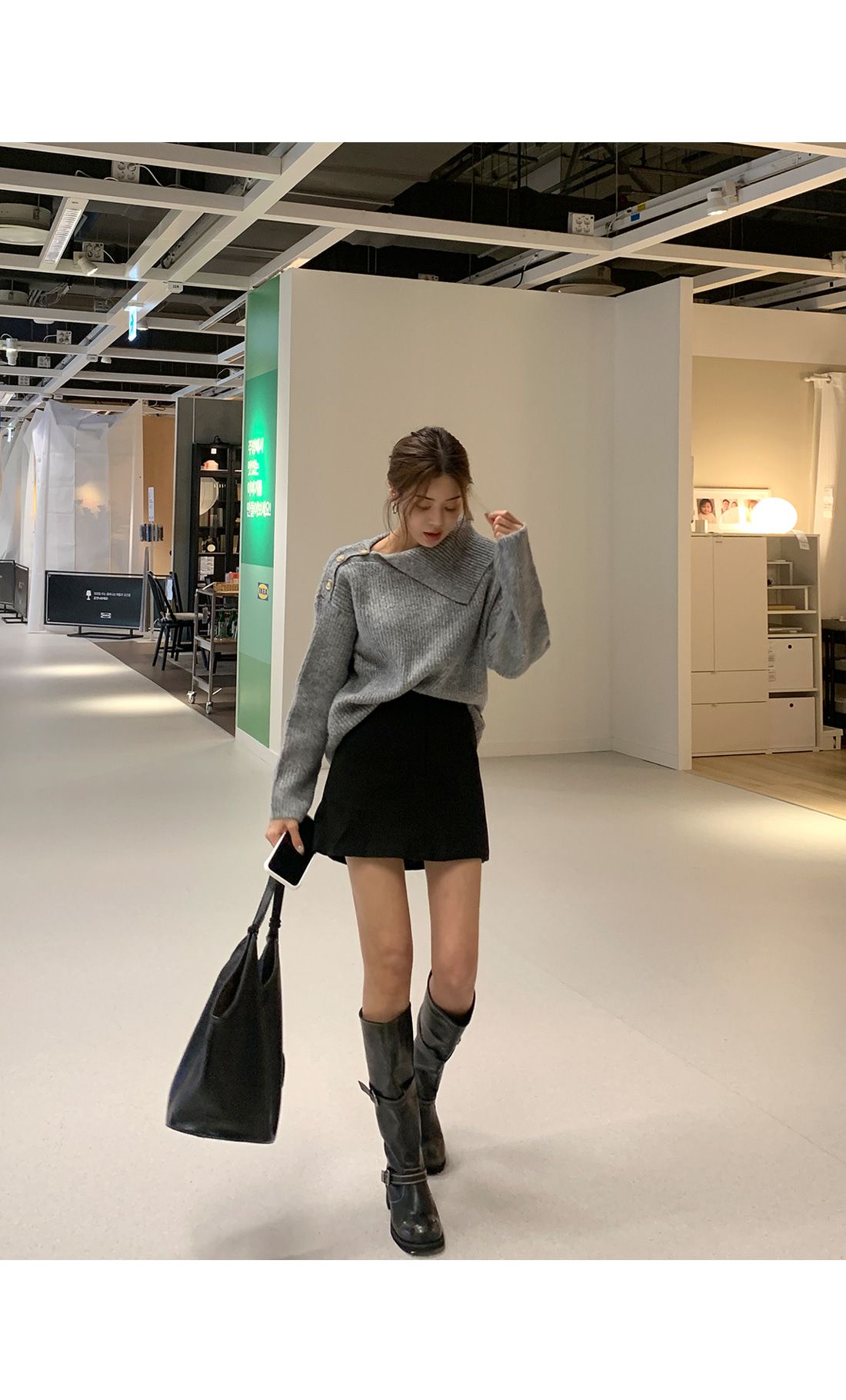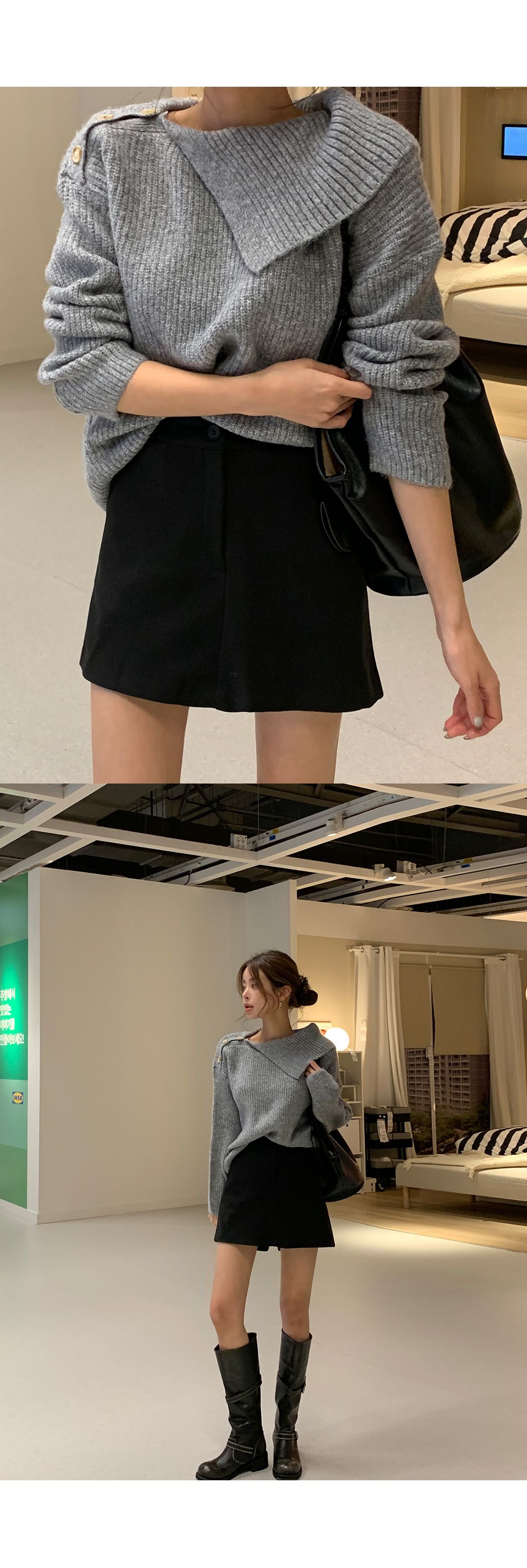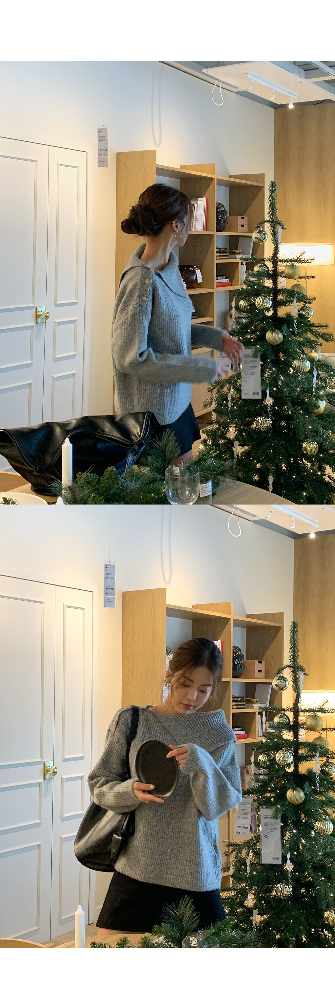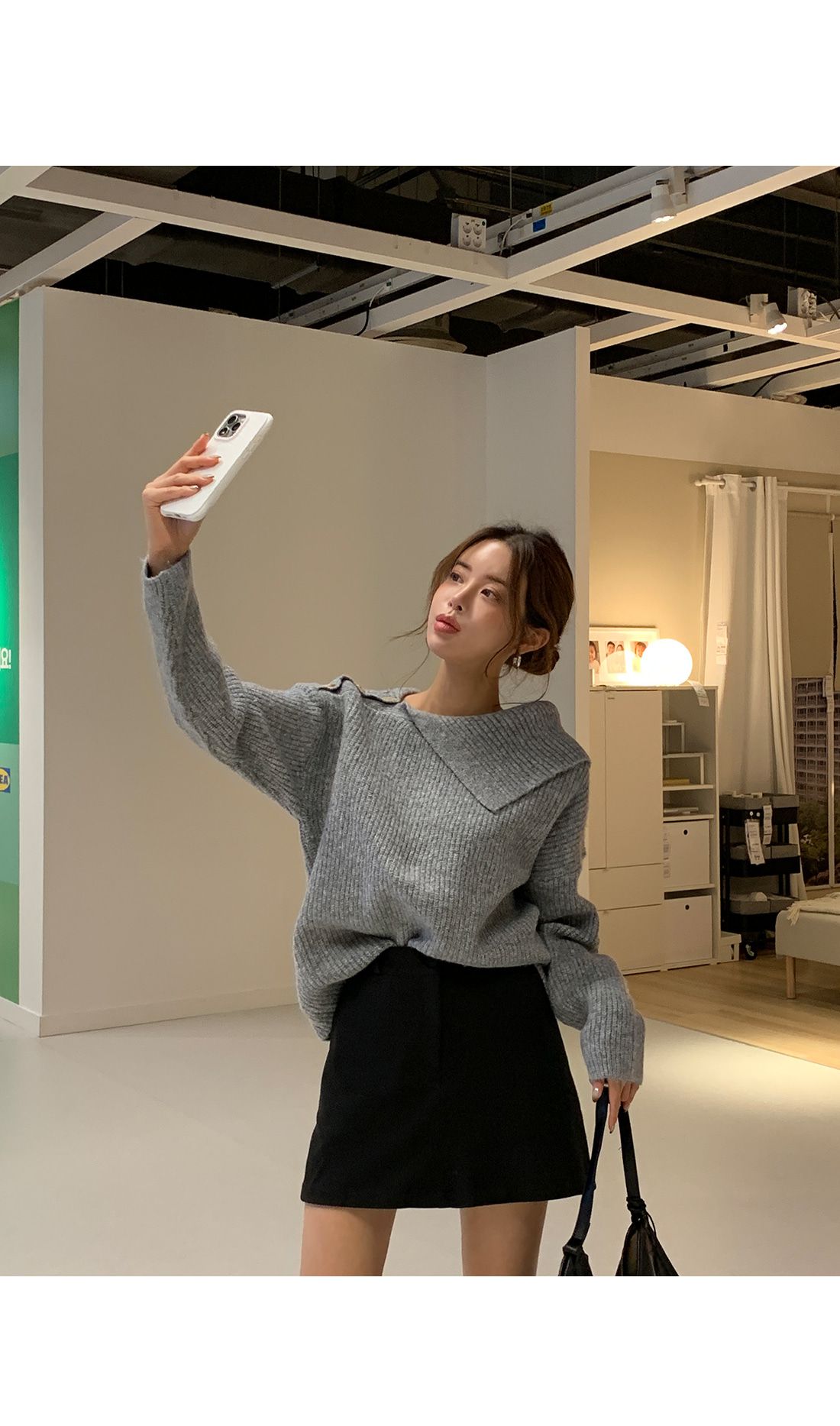 【C55746】韓國TMO 斜邊翻領針織衫-不對稱大領片素面排釦肩長袖上衣