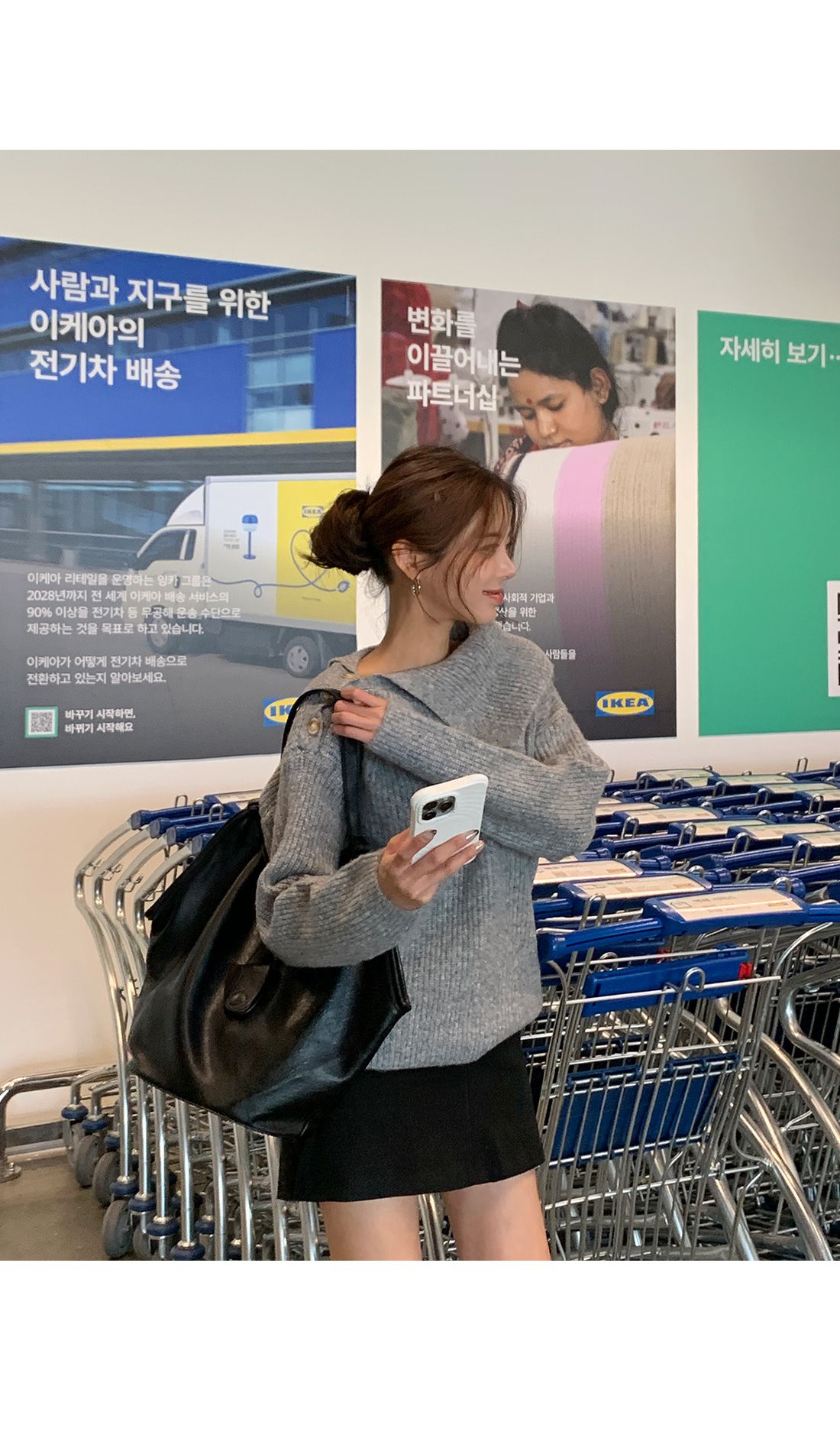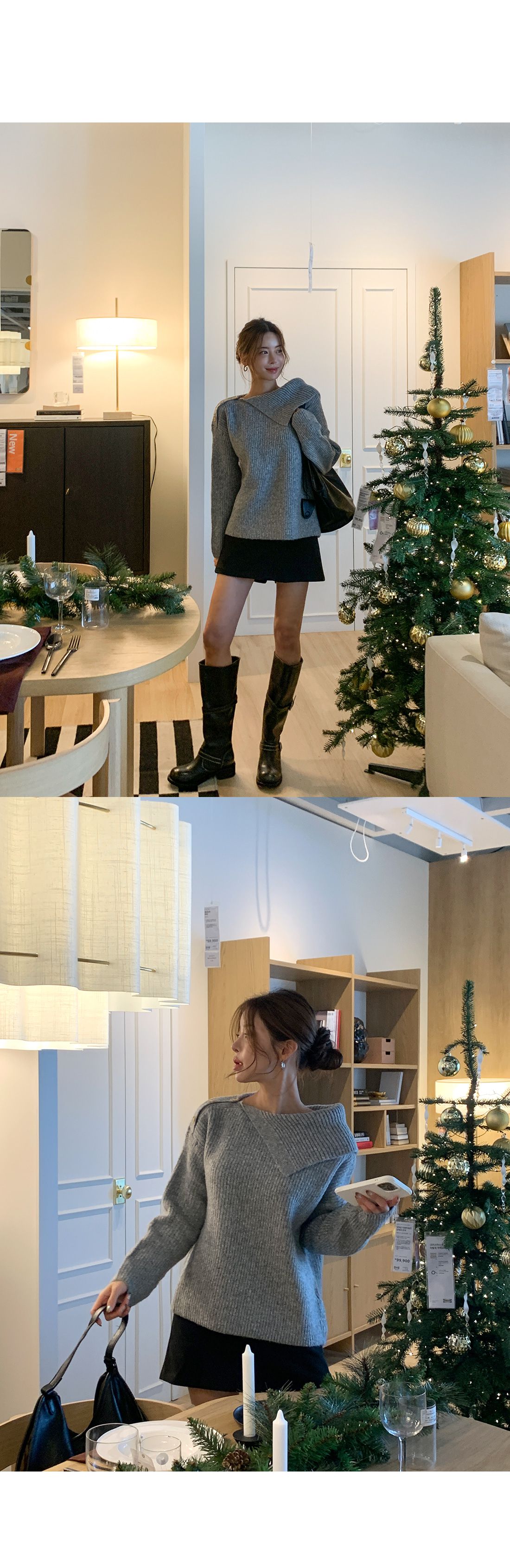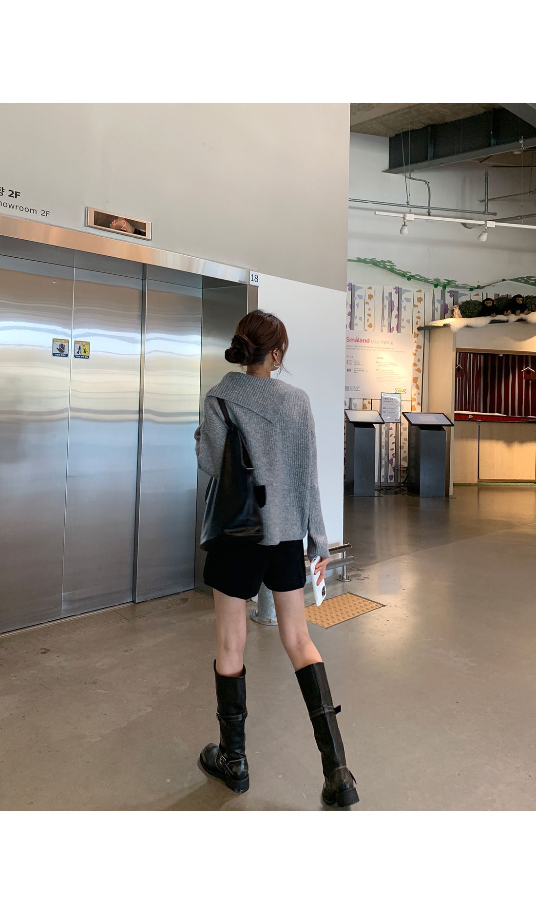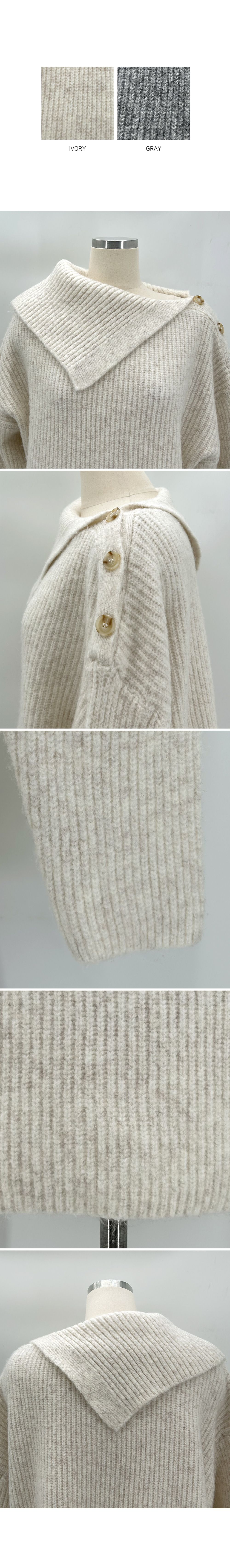 【C55746】韓國TMO 斜邊翻領針織衫-不對稱大領片素面排釦肩長袖上衣