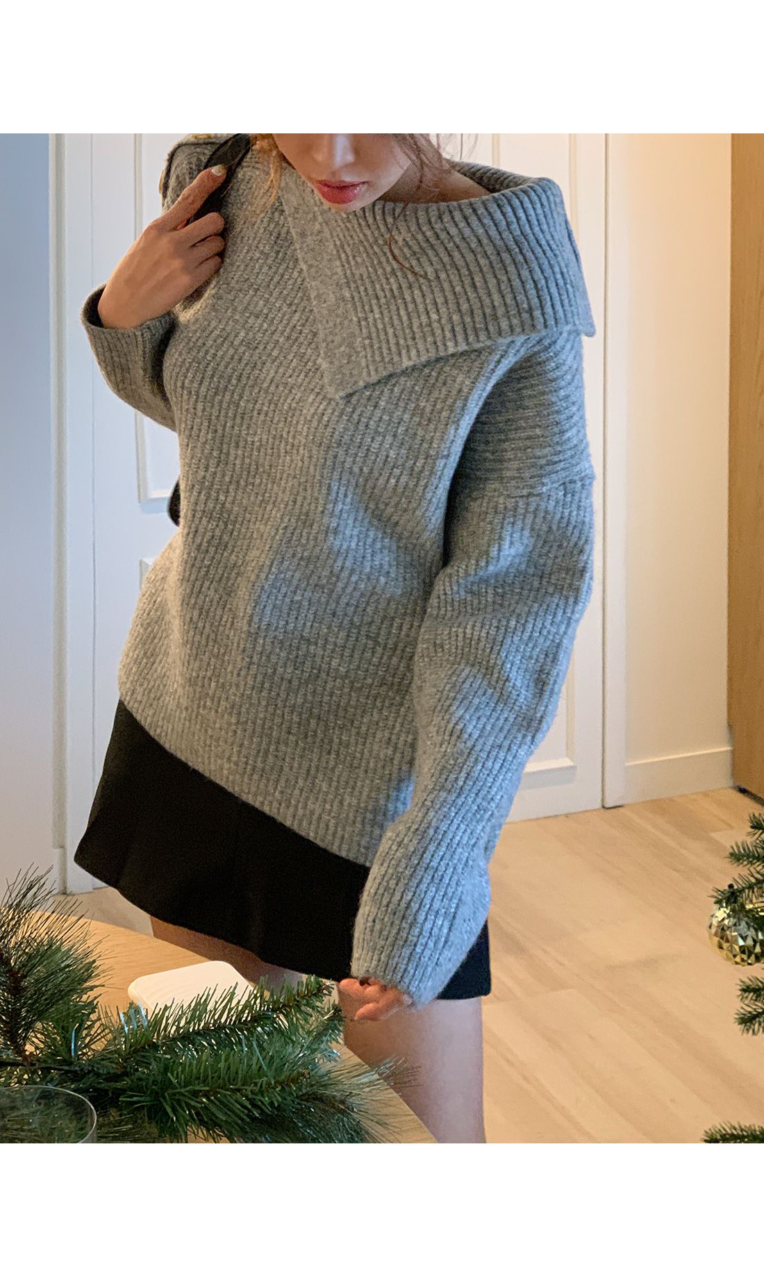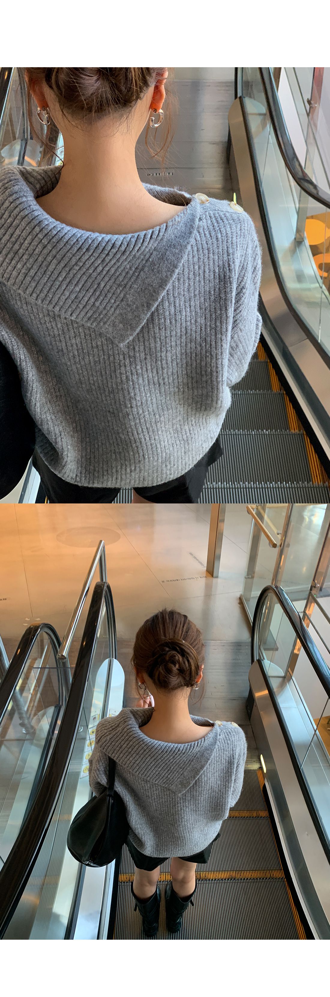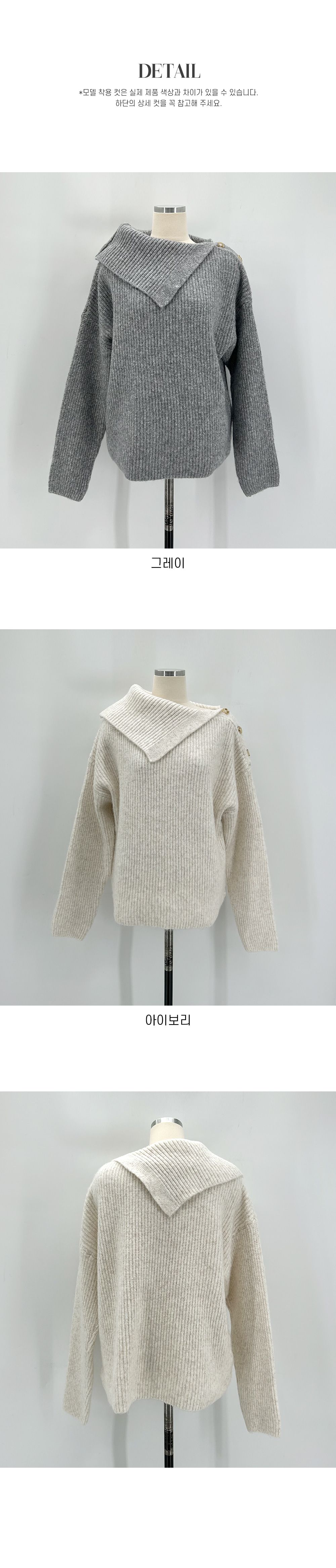 不規則領片/單側肩排釦造型(可開) - 休閒居家渡假婚禮簡約百搭素面斜邊翻領針織衫針織上衣不對稱大領片排釦肩長袖上衣灰色象牙色