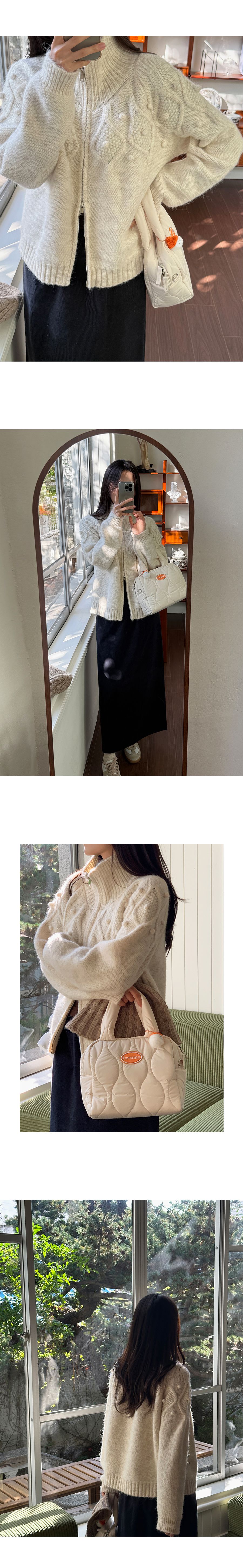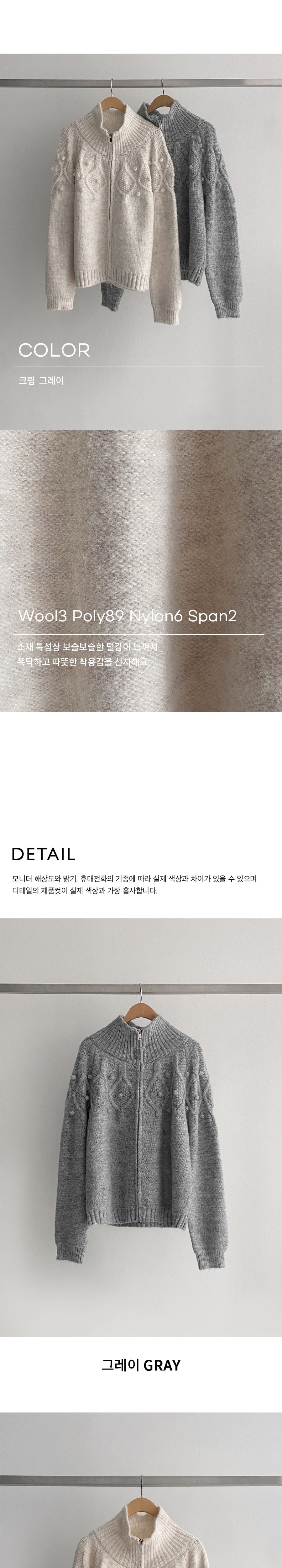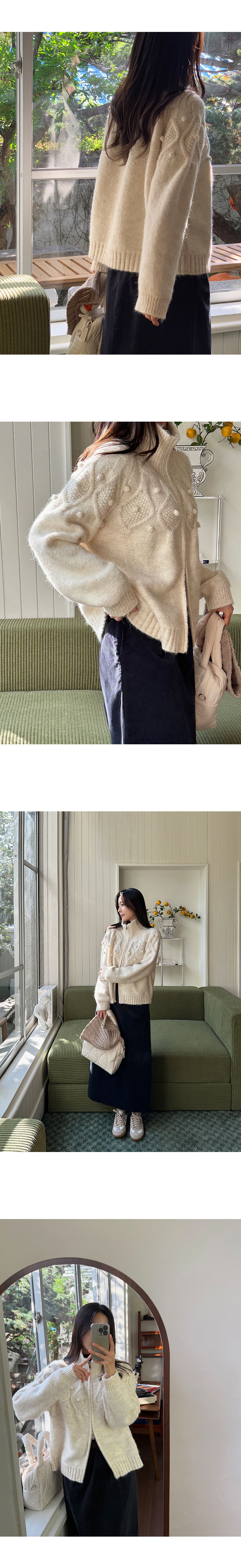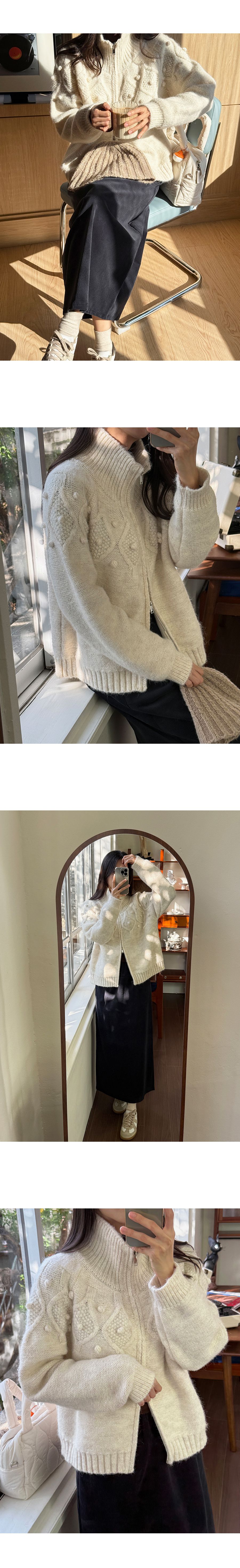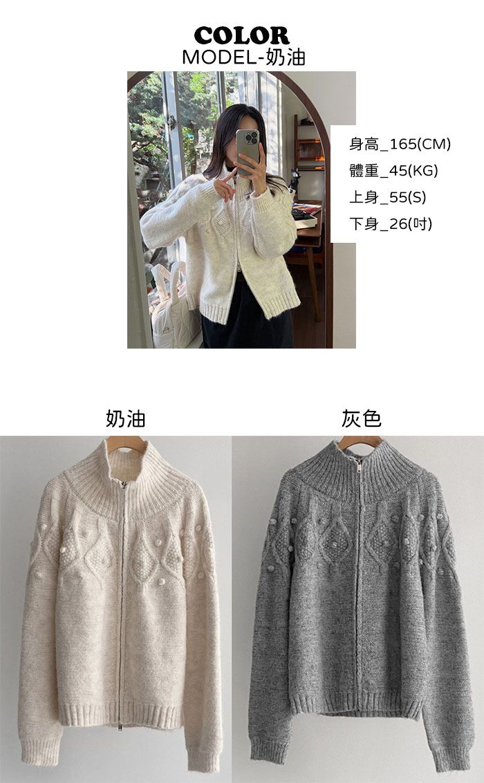 立體麻花編織紋/立體毛球/立領.高領/上下雙開拉鍊/連肩袖/無口袋 - 休閒居家簡約百搭素面毛球針織外套長袖外套拉鍊外套高領外套奶油色灰色