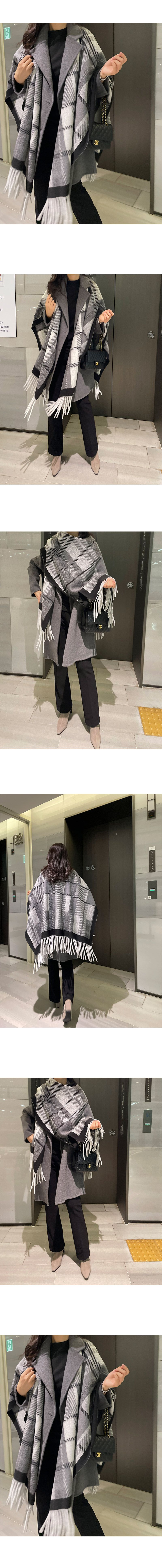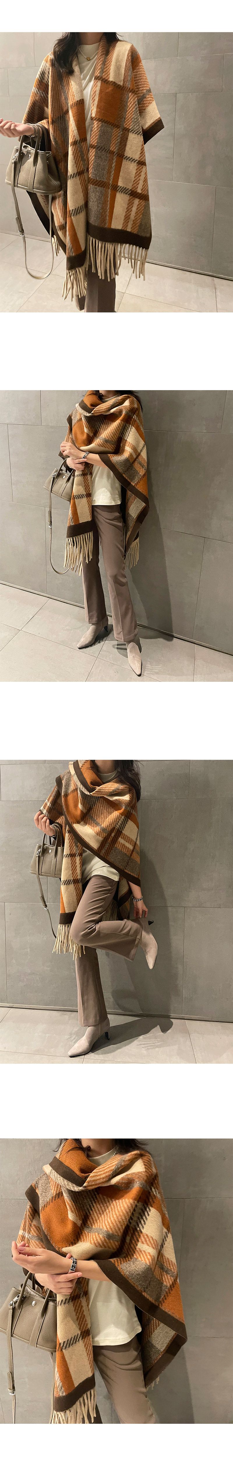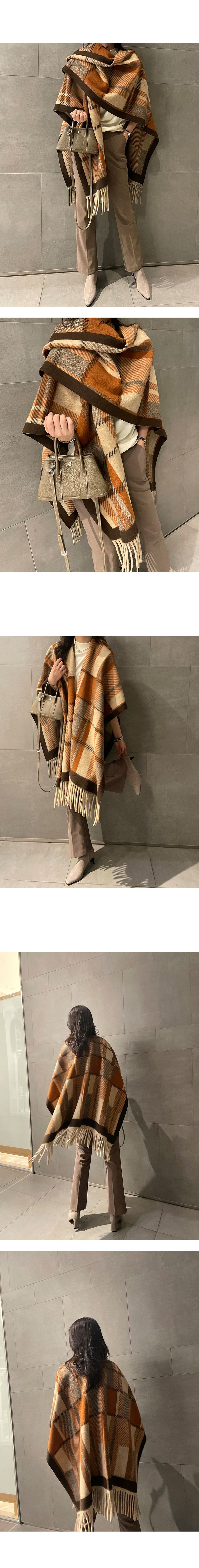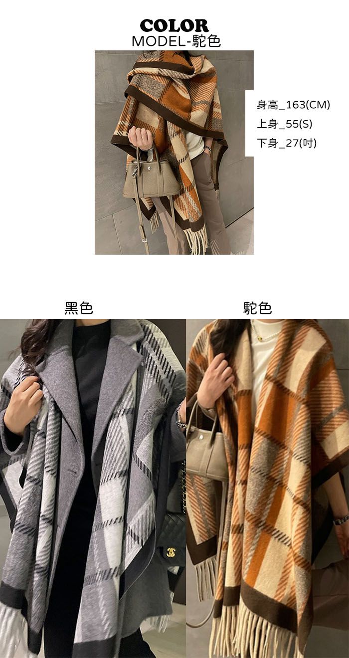 【C55753】韓國MNR 經典格紋披肩-寬大長版毛呢面料流蘇斗篷圍巾配件