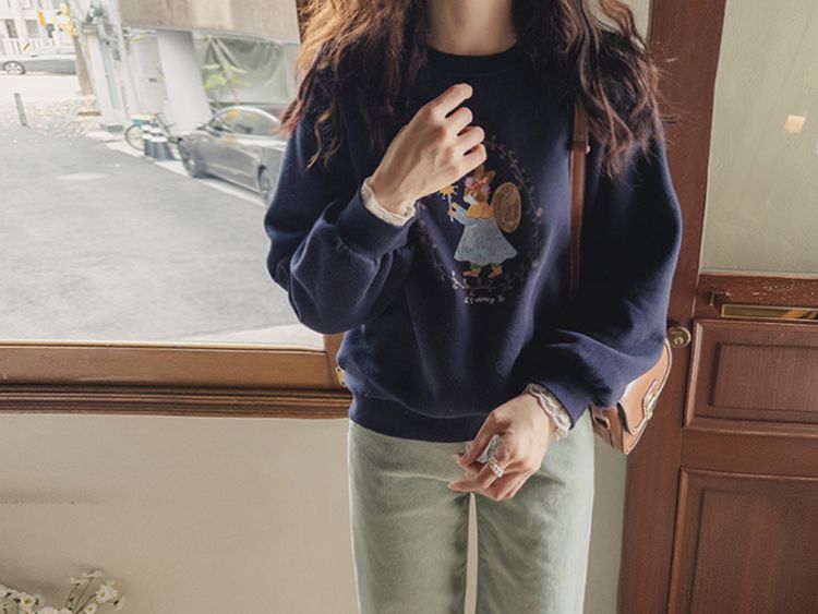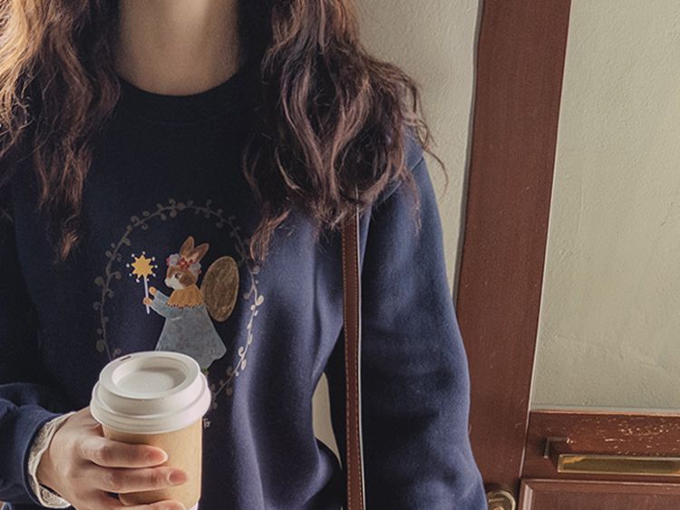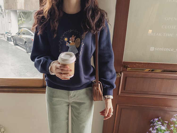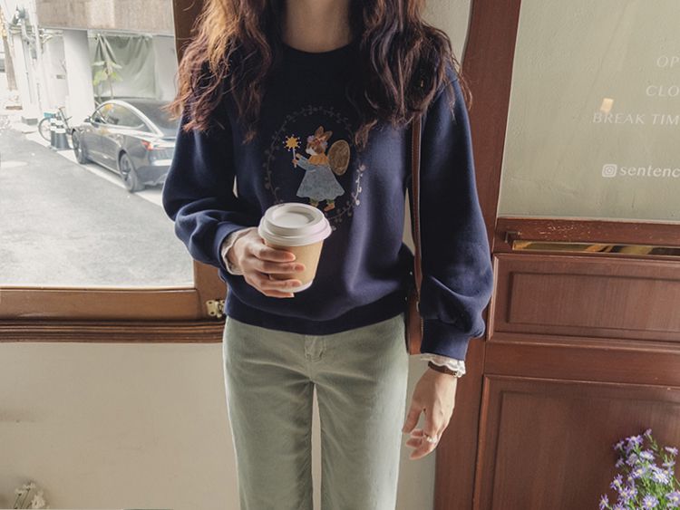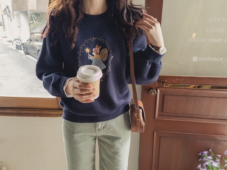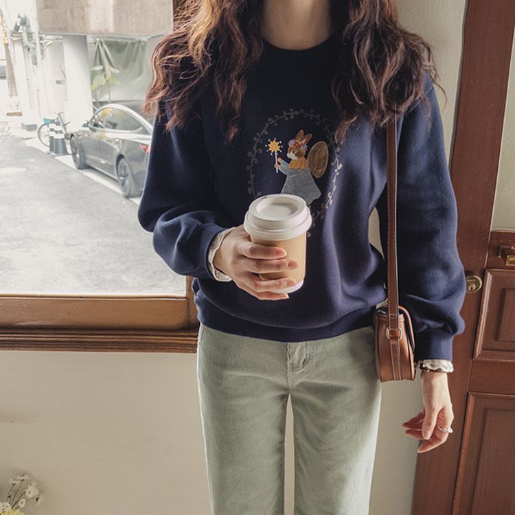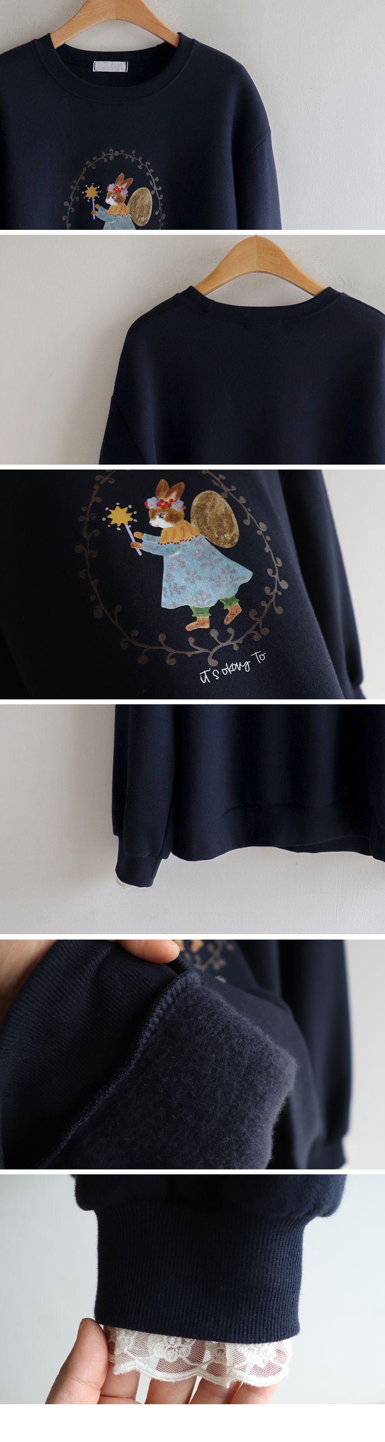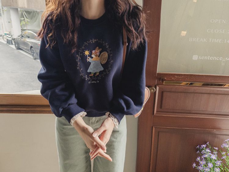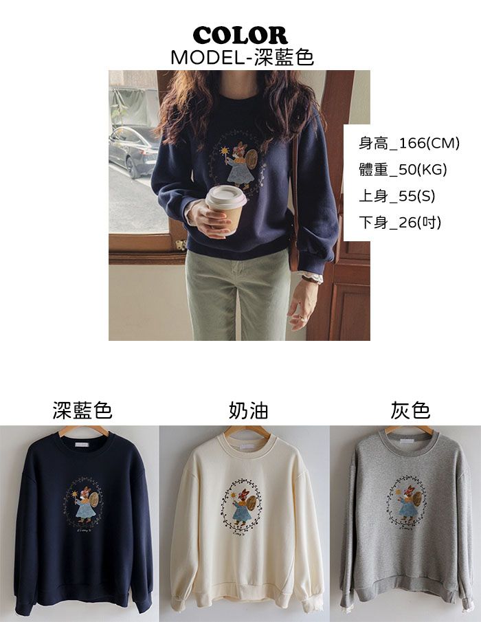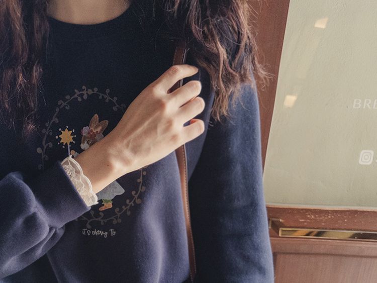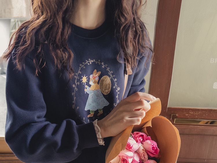 ★限時24H優惠★【C55756】韓國LEE 兔兔大學T-內刷毛燙印印花圓領蕾絲拼接長袖上衣