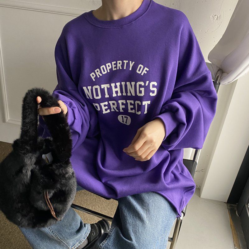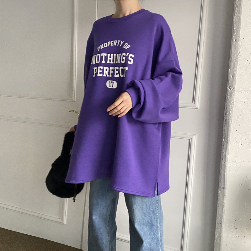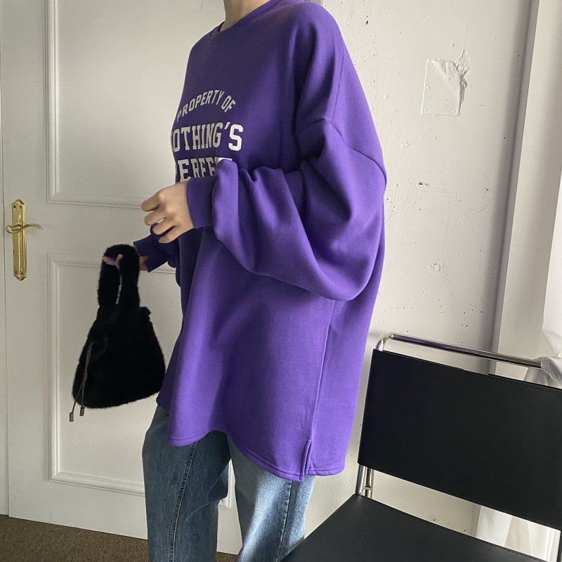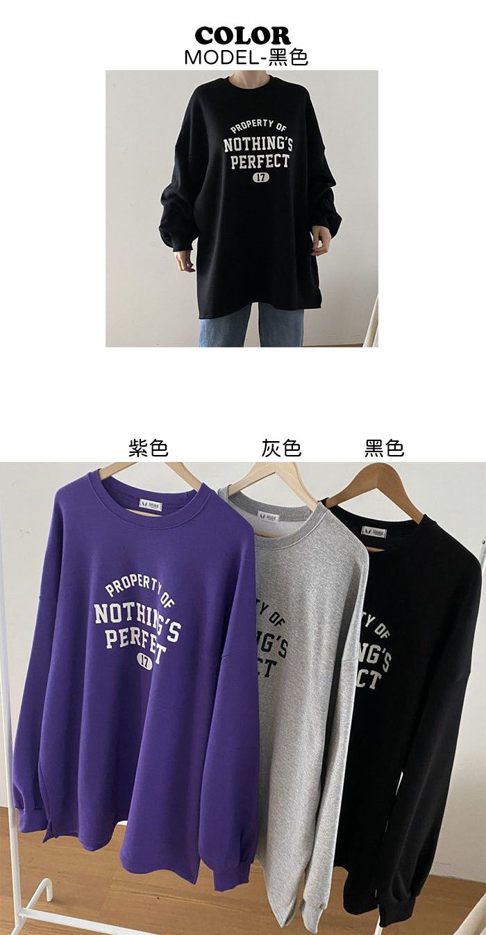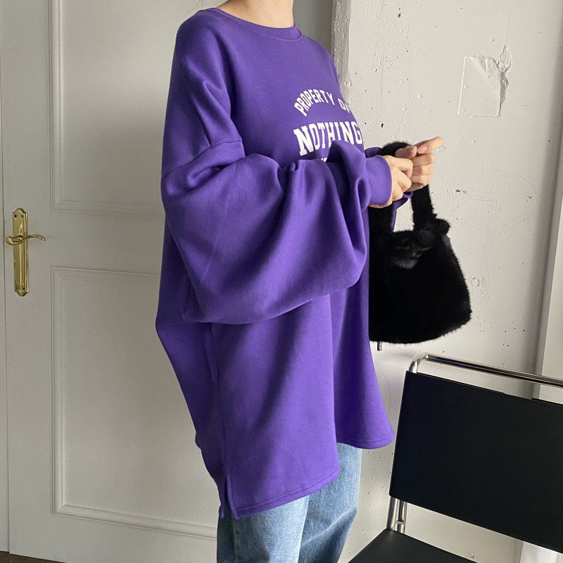 膠印字母/落肩寬袖/泡泡袖/好氣色/圓領/內刷毛/側開衩/寬鬆長版 - 休閒居家英文字母上衣字母T恤長版字母大學T長袖上衣紫色灰色黑色
