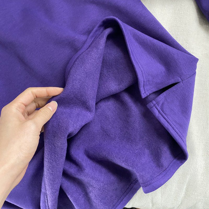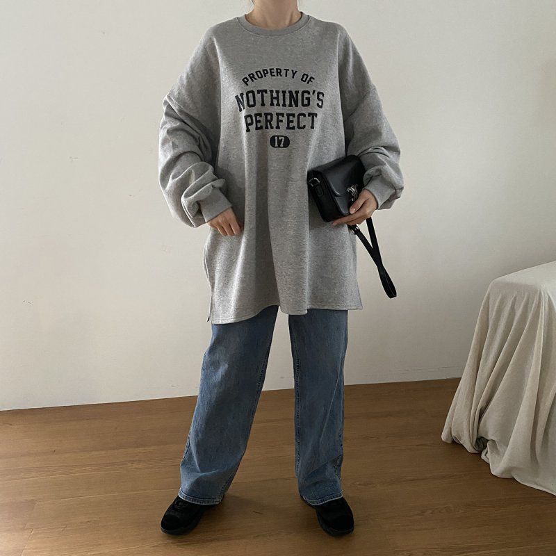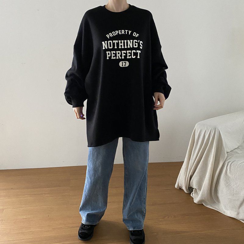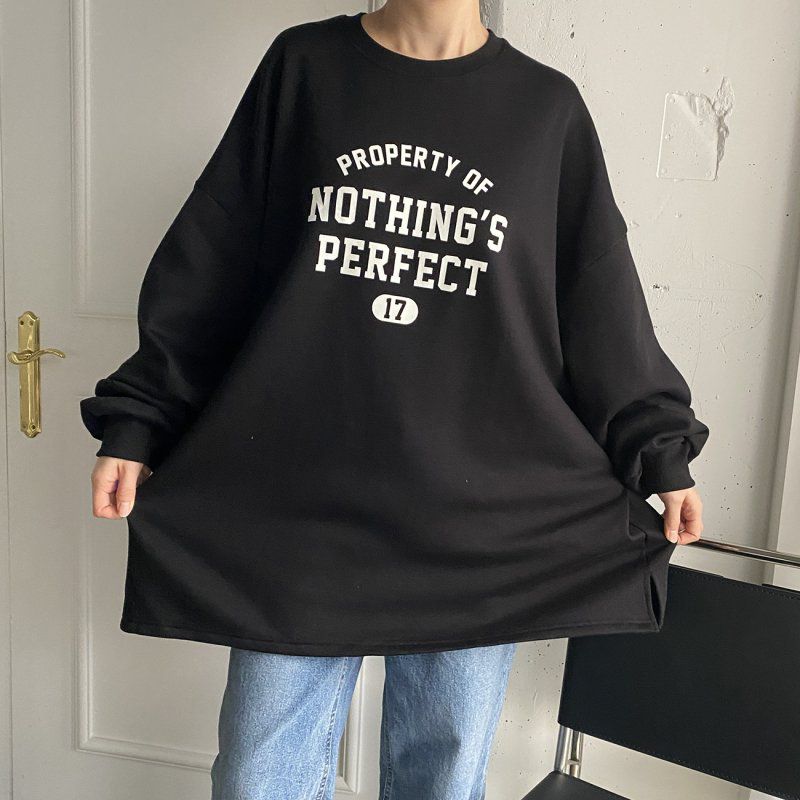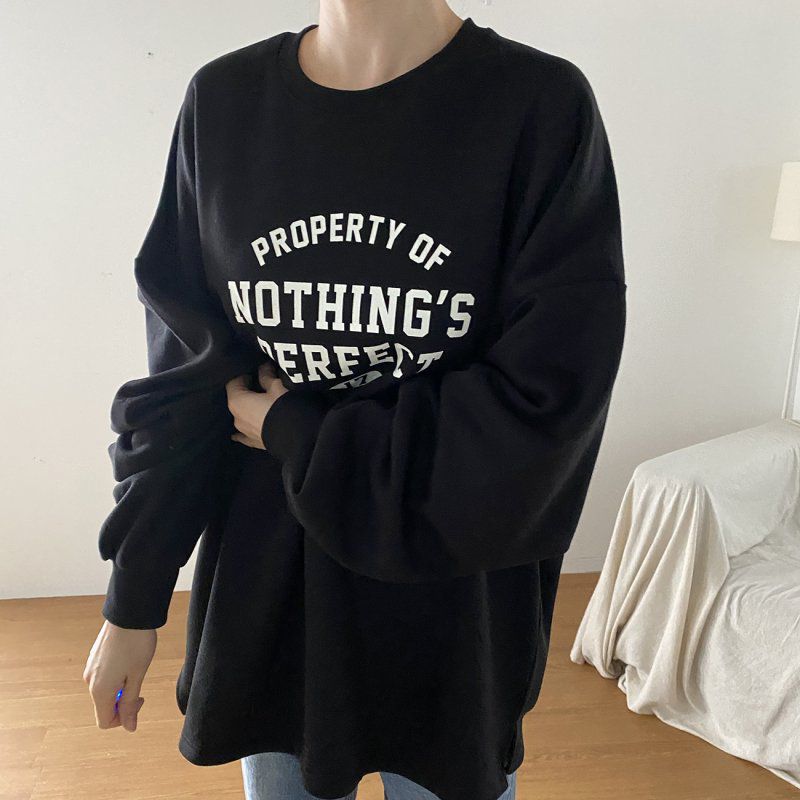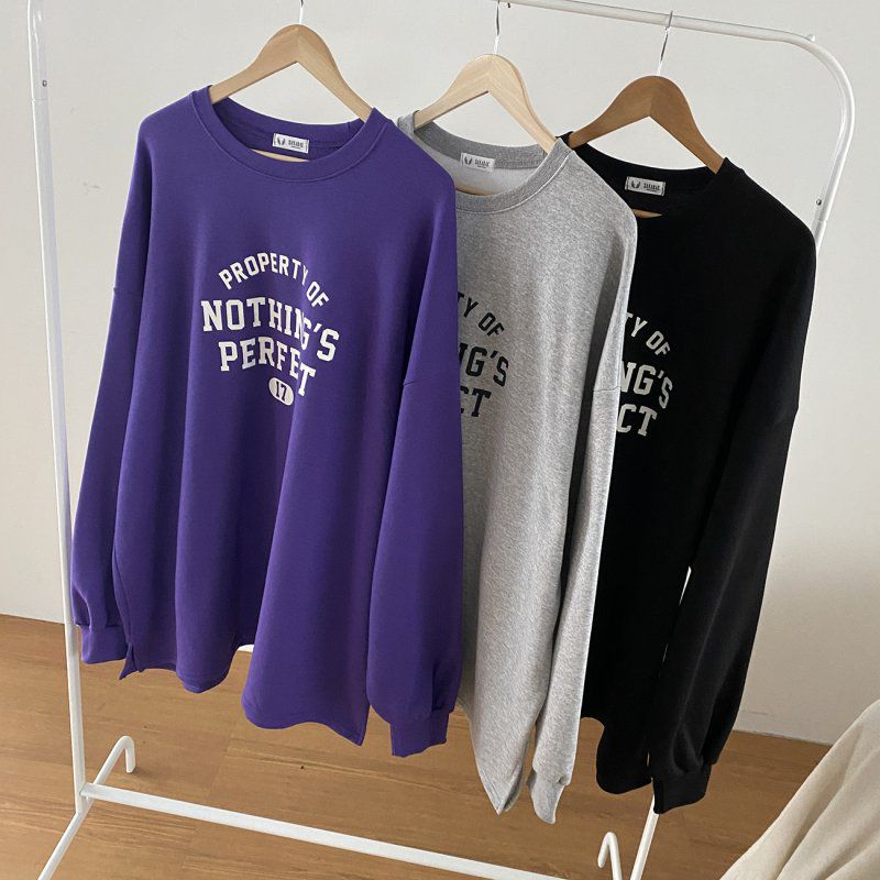 膠印字母/落肩寬袖/泡泡袖/好氣色/圓領/內刷毛/側開衩/寬鬆長版 - 休閒居家英文字母上衣字母T恤長版字母大學T長袖上衣紫色灰色黑色
