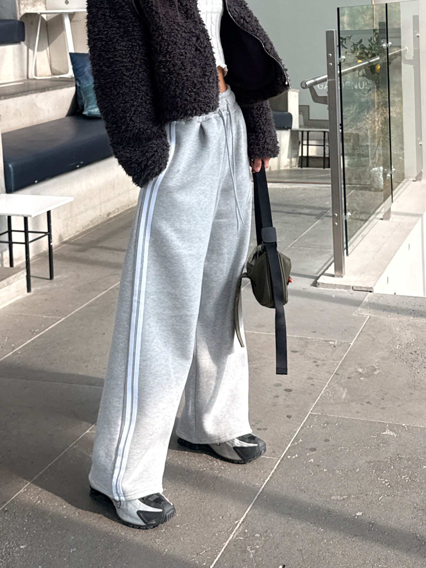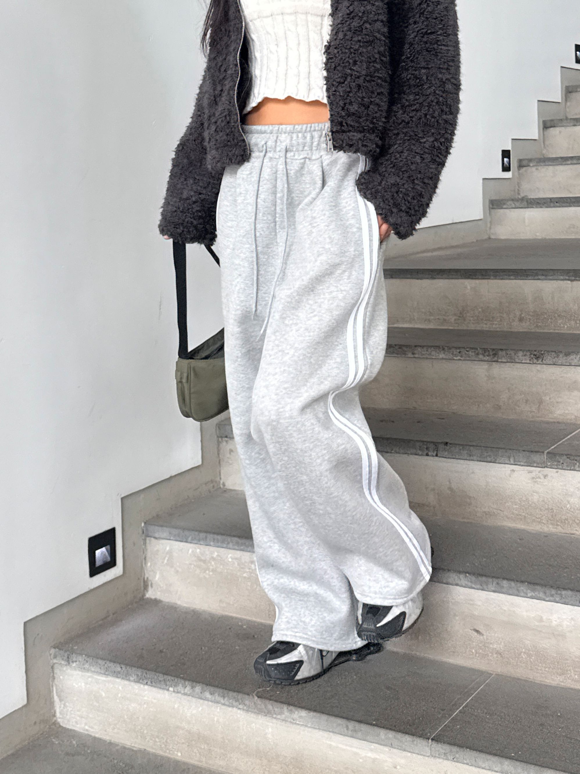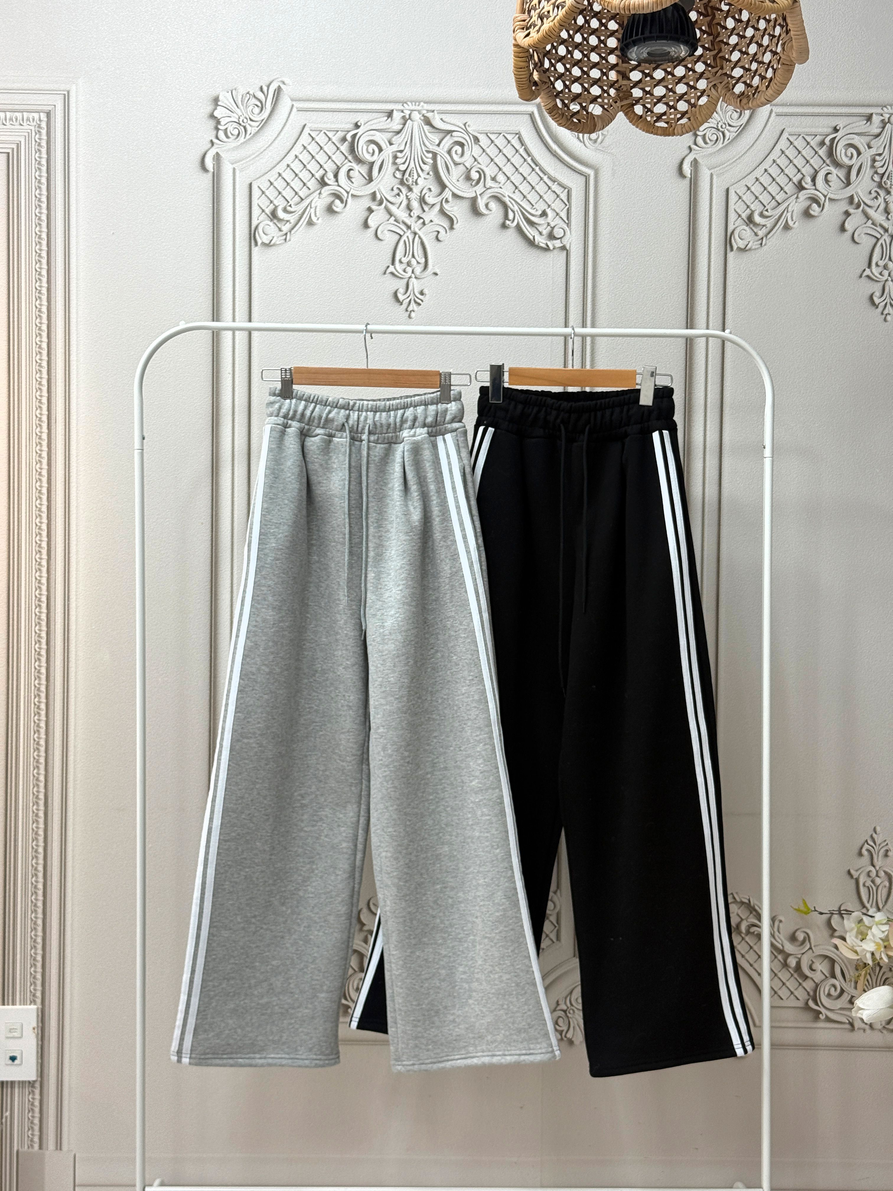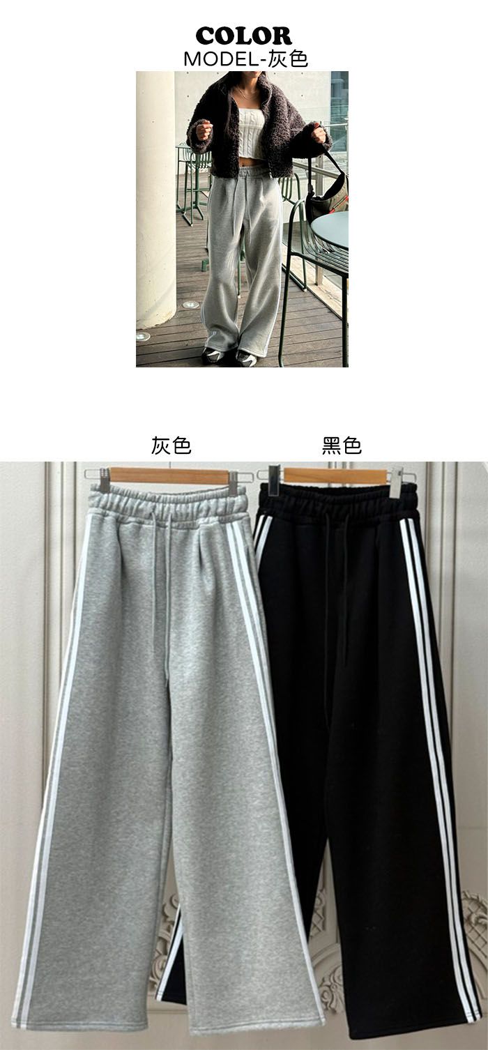 【C55788】韓國MIR 厚磅刷毛運動褲-側邊雙白條紋抽繩腰闊腿長褲