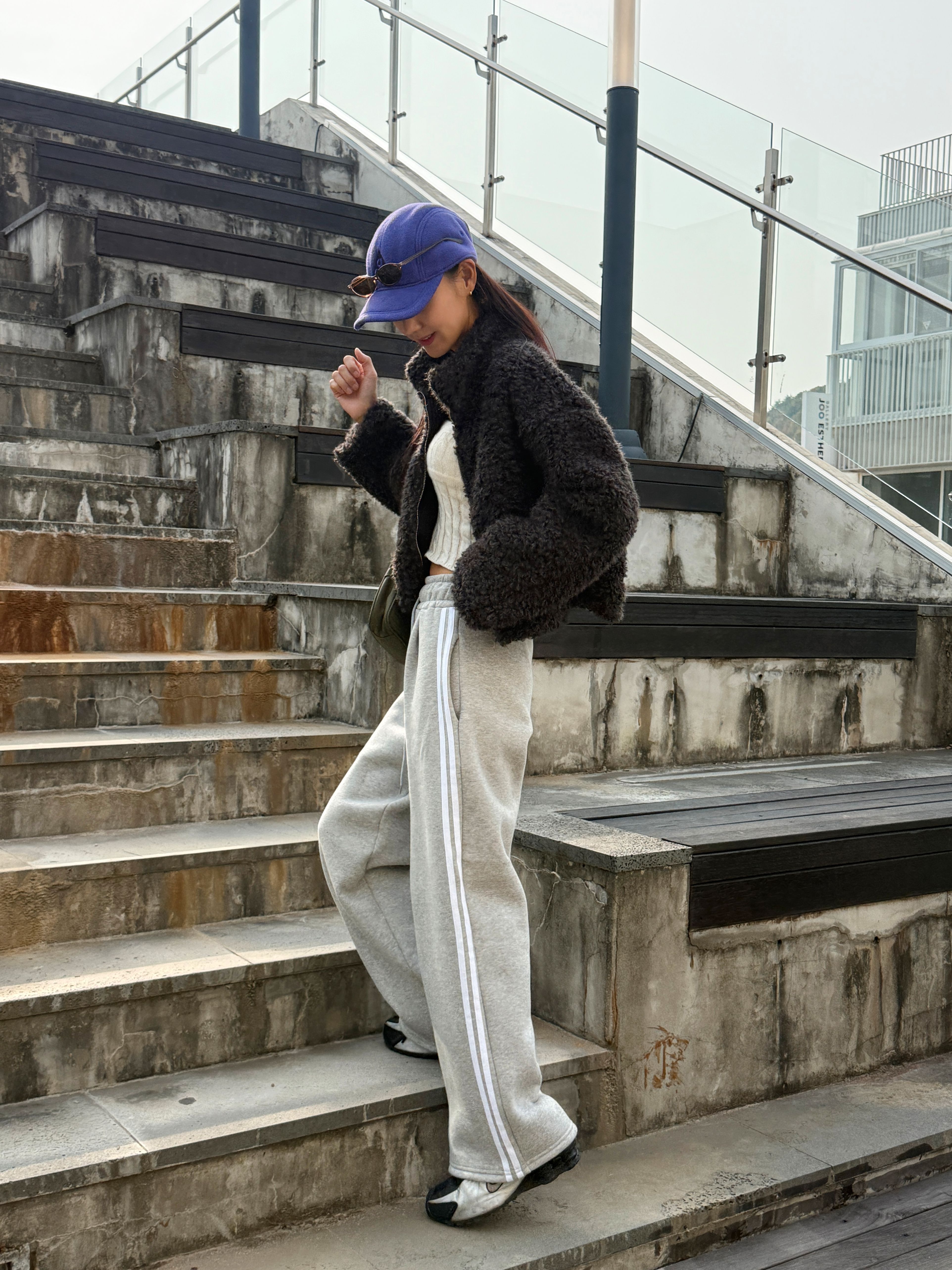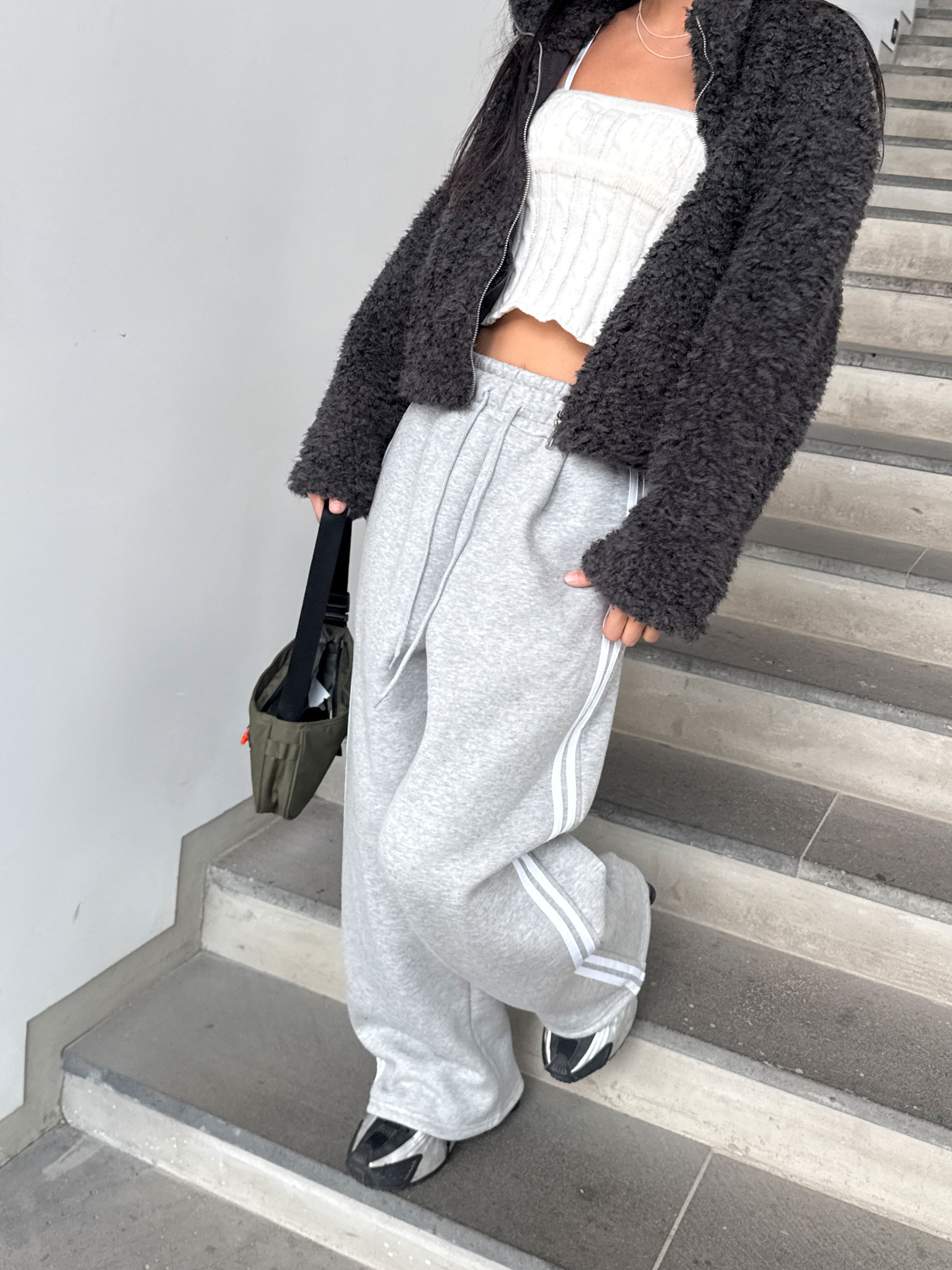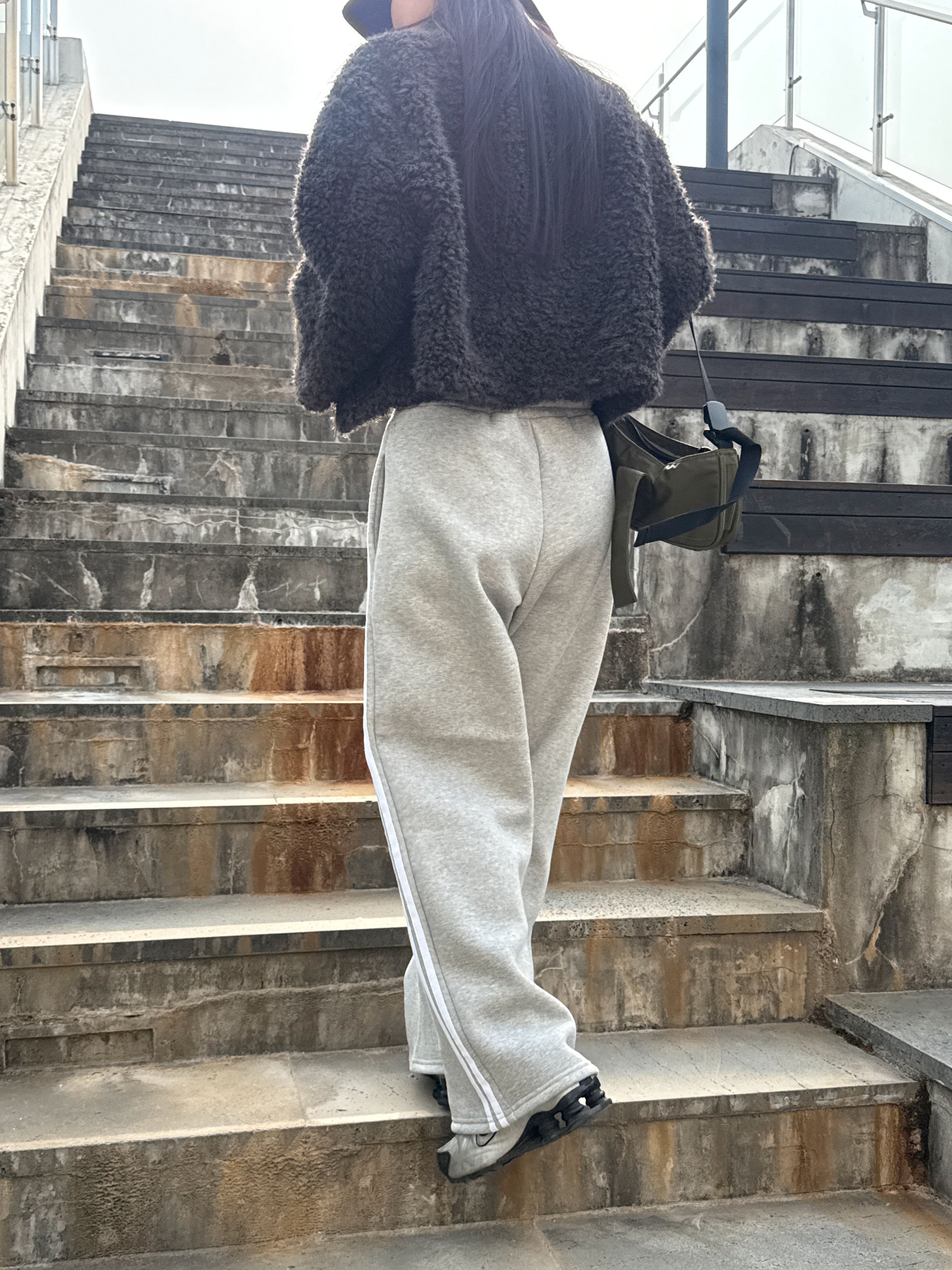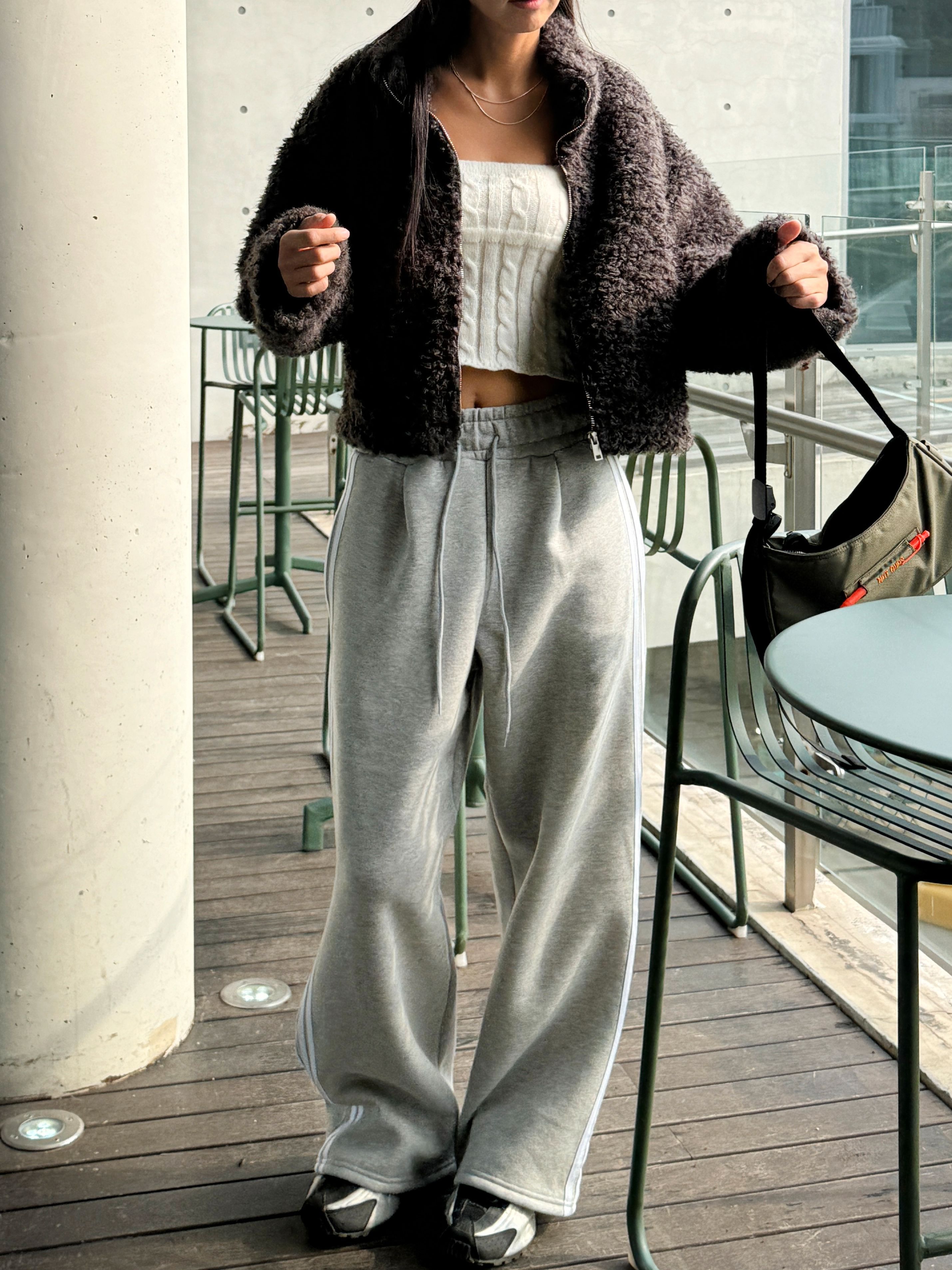 【C55788】韓國MIR 厚磅刷毛運動褲-側邊雙白條紋抽繩腰闊腿長褲