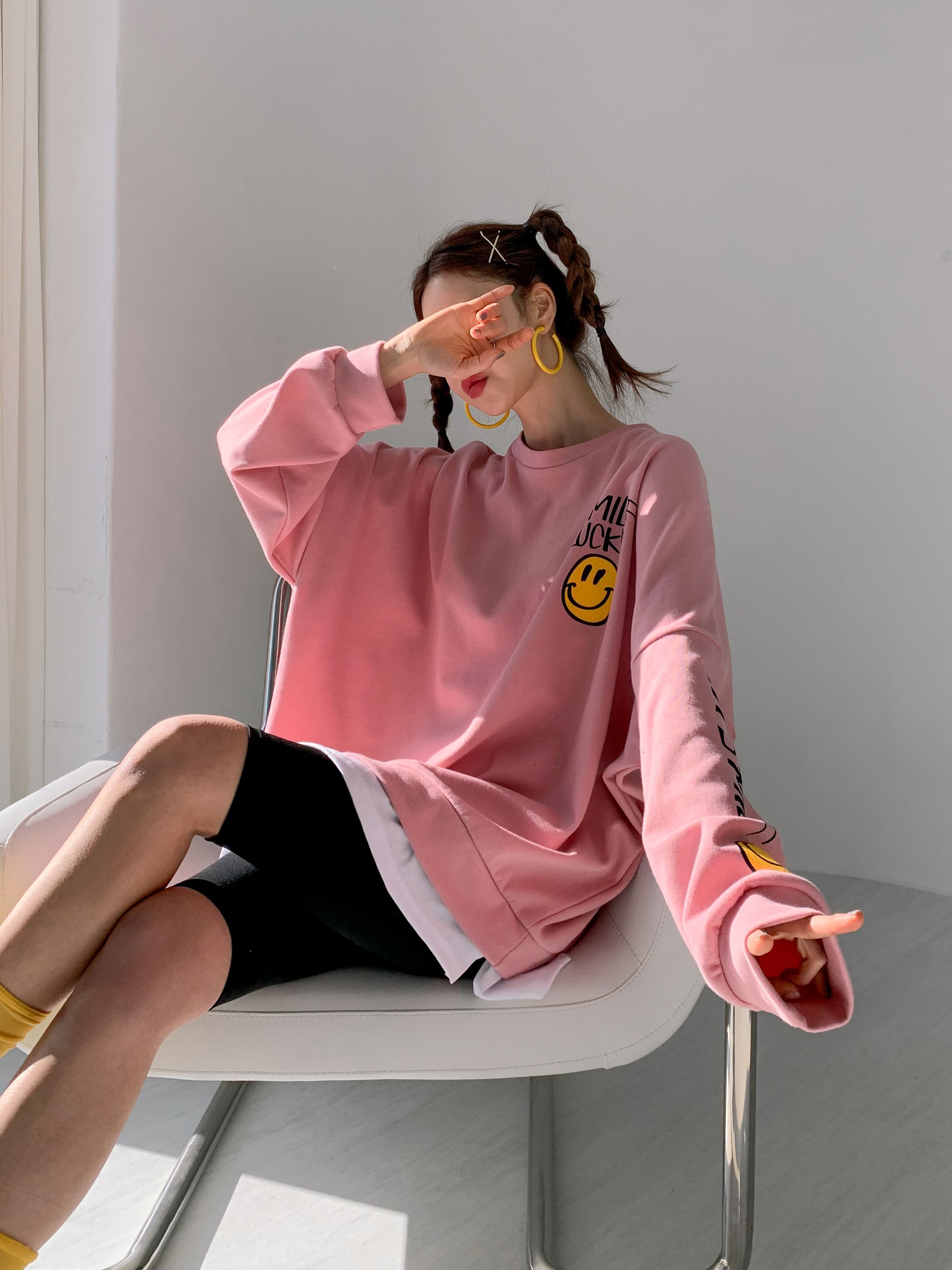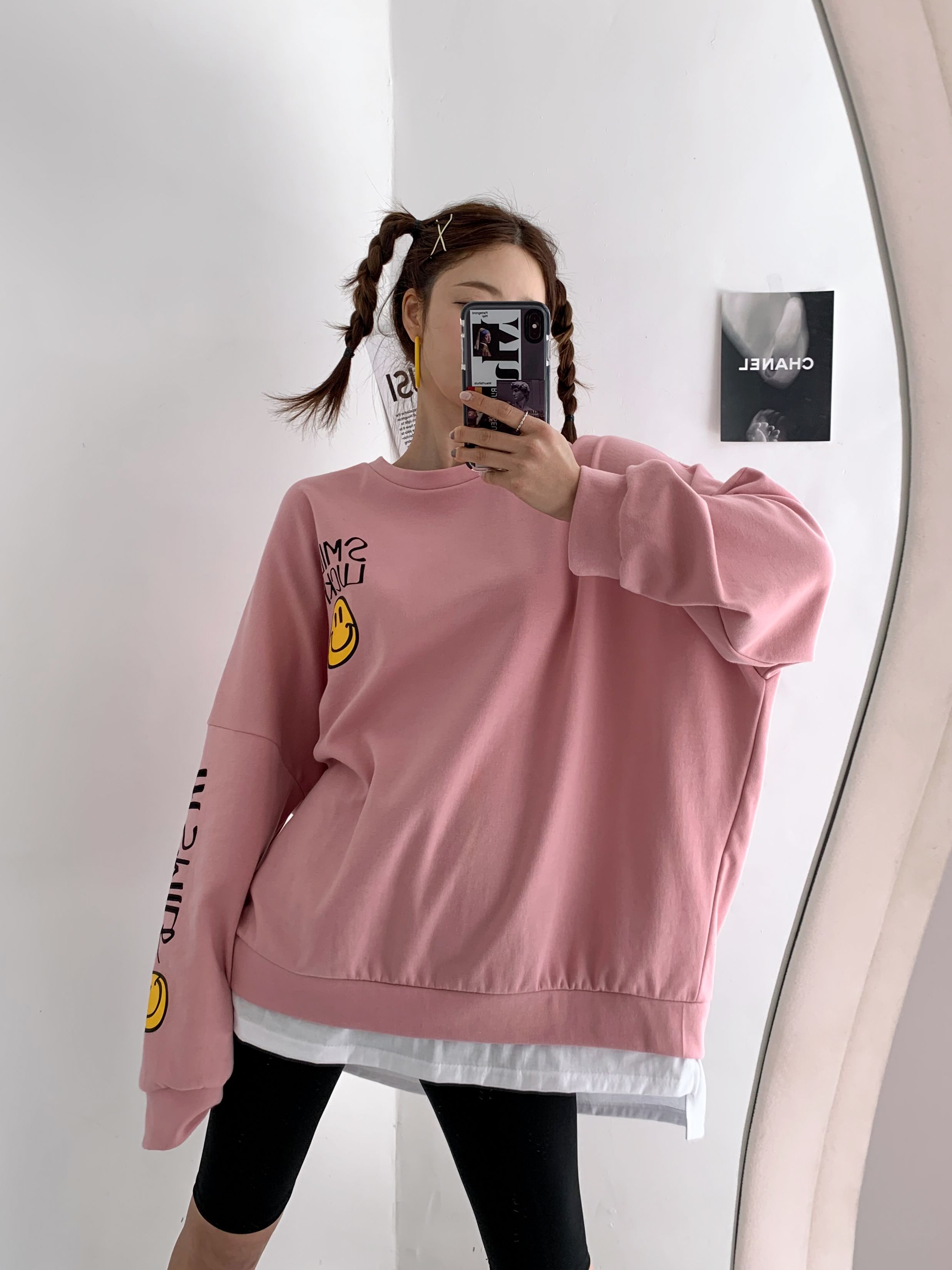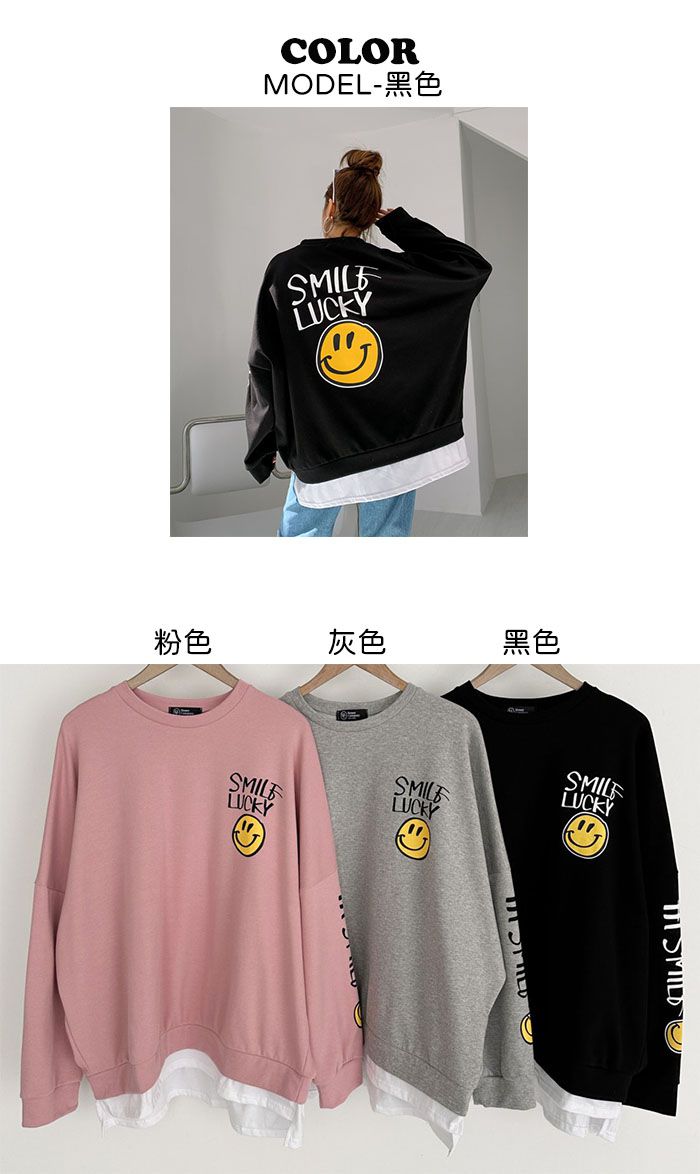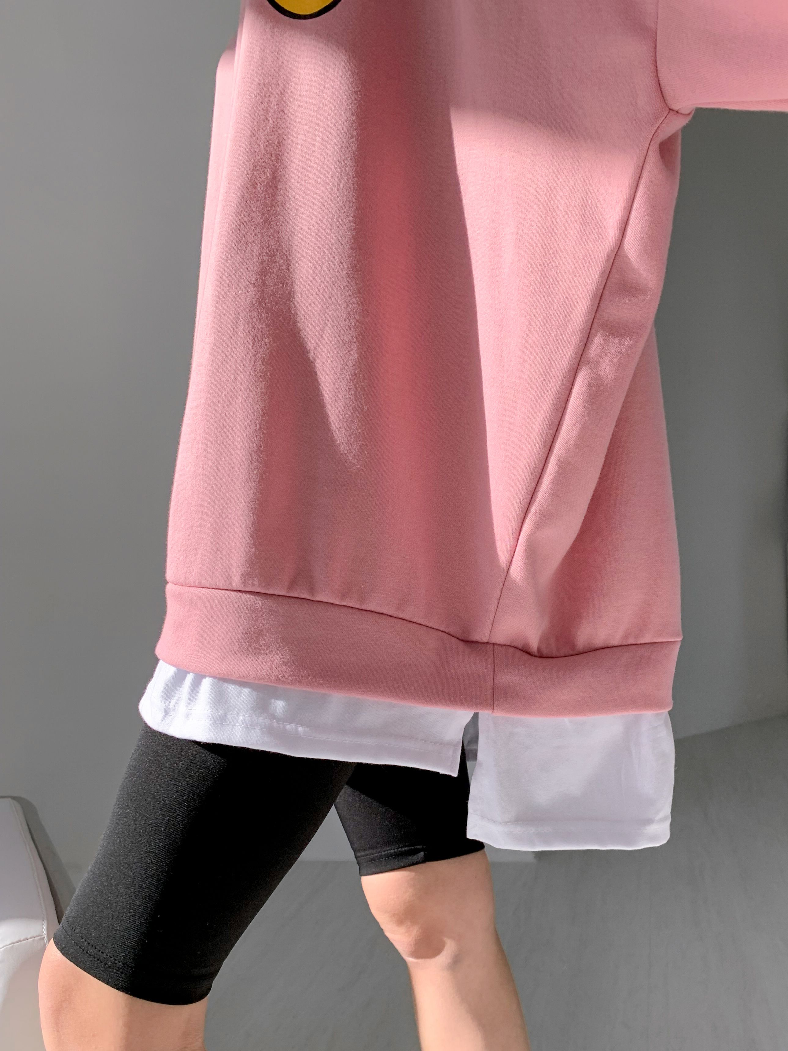 假兩件拼接上衣/膠印字母/微笑印花/圓領/好氣色/寬鬆長版/側開衩 - 休閒居家英文字母上衣字母T恤微笑T恤笑臉T恤假兩件笑臉上衣長袖上衣粉色灰色黑色