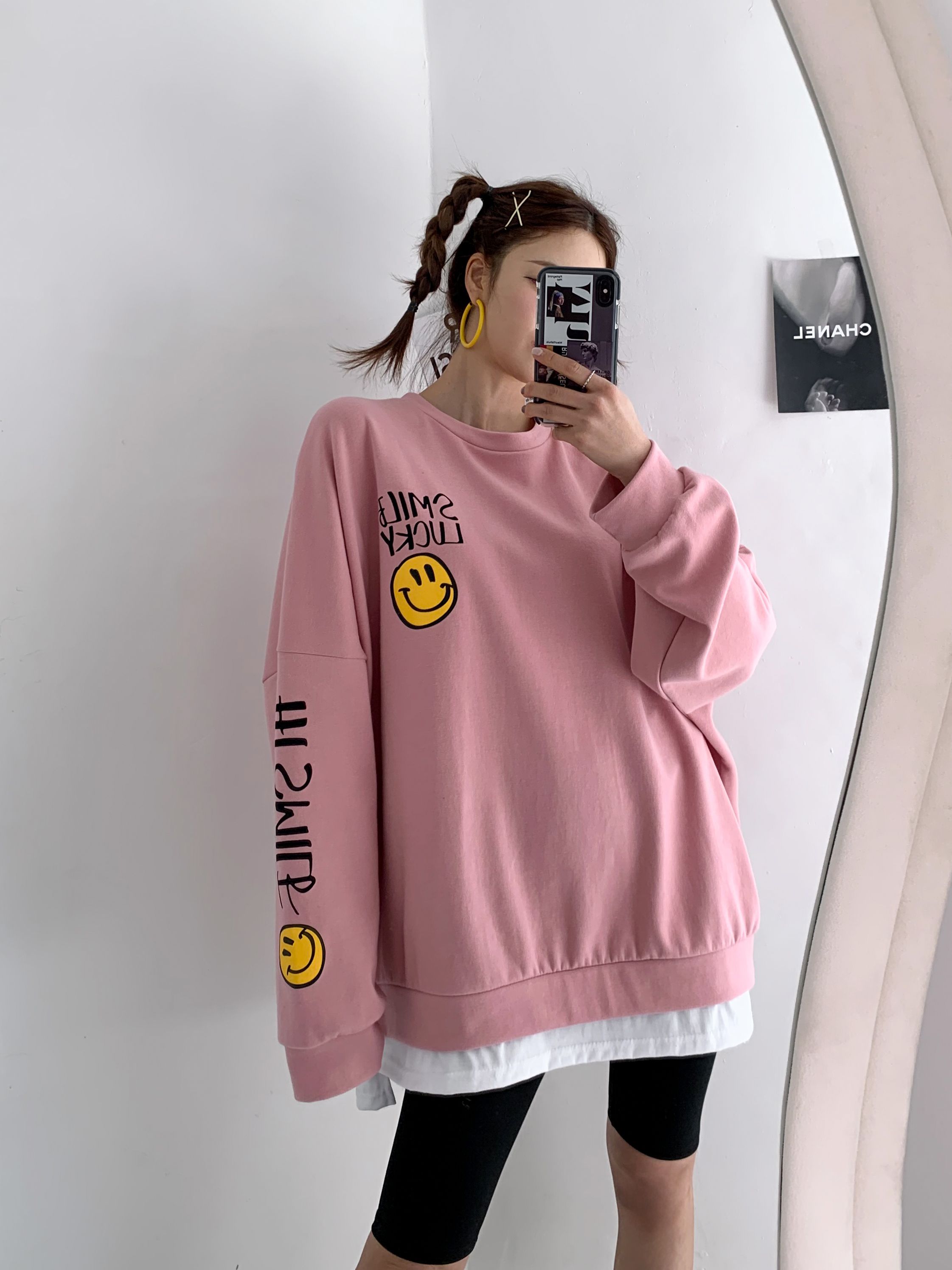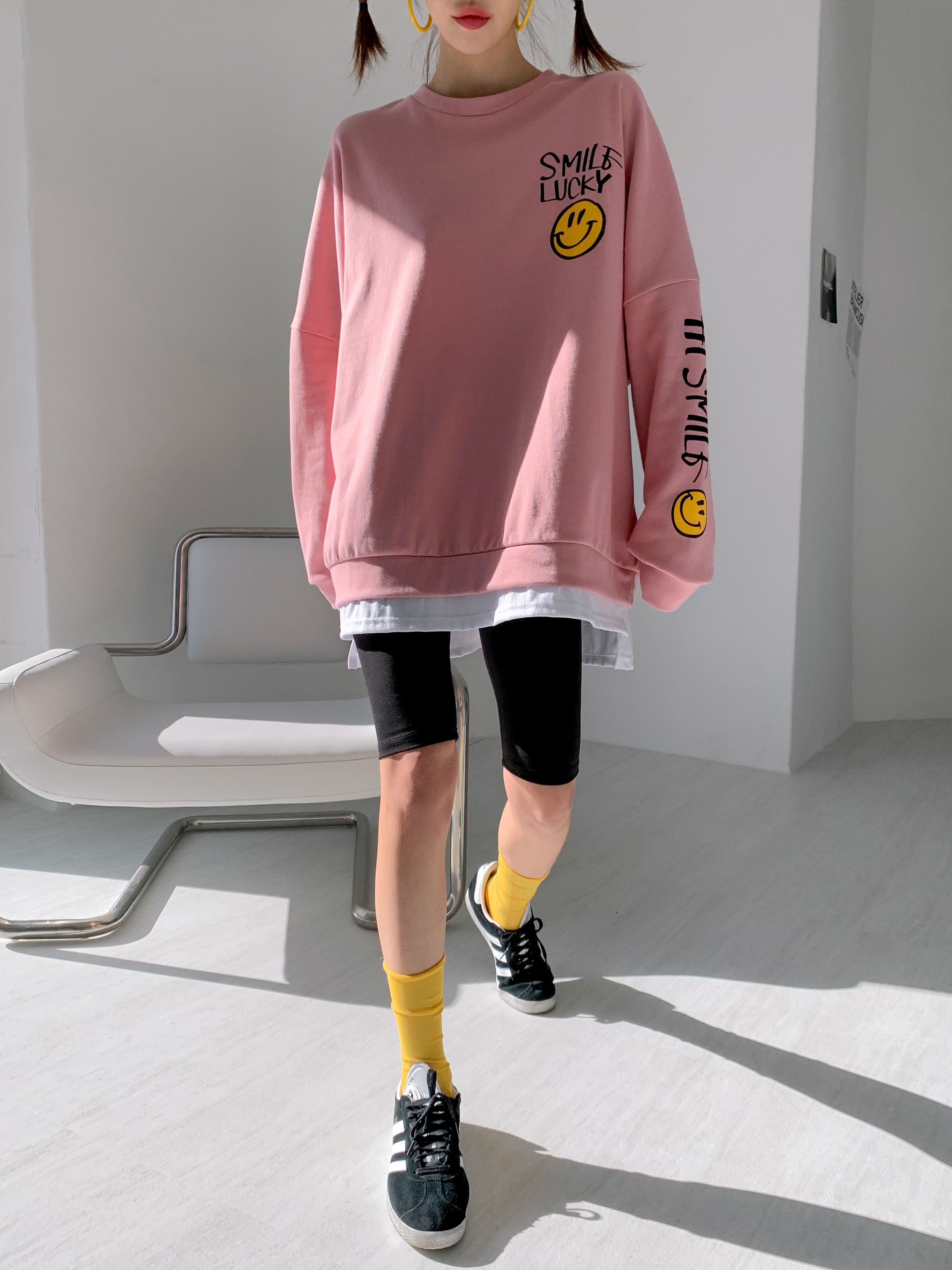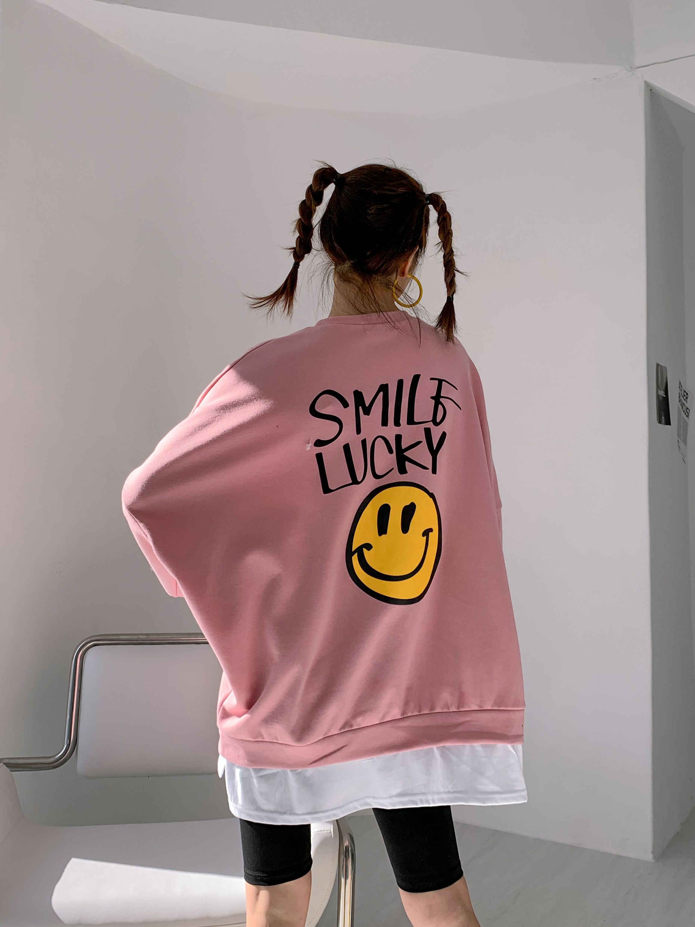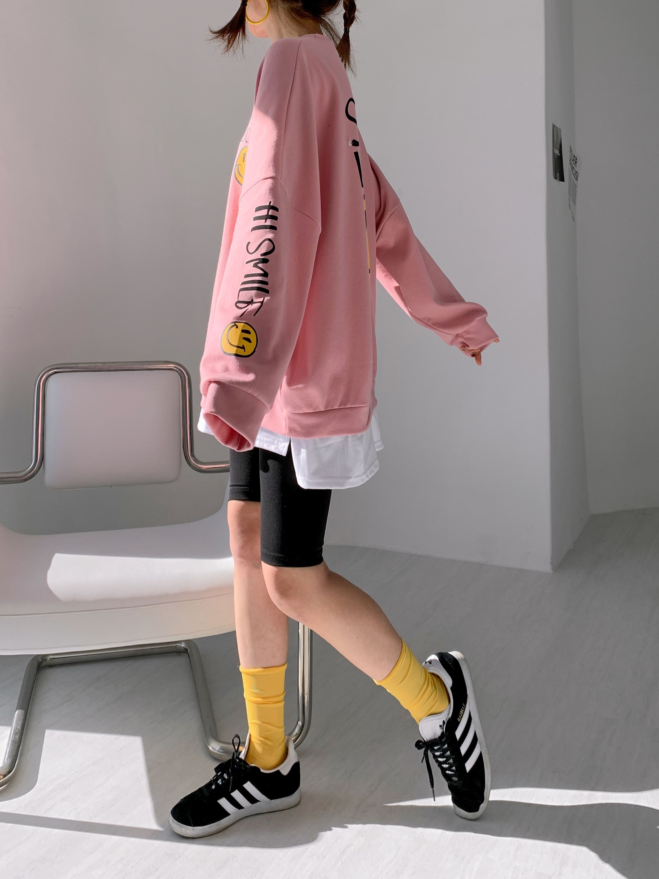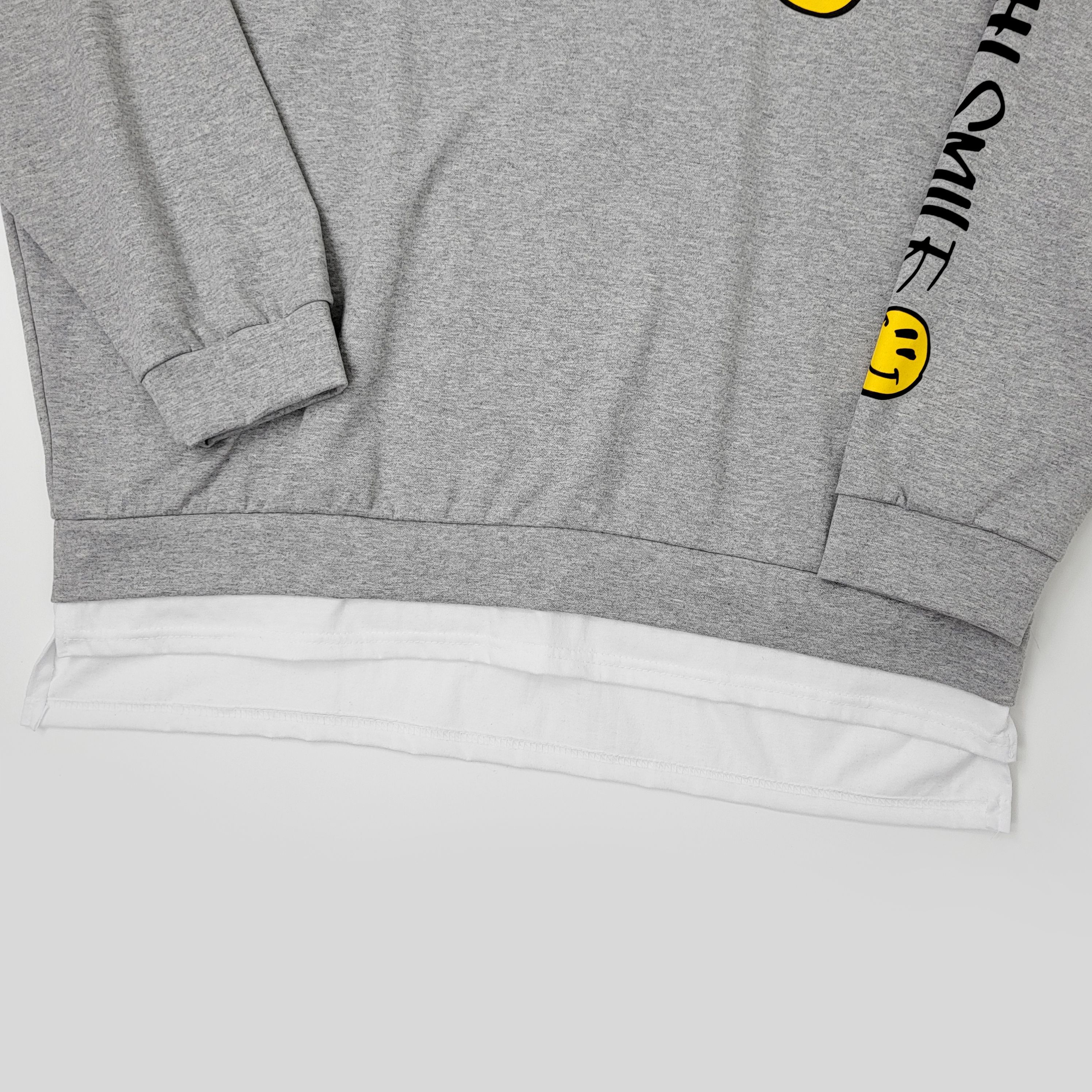 假兩件拼接上衣/膠印字母/微笑印花/圓領/好氣色/寬鬆長版/側開衩 - 休閒居家英文字母上衣字母T恤微笑T恤笑臉T恤假兩件笑臉上衣長袖上衣粉色灰色黑色