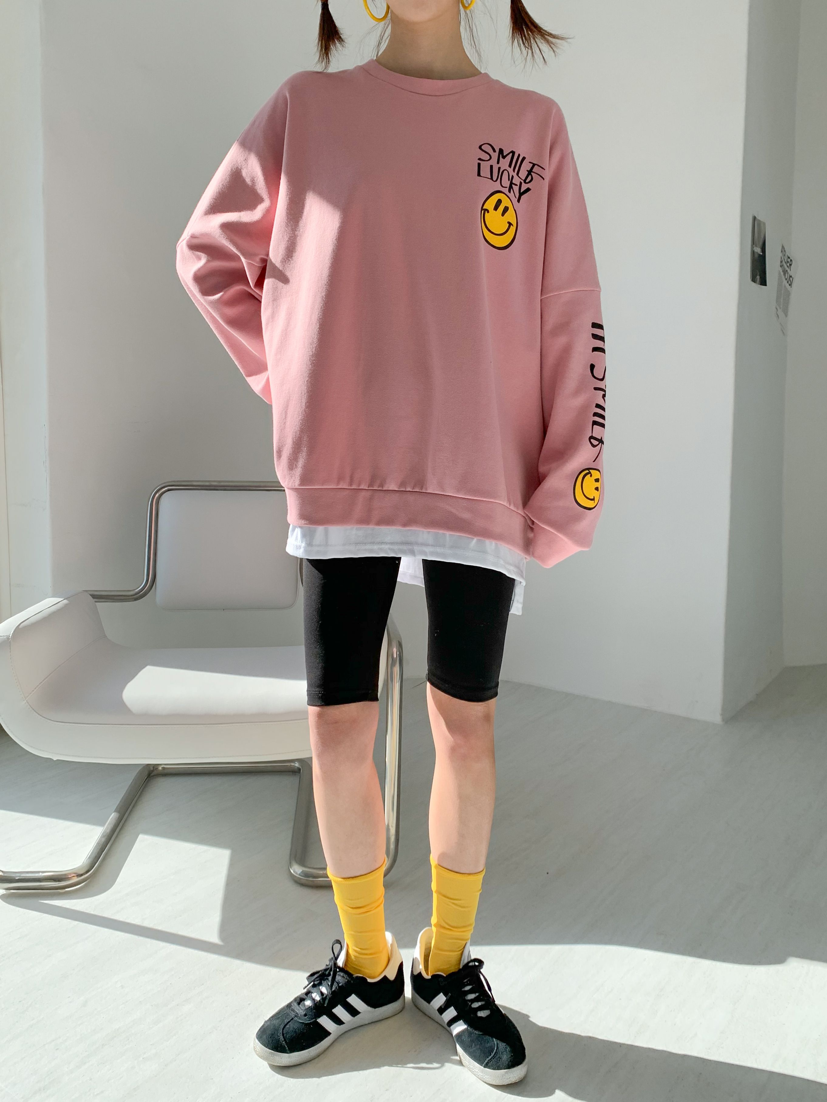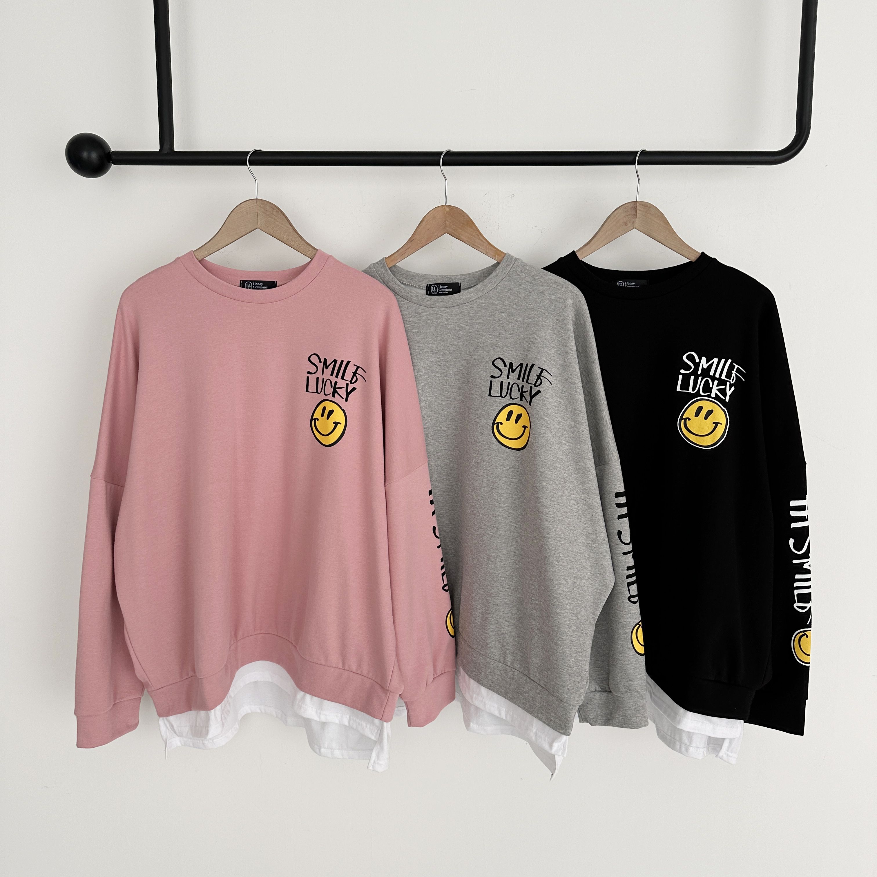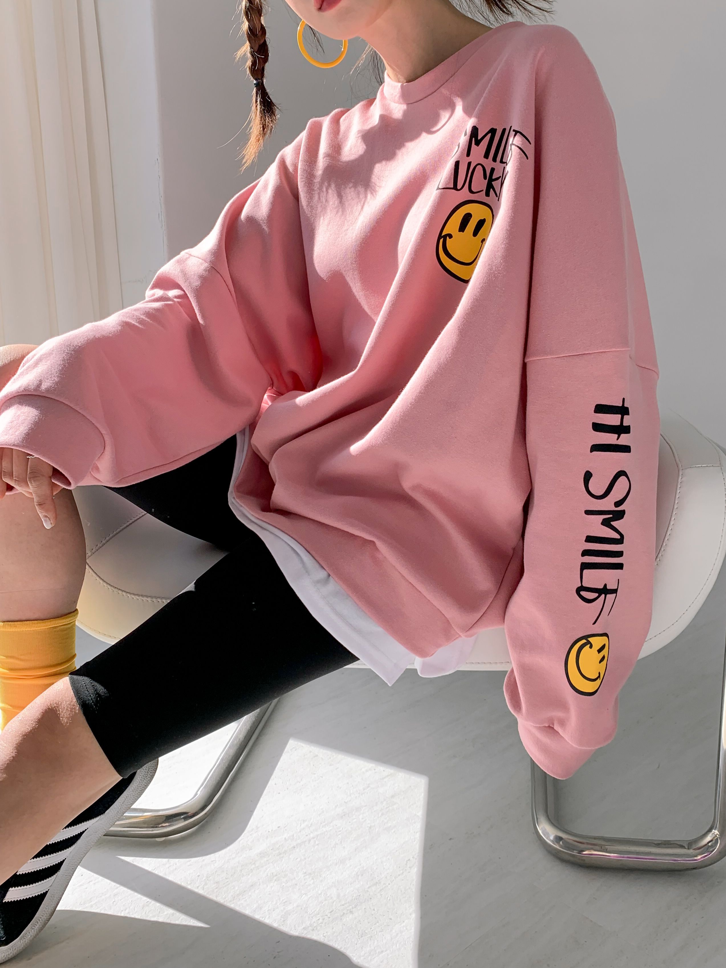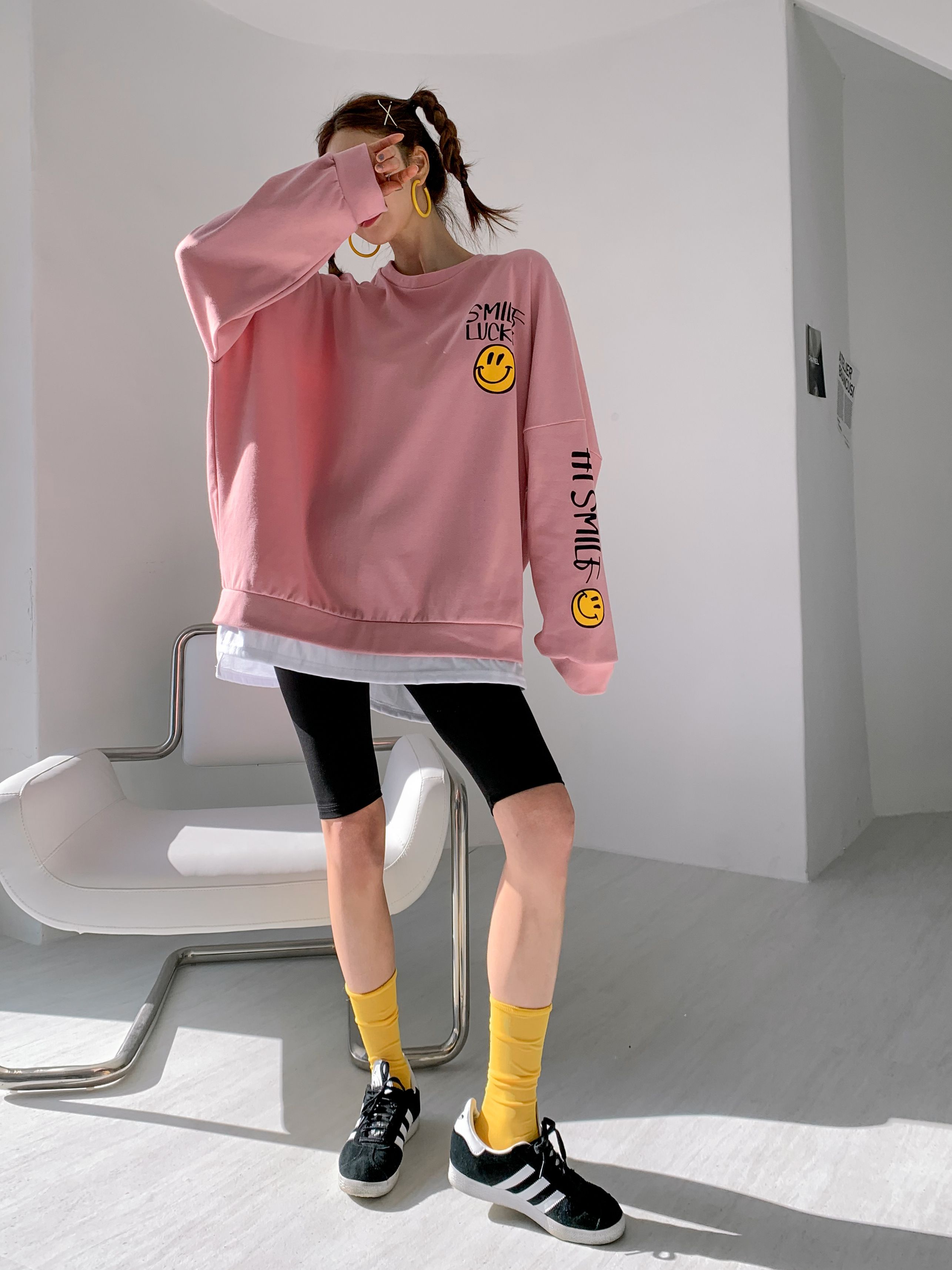 假兩件拼接上衣/膠印字母/微笑印花/圓領/好氣色/寬鬆長版/側開衩 - 休閒居家英文字母上衣字母T恤微笑T恤笑臉T恤假兩件笑臉上衣長袖上衣粉色灰色黑色