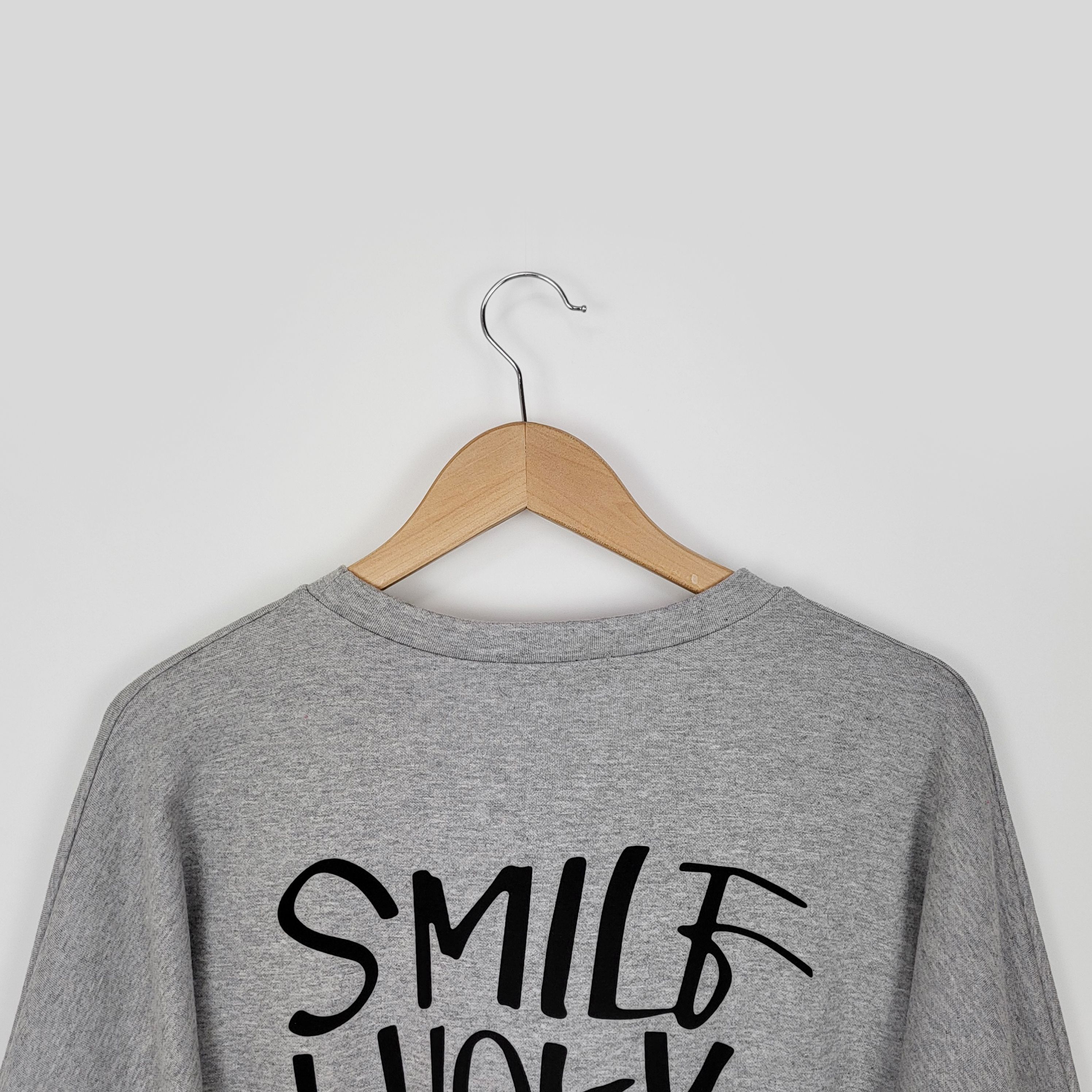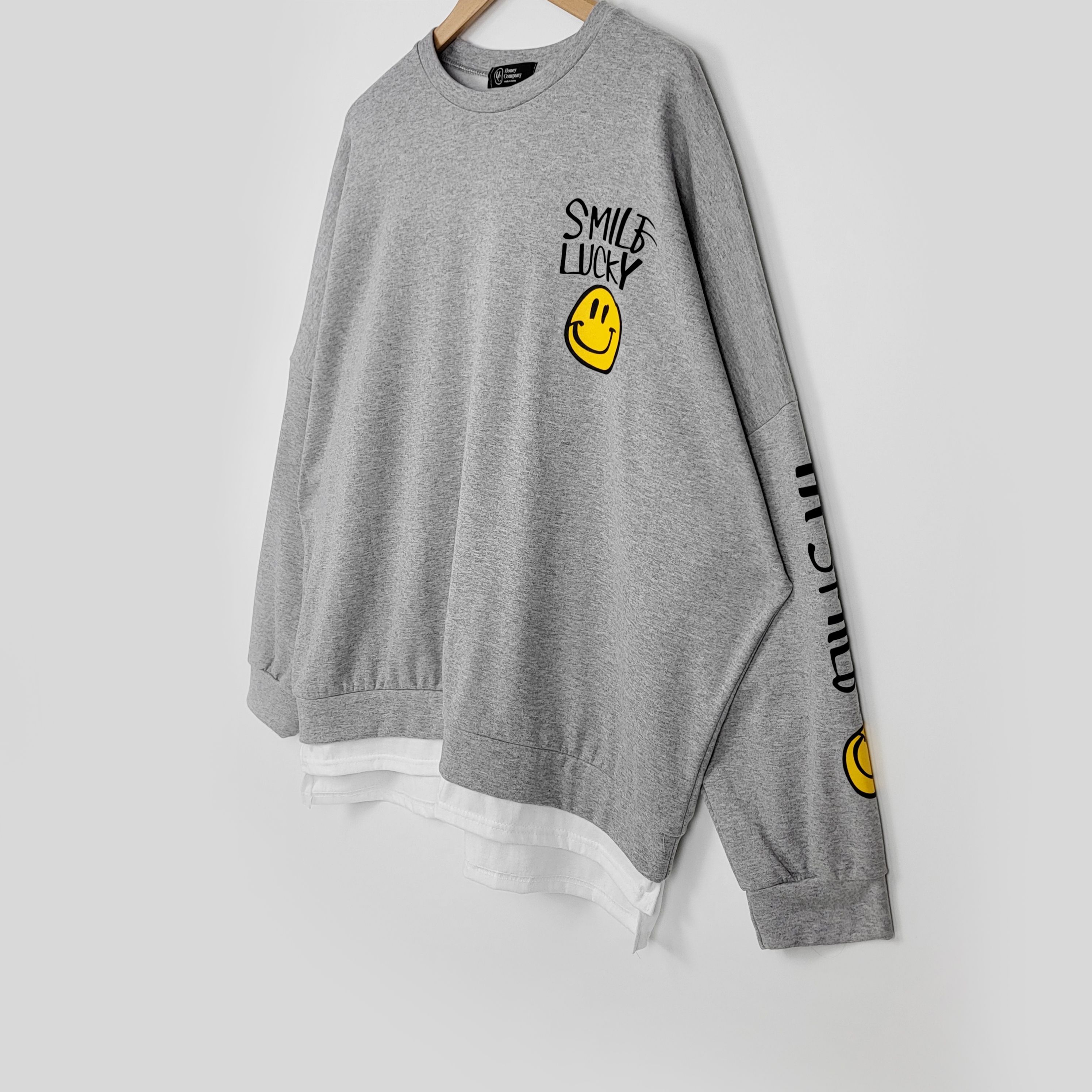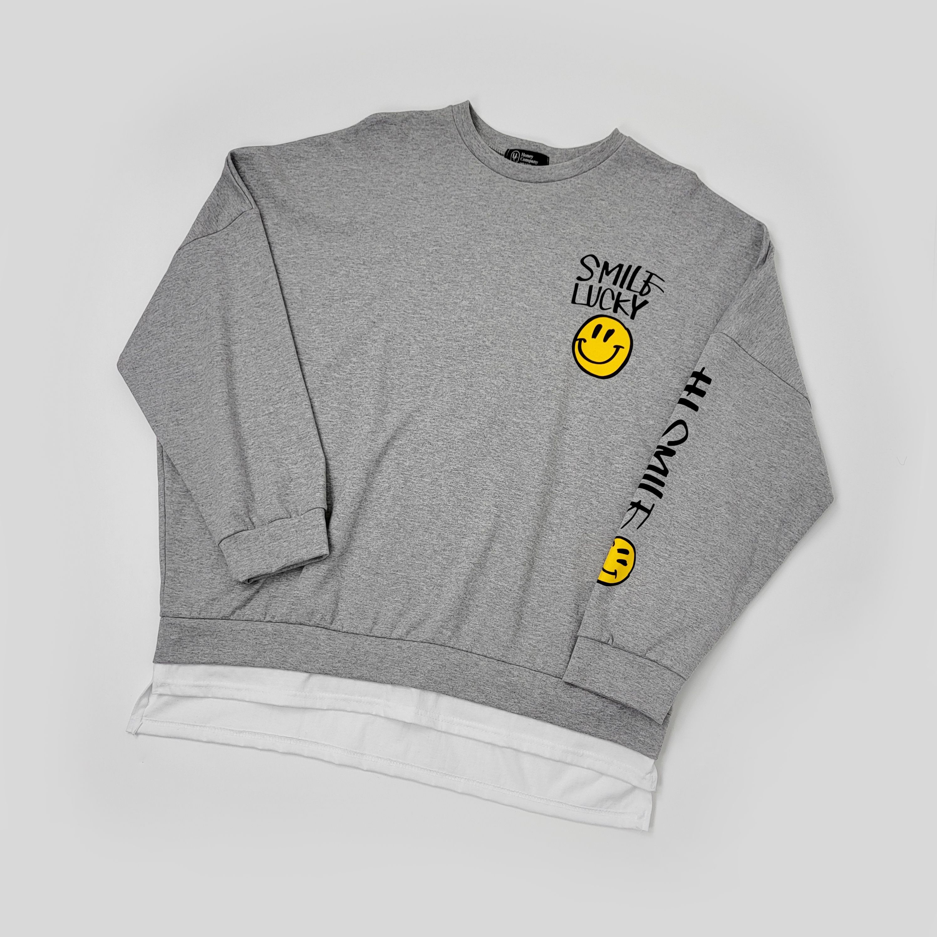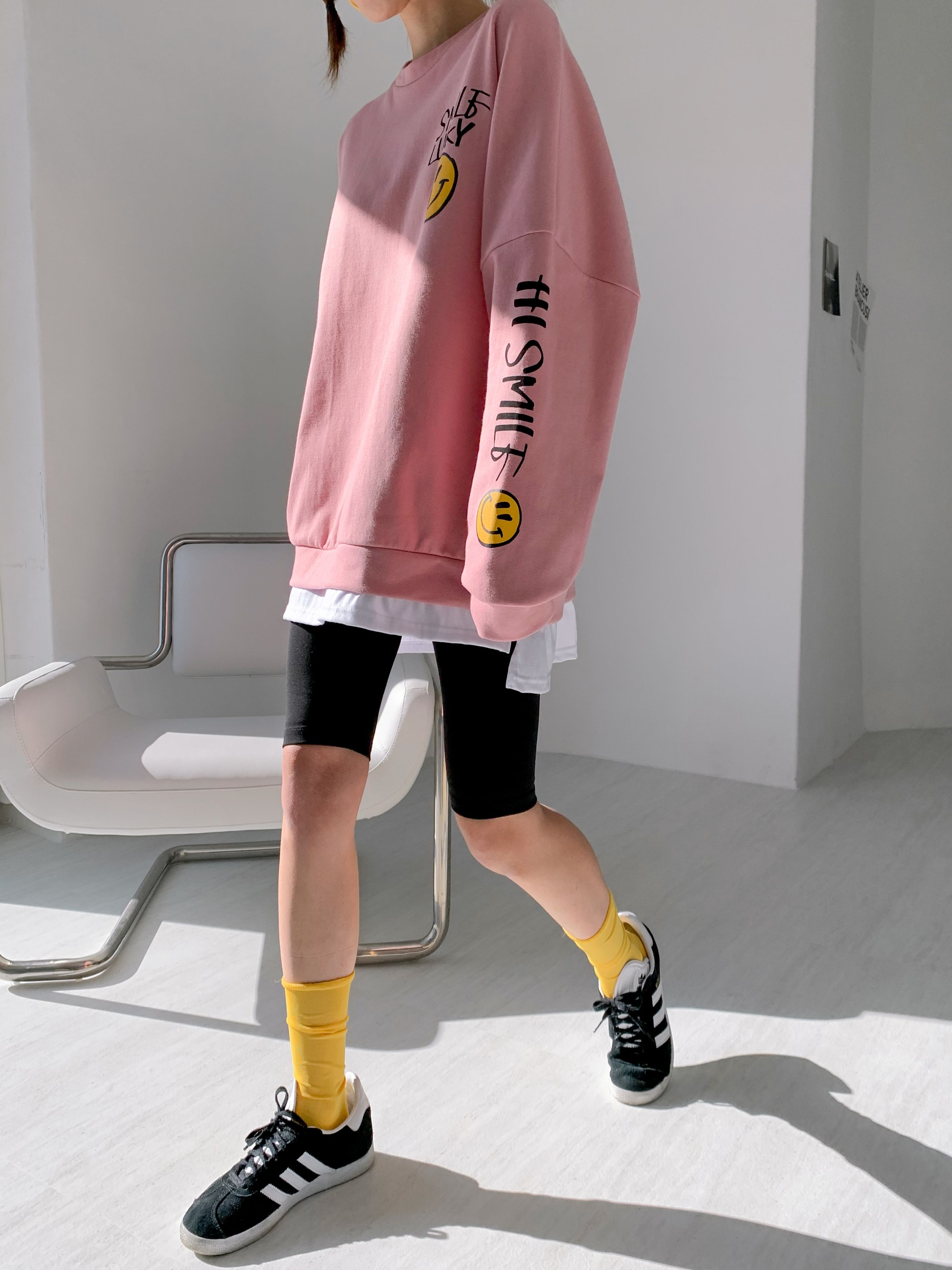 假兩件拼接上衣/膠印字母/微笑印花/圓領/好氣色/寬鬆長版/側開衩 - 休閒居家英文字母上衣字母T恤微笑T恤笑臉T恤假兩件笑臉上衣長袖上衣粉色灰色黑色