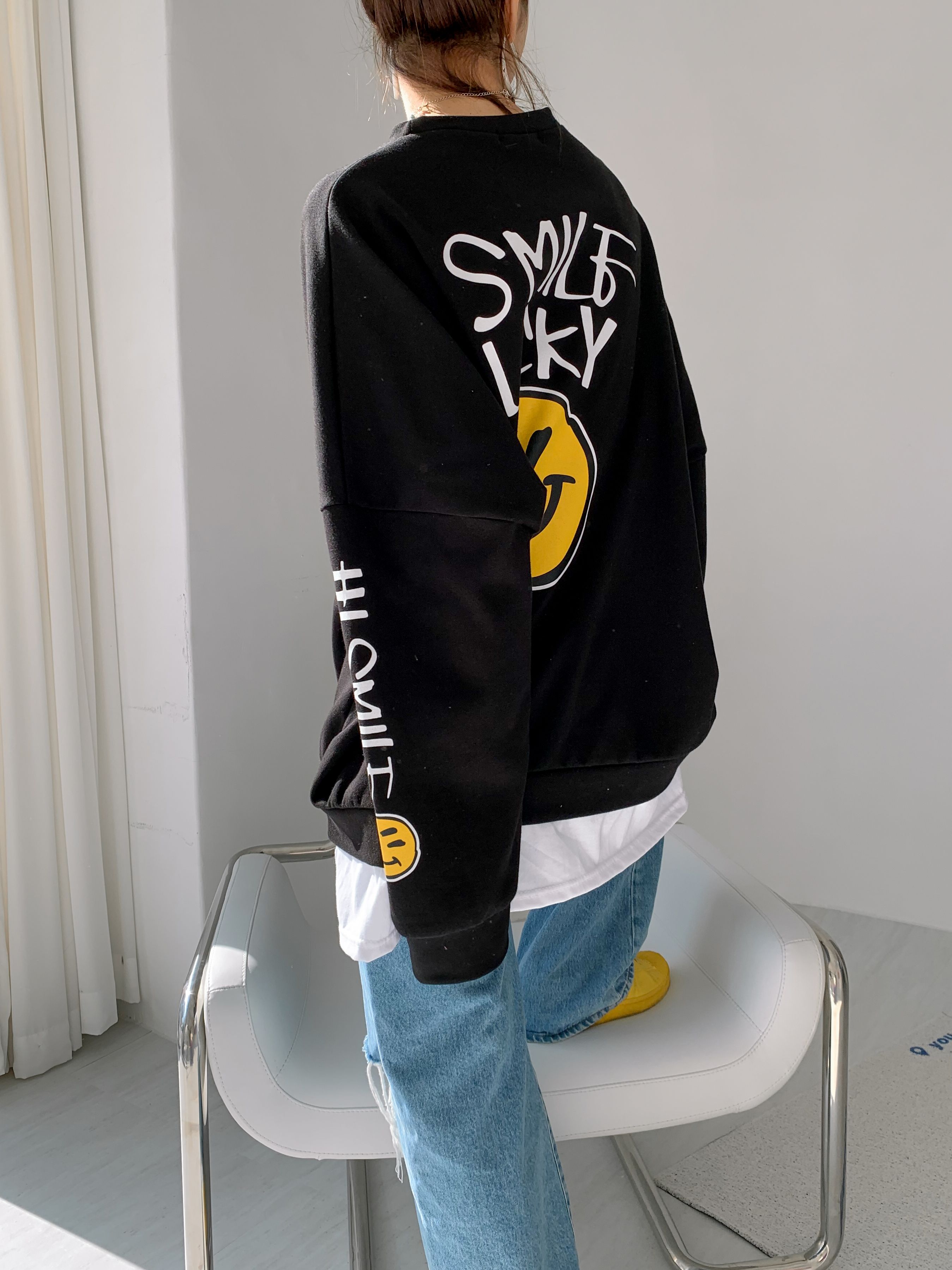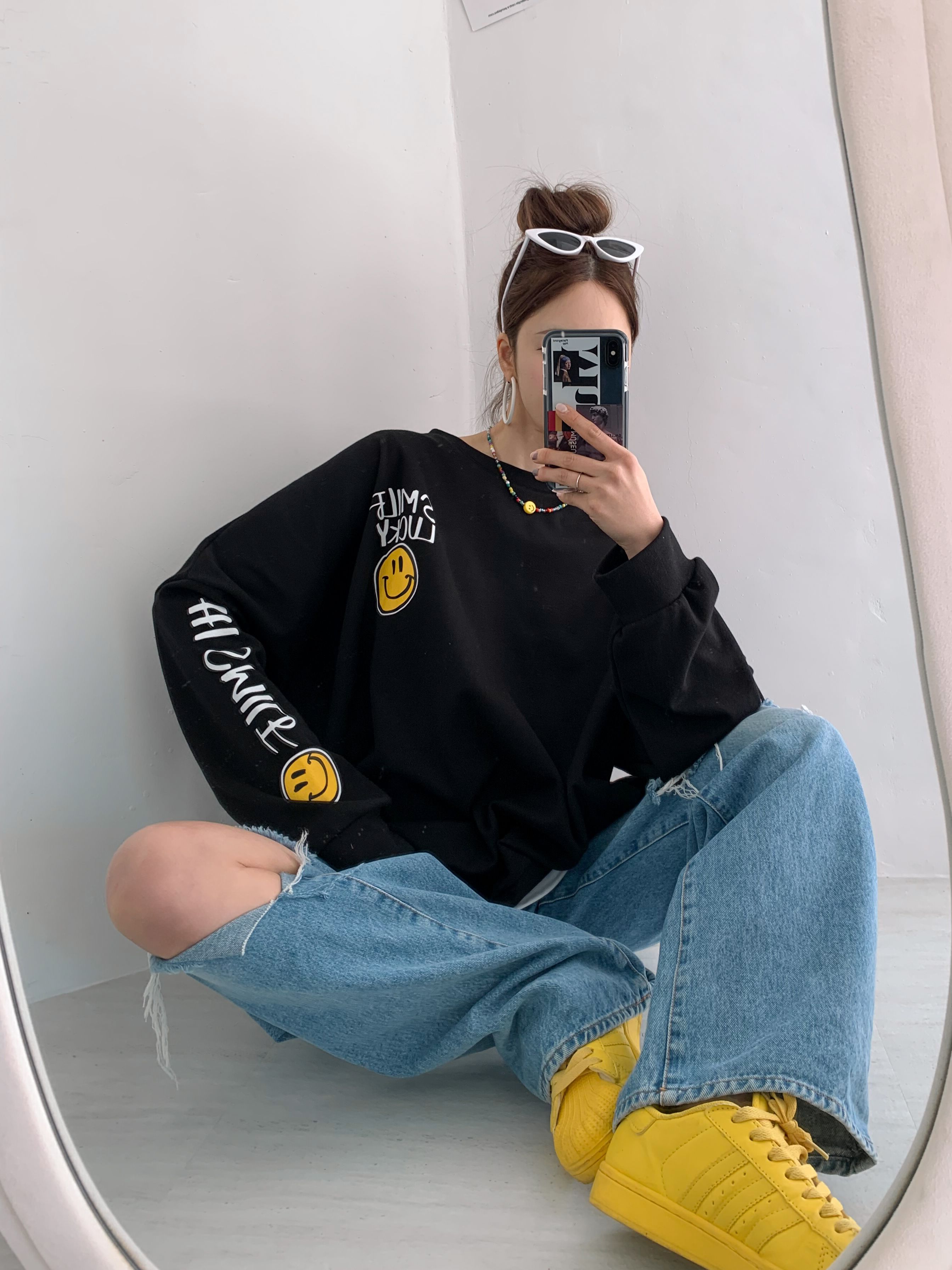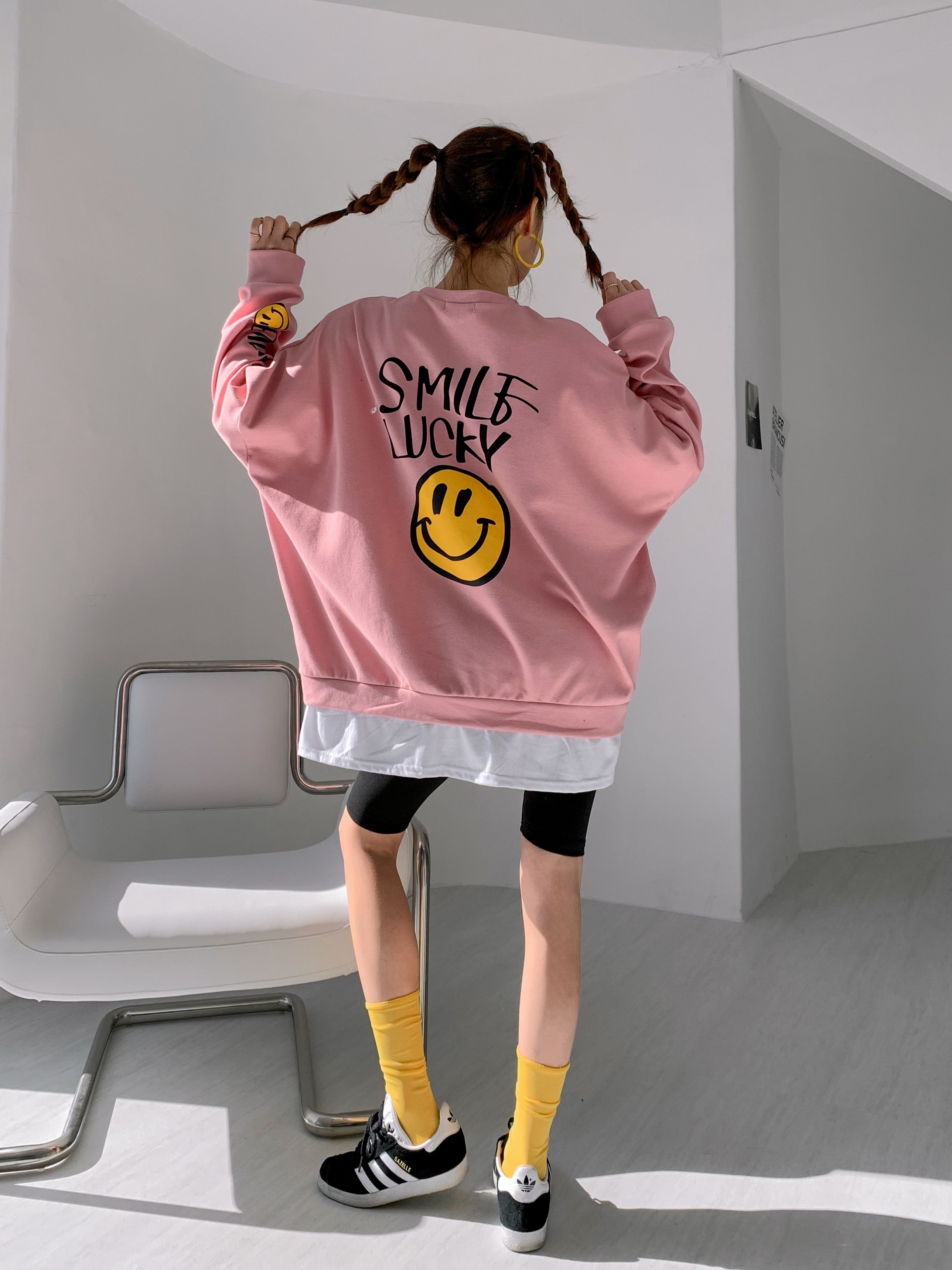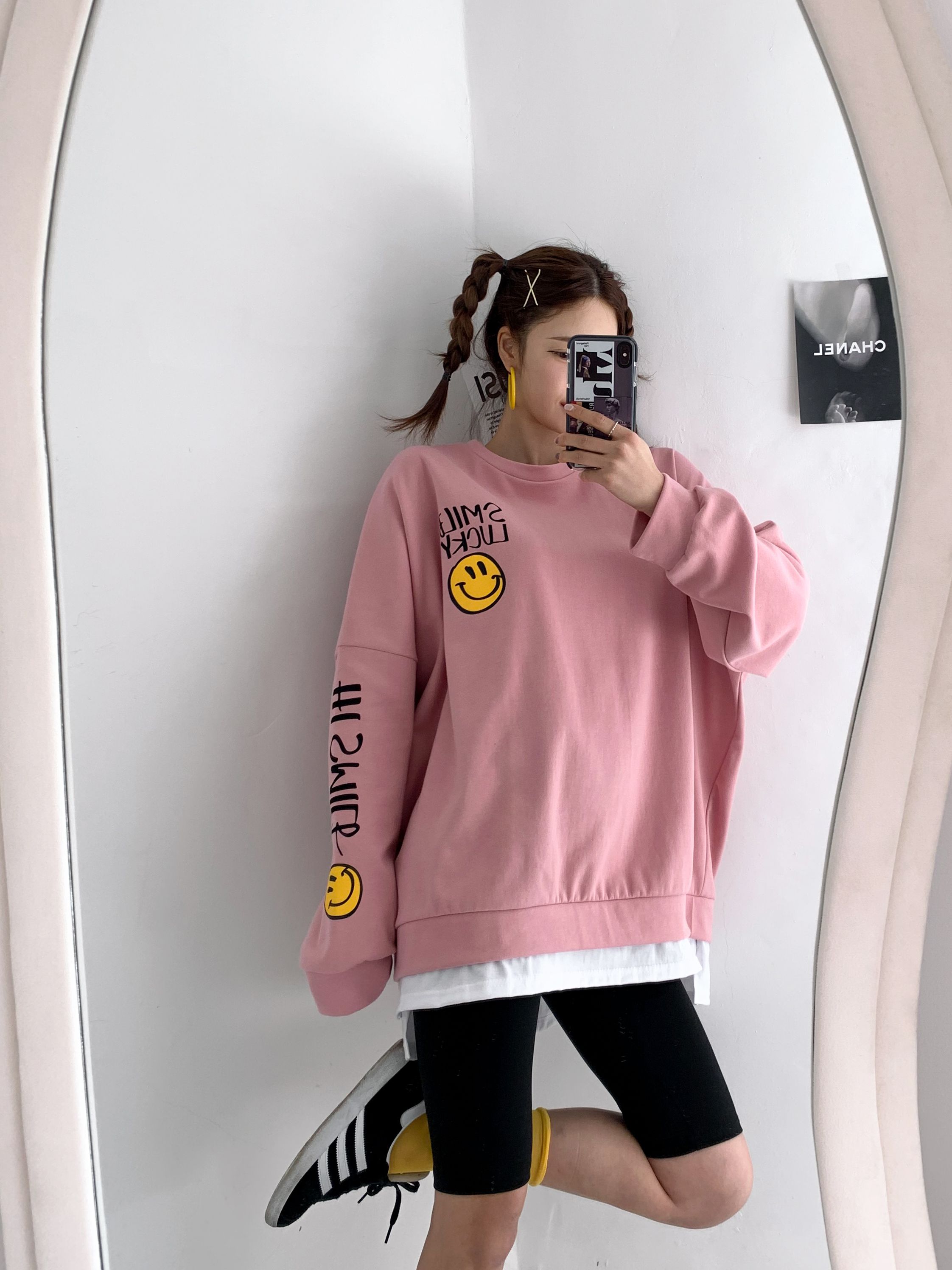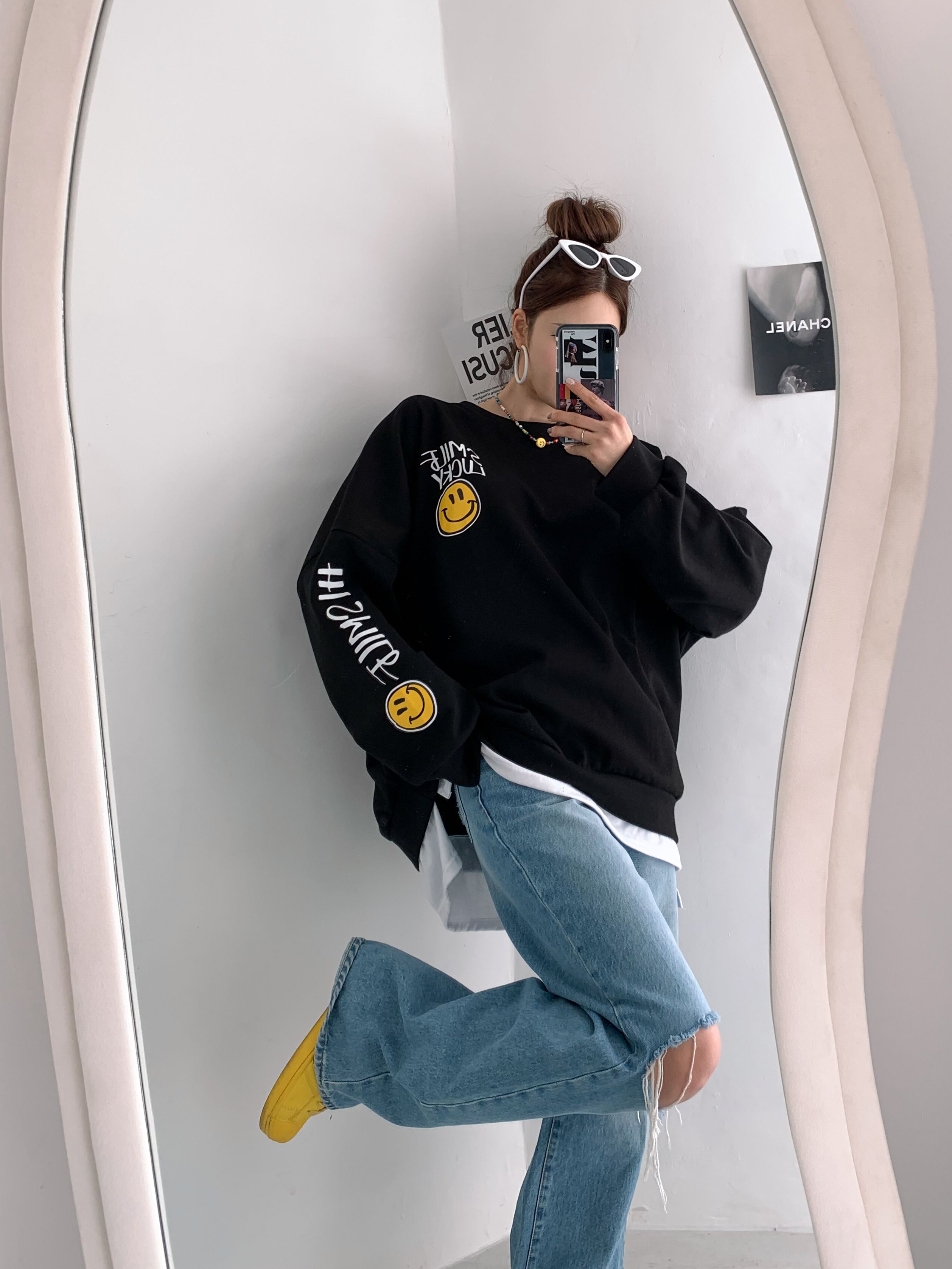 【C55797】韓國BHN 假兩件笑臉上衣-好氣色寬鬆長版微笑印花字母長袖★★