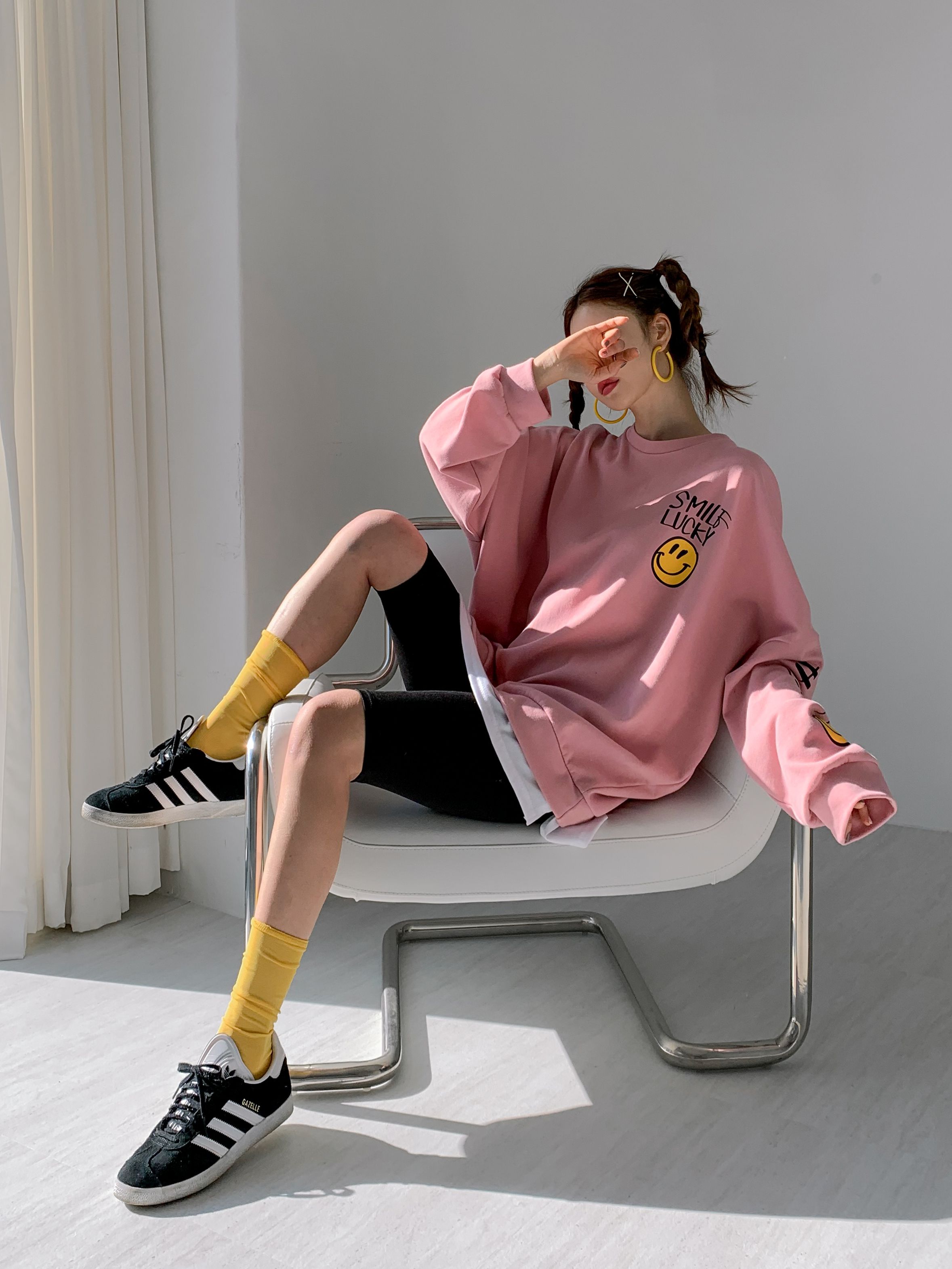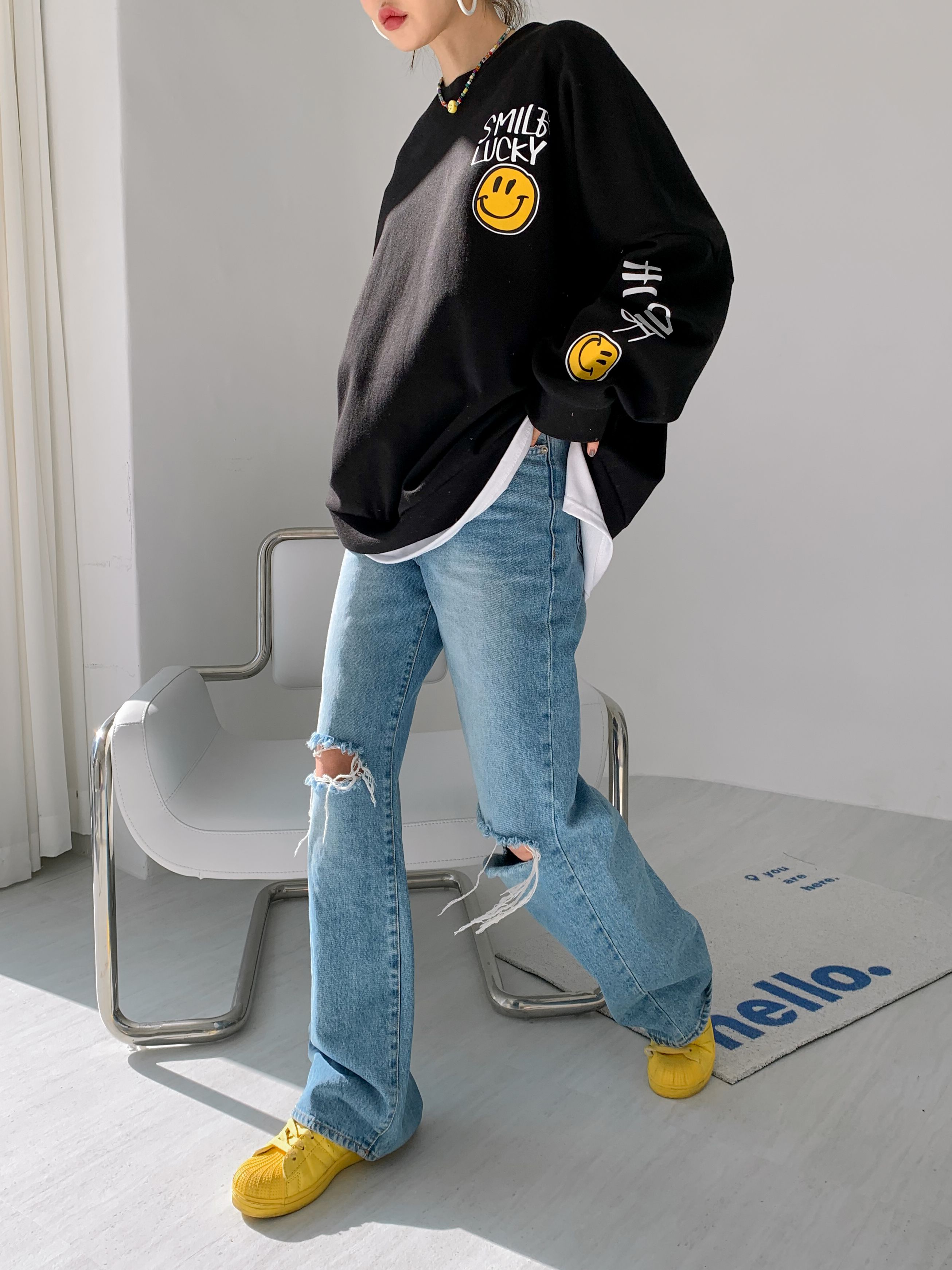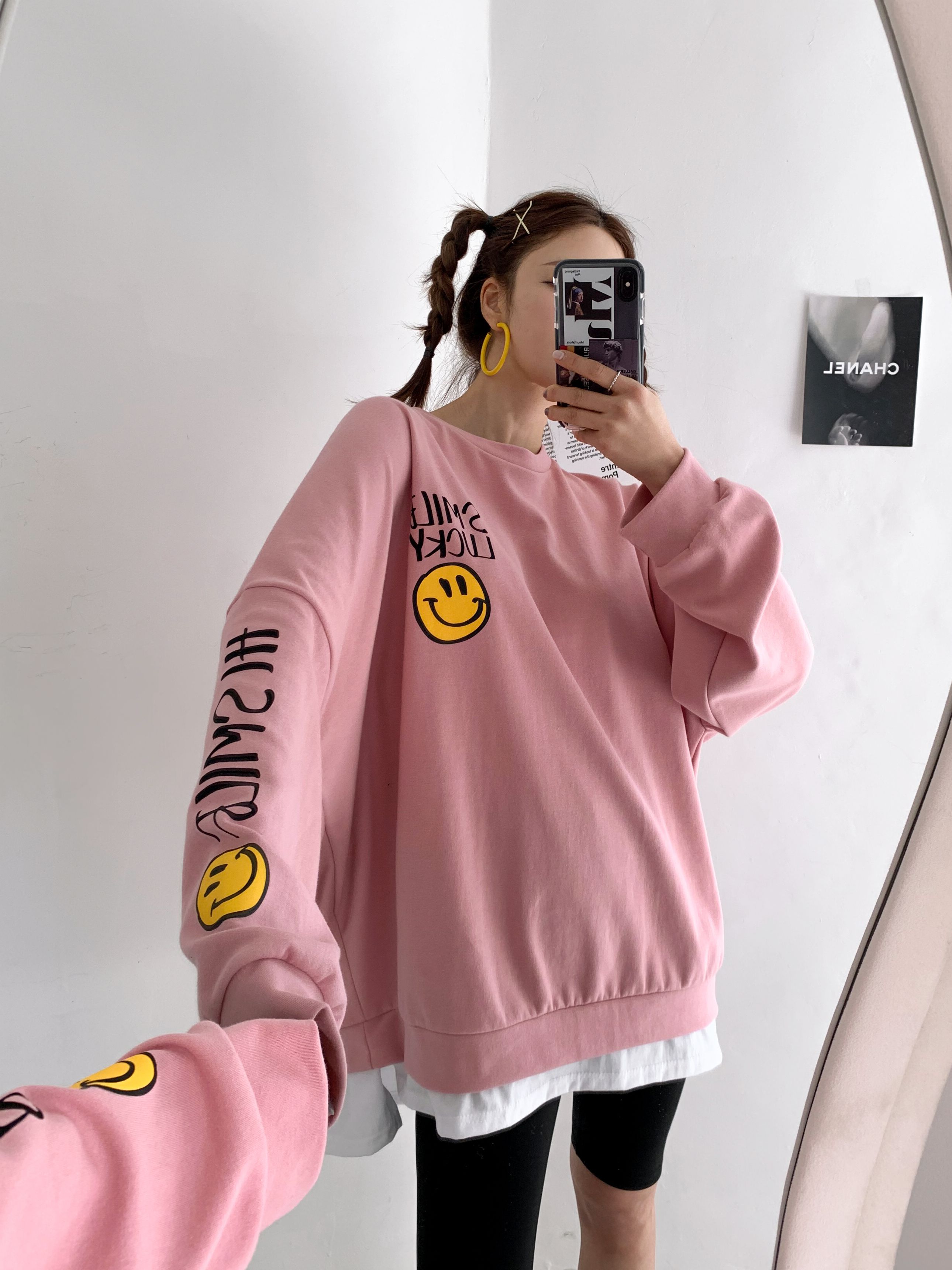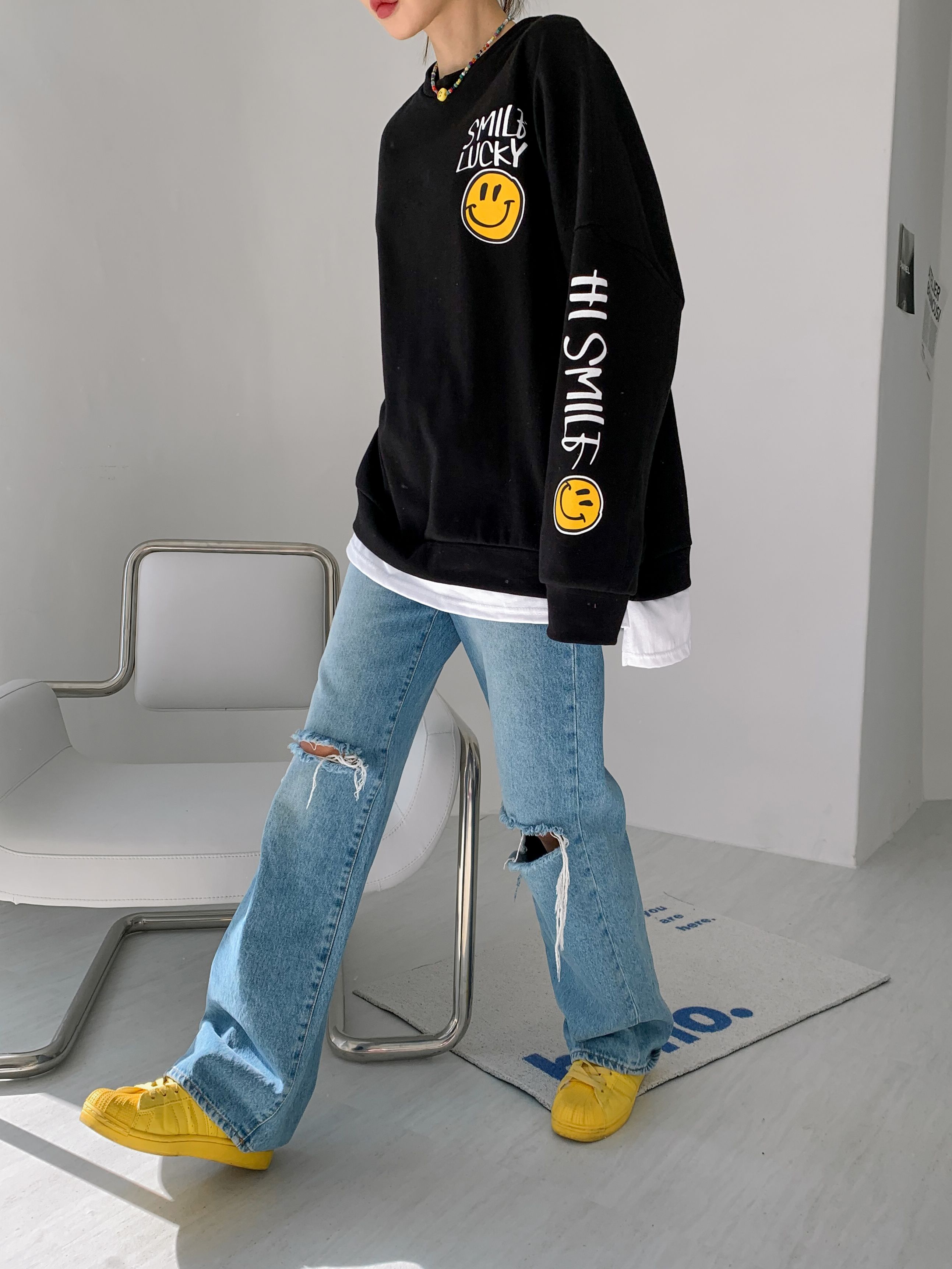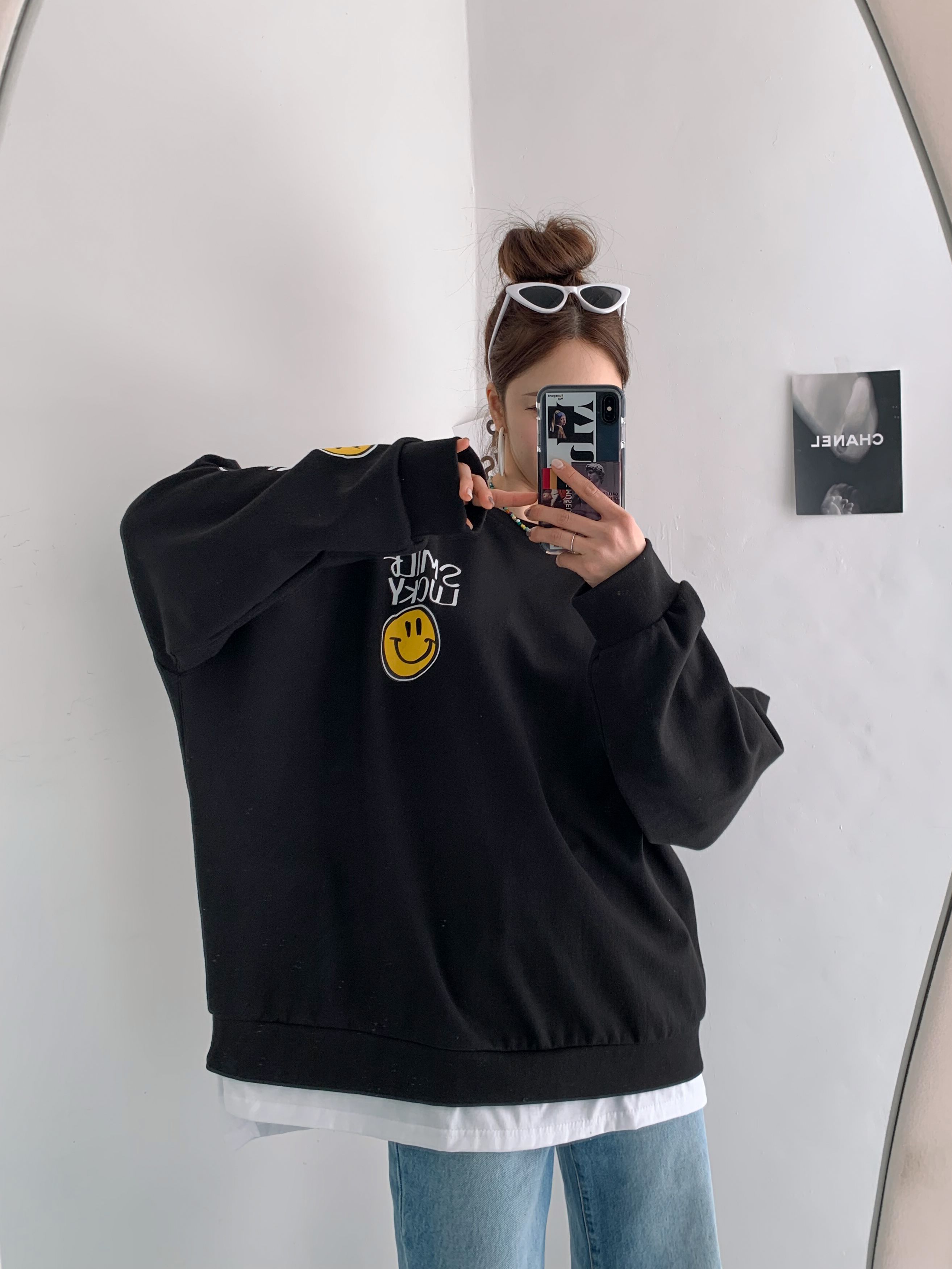【C55797】韓國BHN 假兩件笑臉上衣-好氣色寬鬆長版微笑印花字母長袖★★