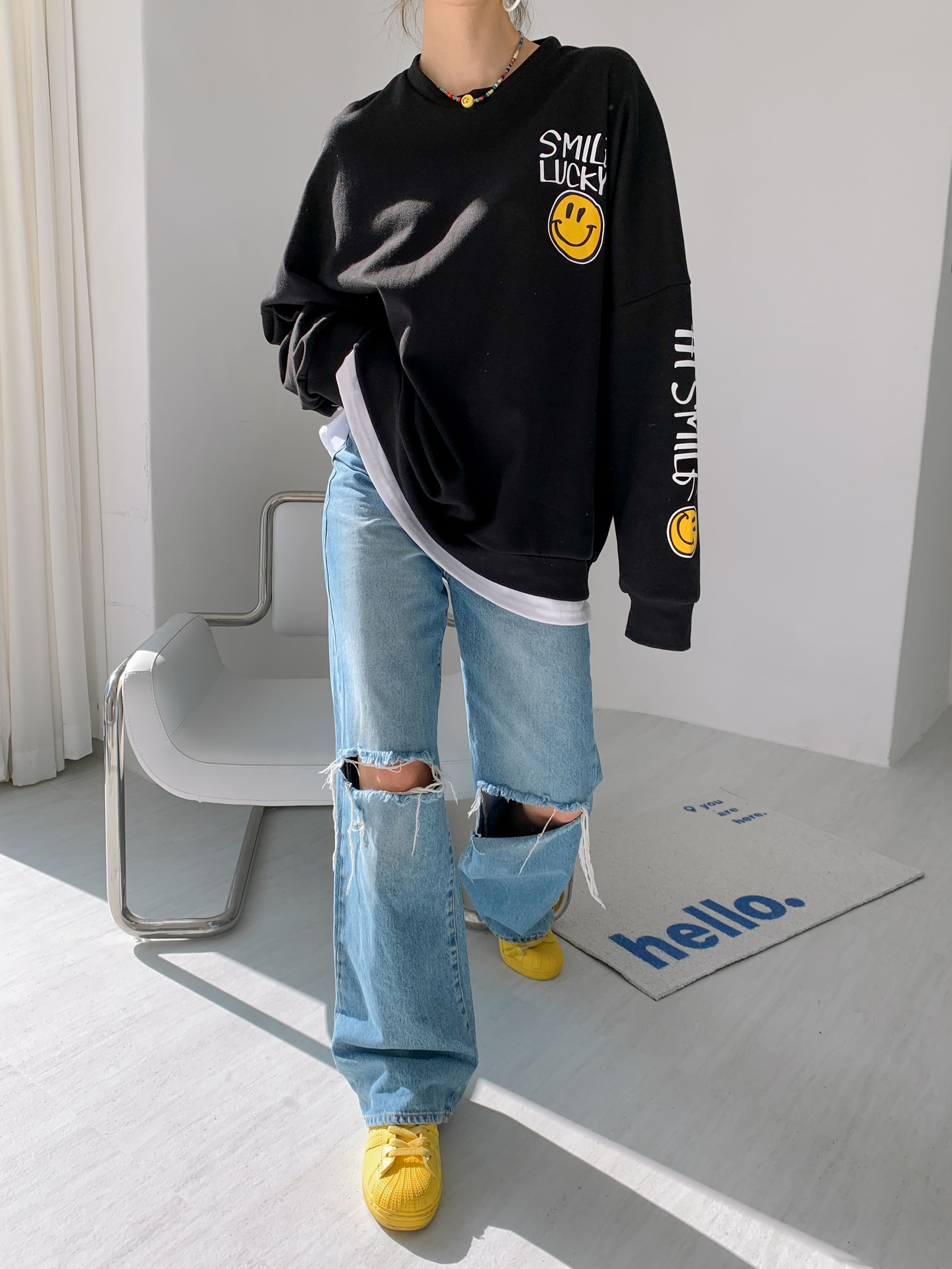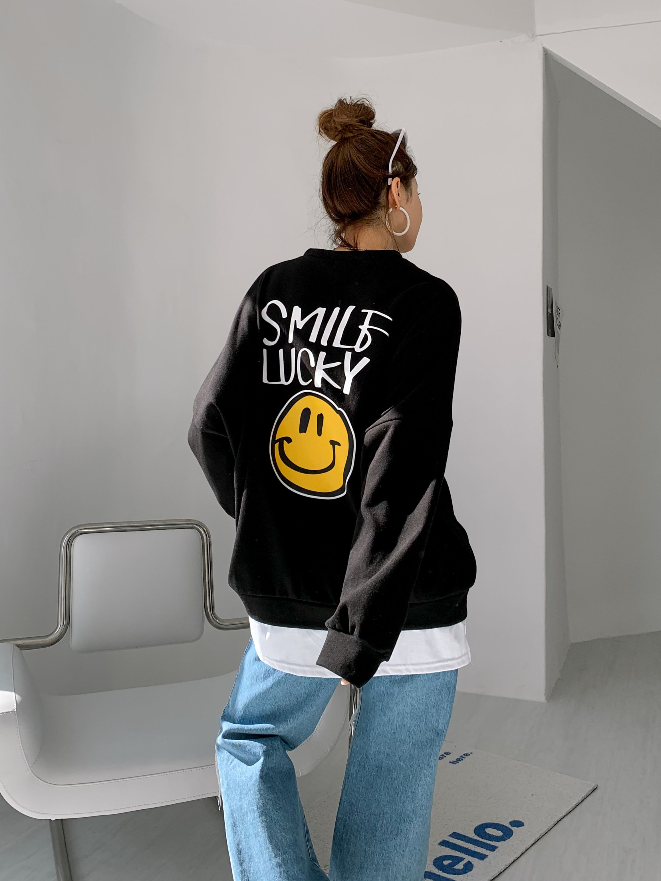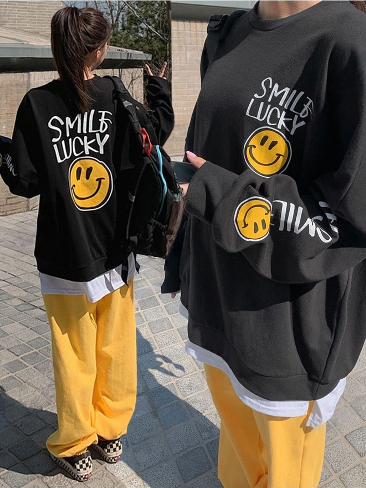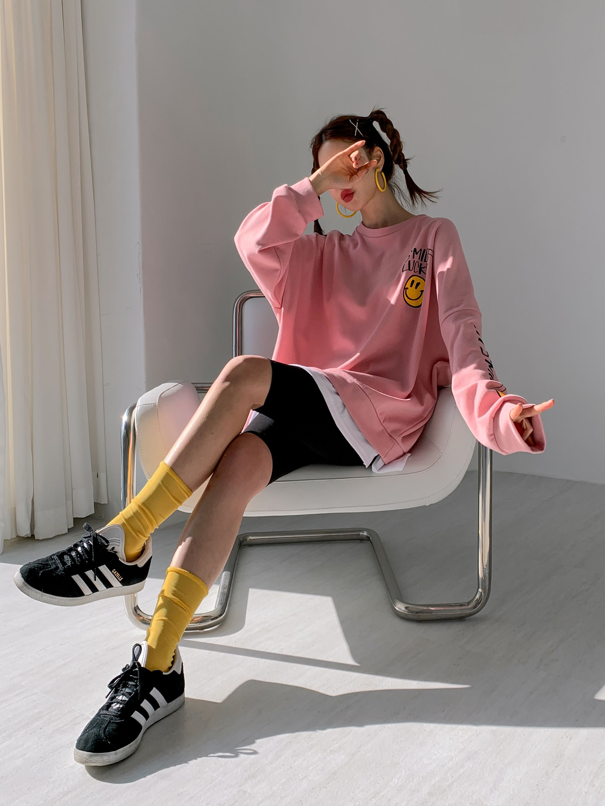 【C55797】韓國BHN 假兩件笑臉上衣-好氣色寬鬆長版微笑印花字母長袖★★