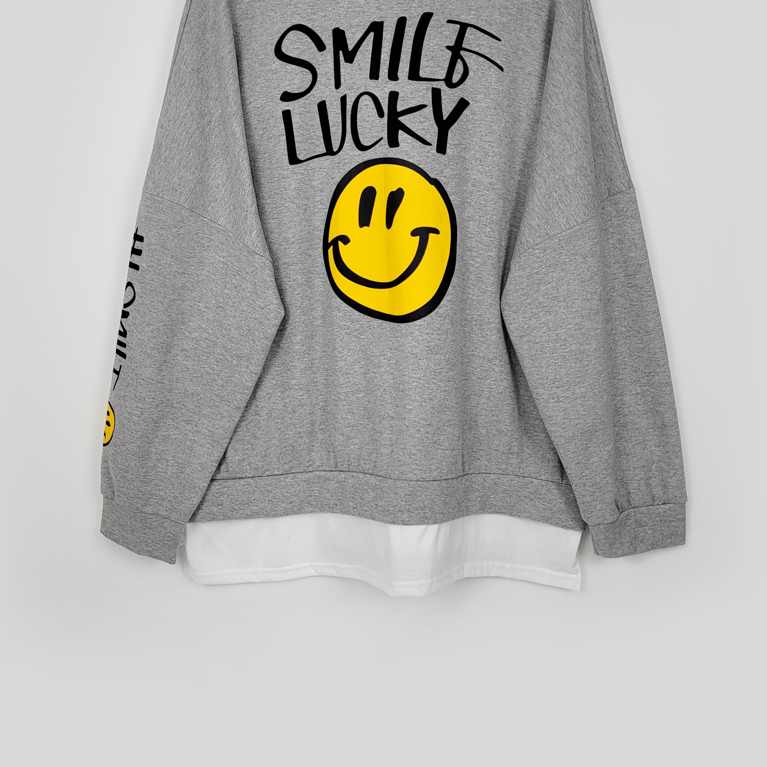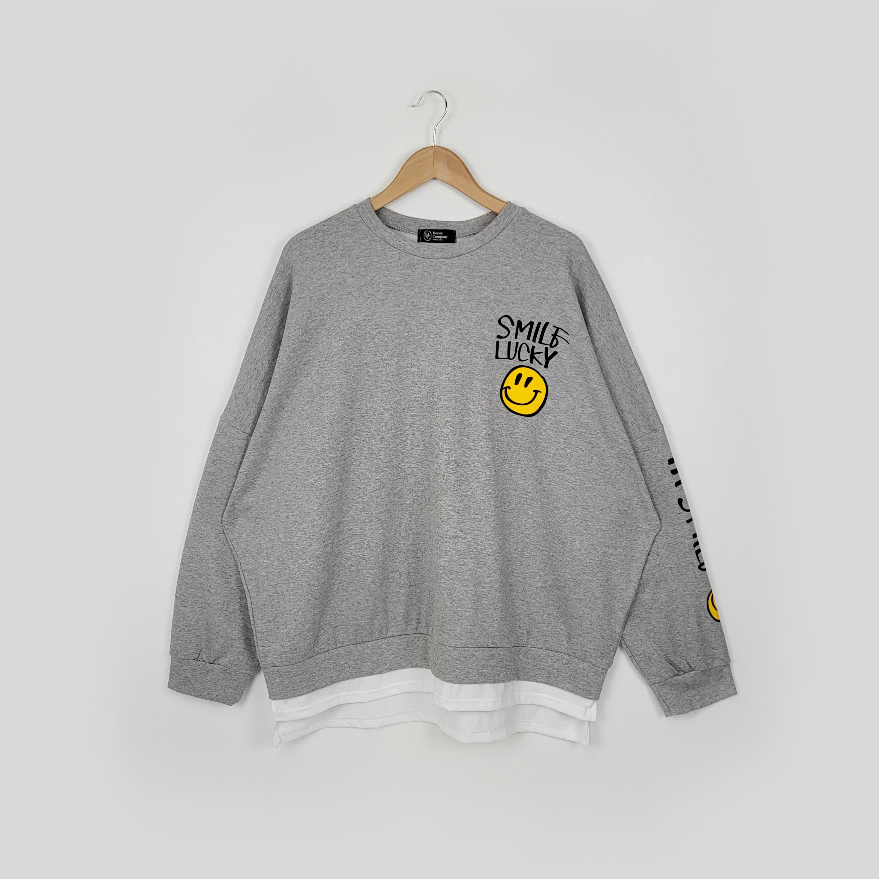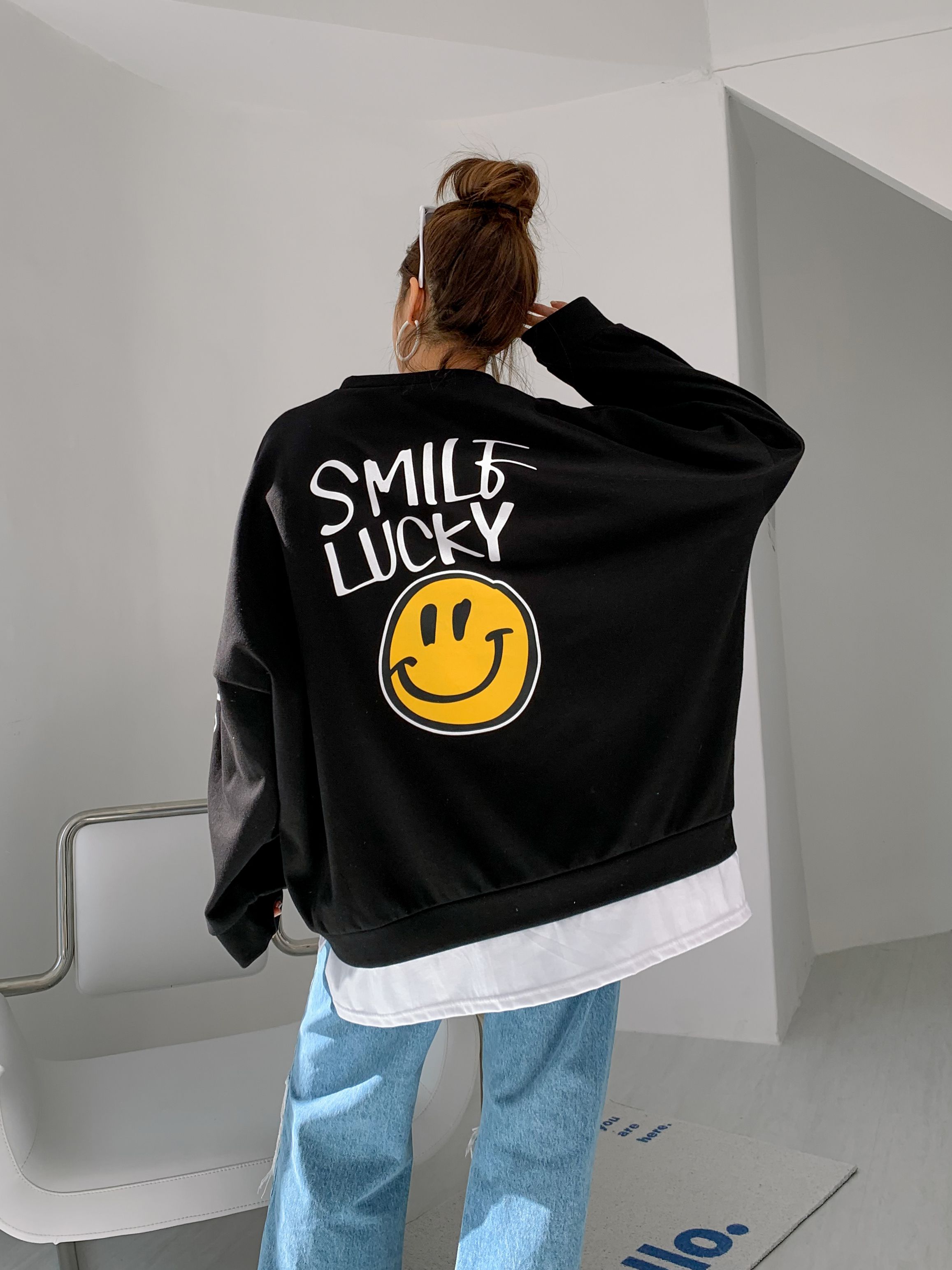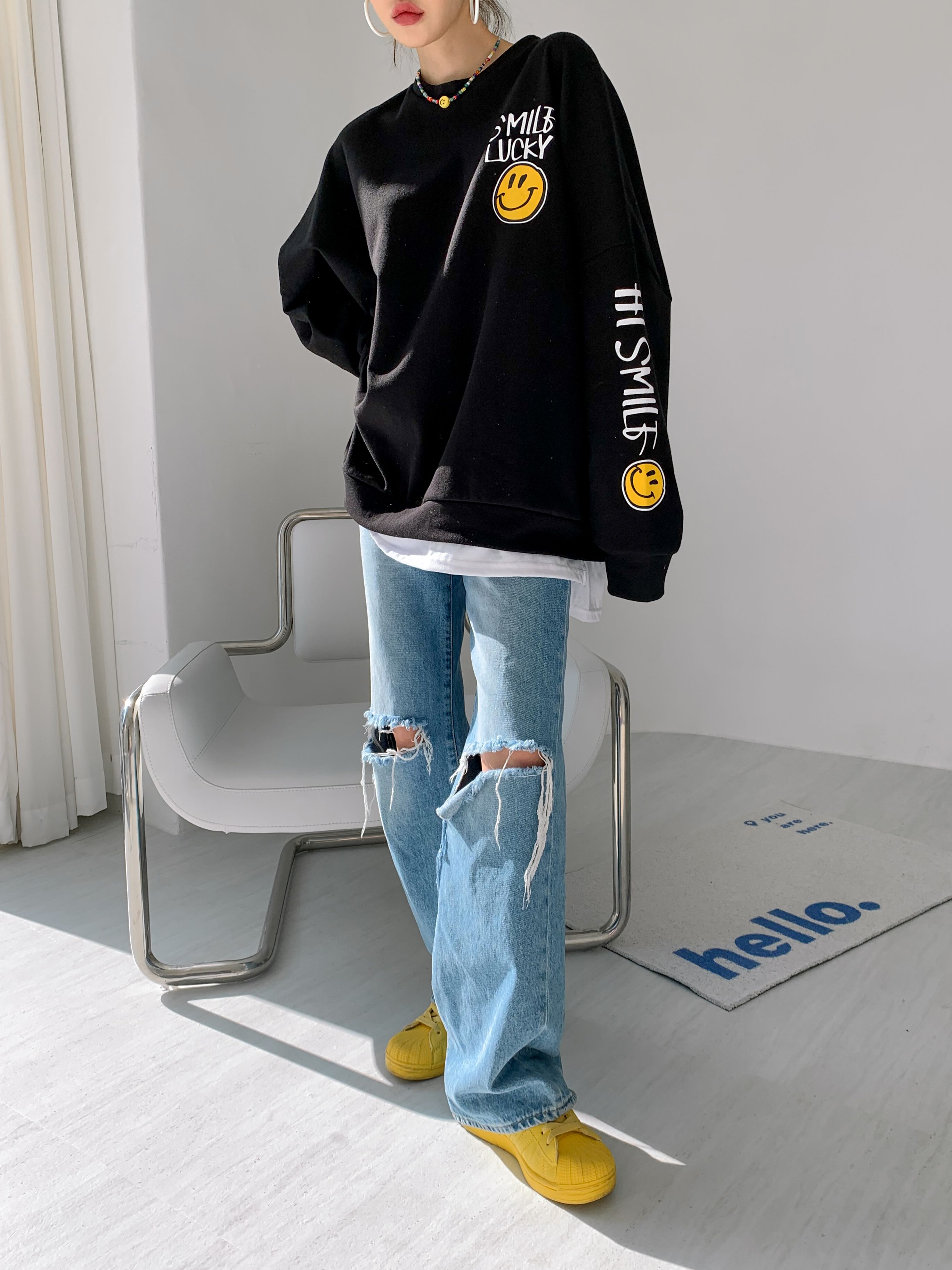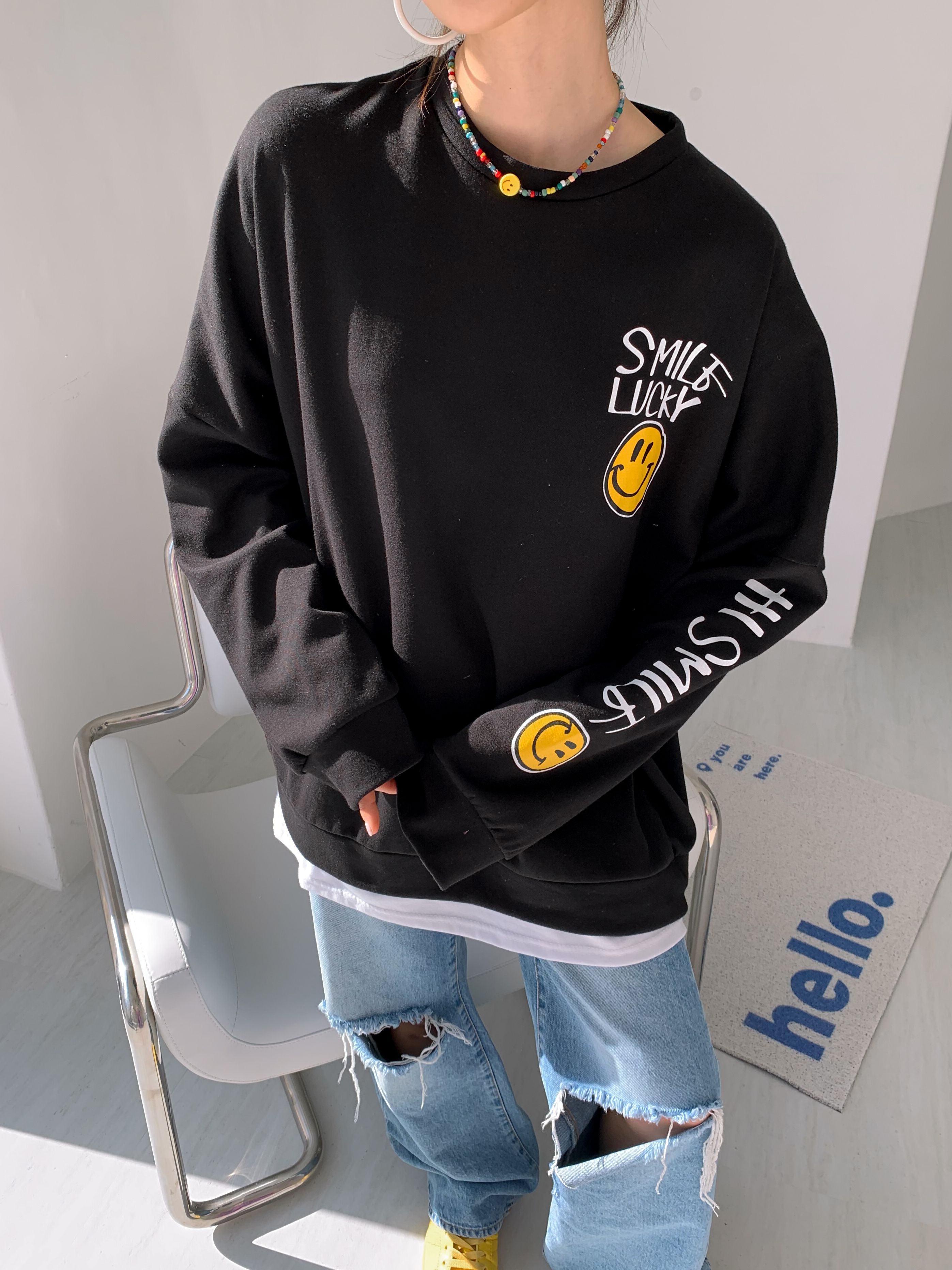 【C55797】韓國BHN 假兩件笑臉上衣-好氣色寬鬆長版微笑印花字母長袖★★
