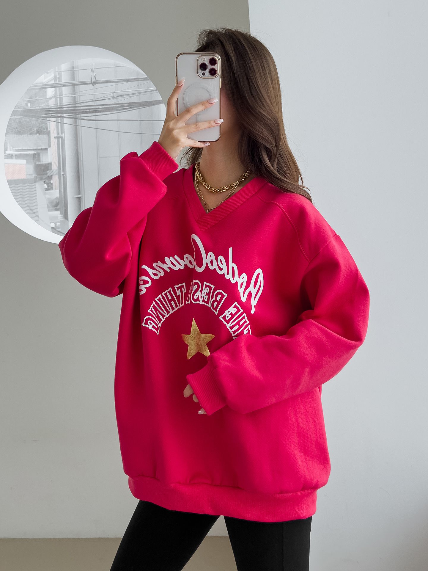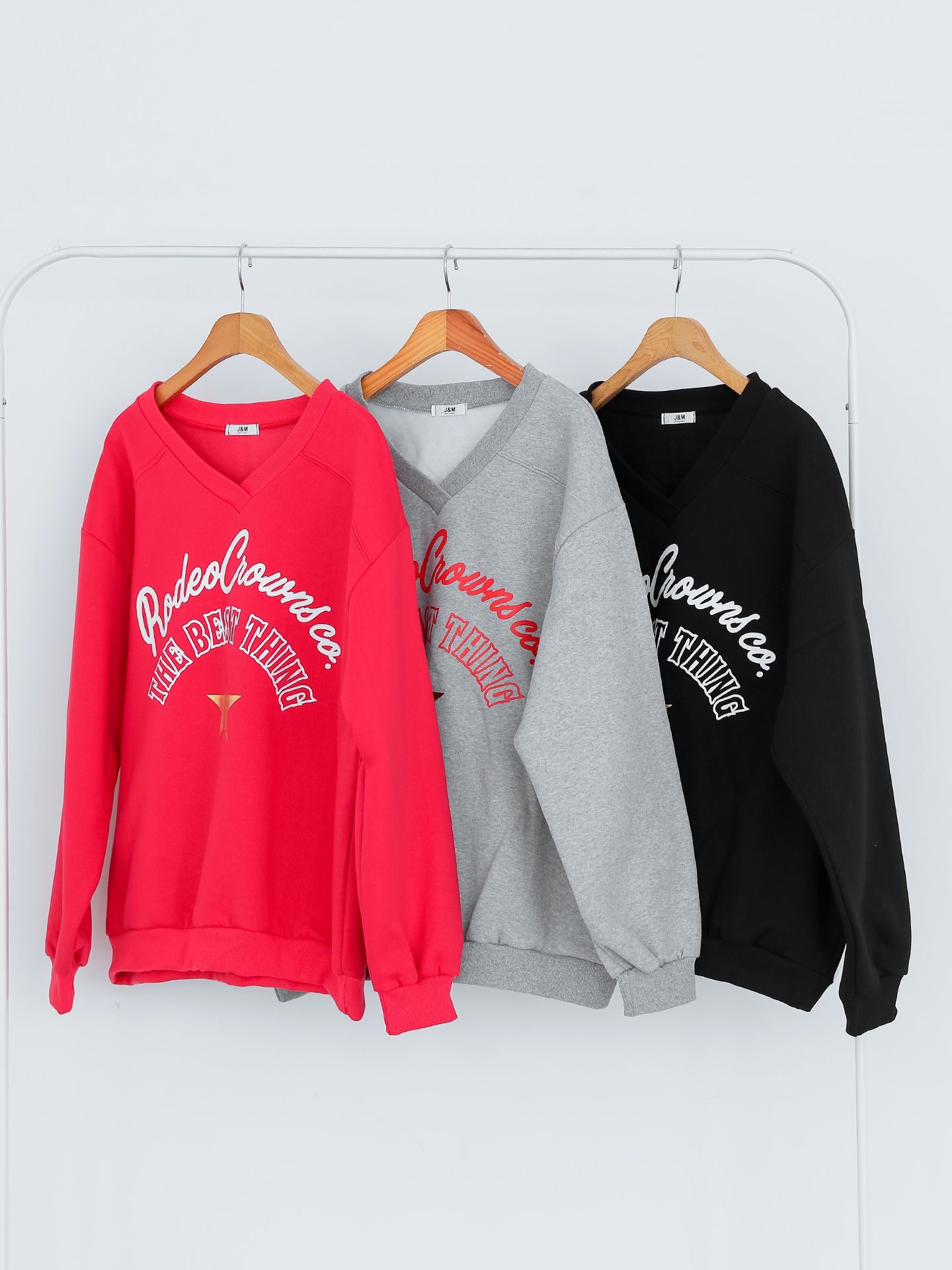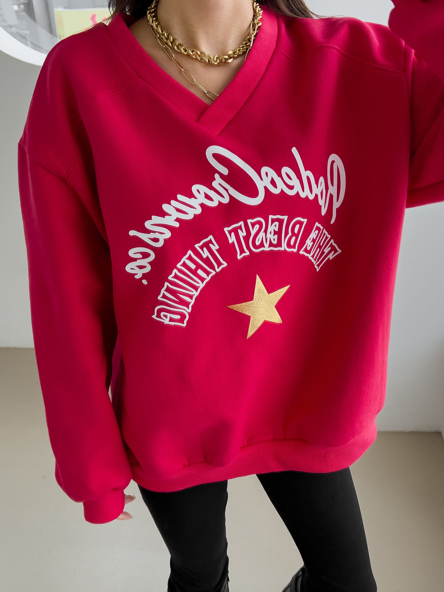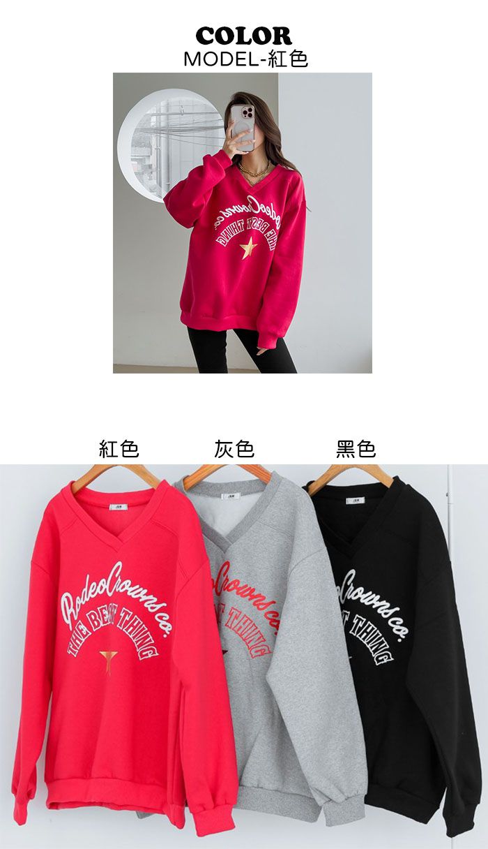 好氣色/厚磅內刷毛/交叉V領/寬鬆長版/膠印字母/星星印花 - 休閒居家英文字母上衣字母T恤星星印花星星字母上衣長袖上衣大學T寬鬆大尺碼上衣長版上衣紅色灰色黑色