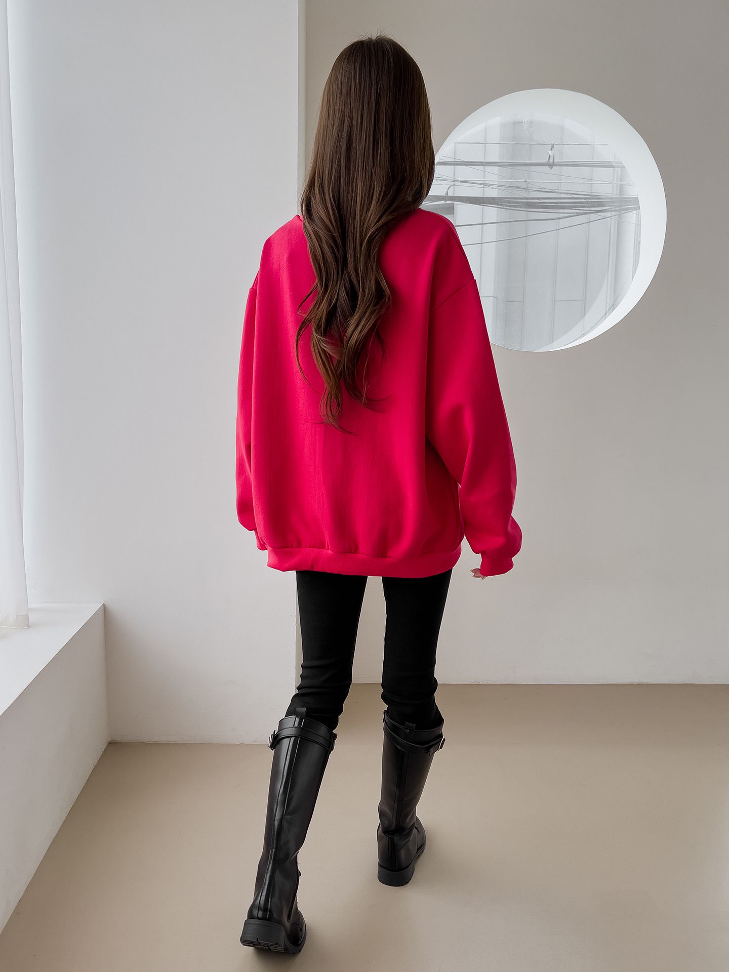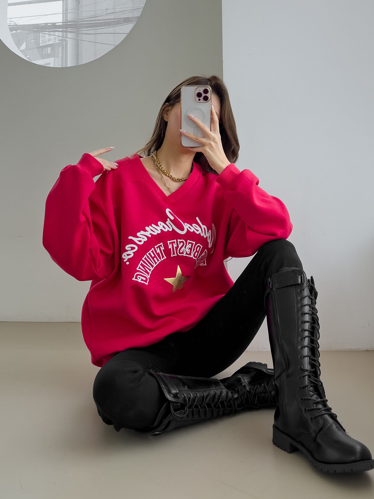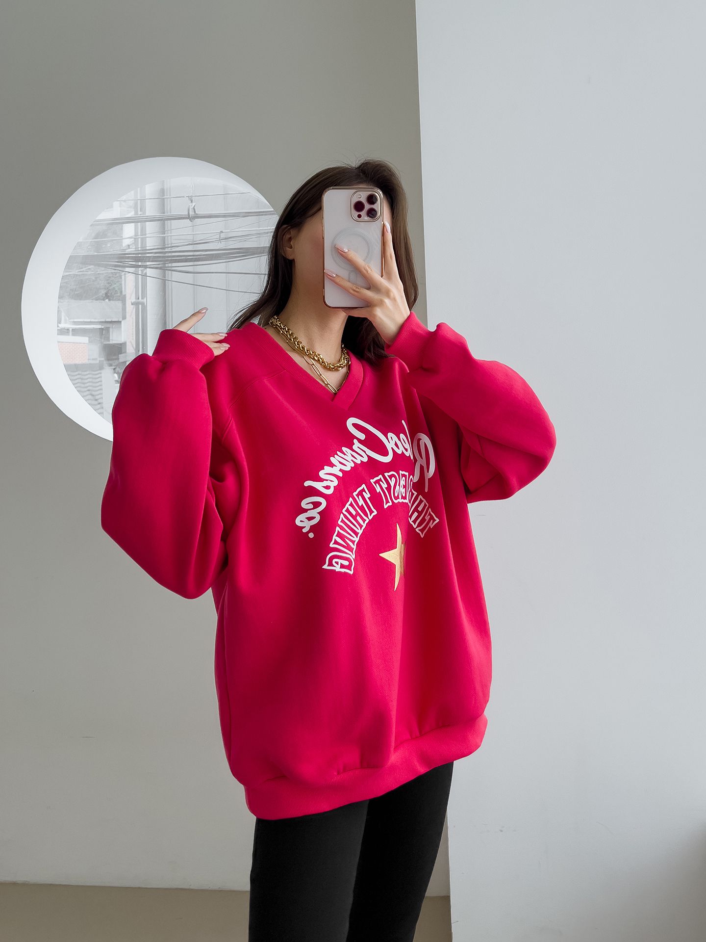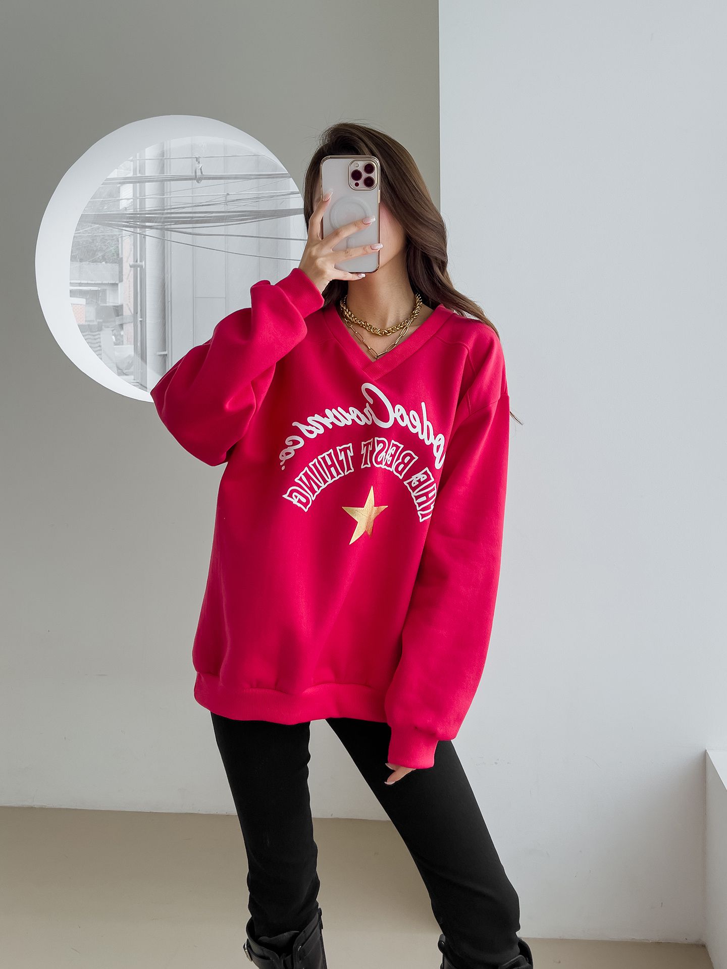 好氣色/厚磅內刷毛/交叉V領/寬鬆長版/膠印字母/星星印花 - 休閒居家英文字母上衣字母T恤星星印花星星字母上衣長袖上衣大學T寬鬆大尺碼上衣長版上衣紅色灰色黑色
