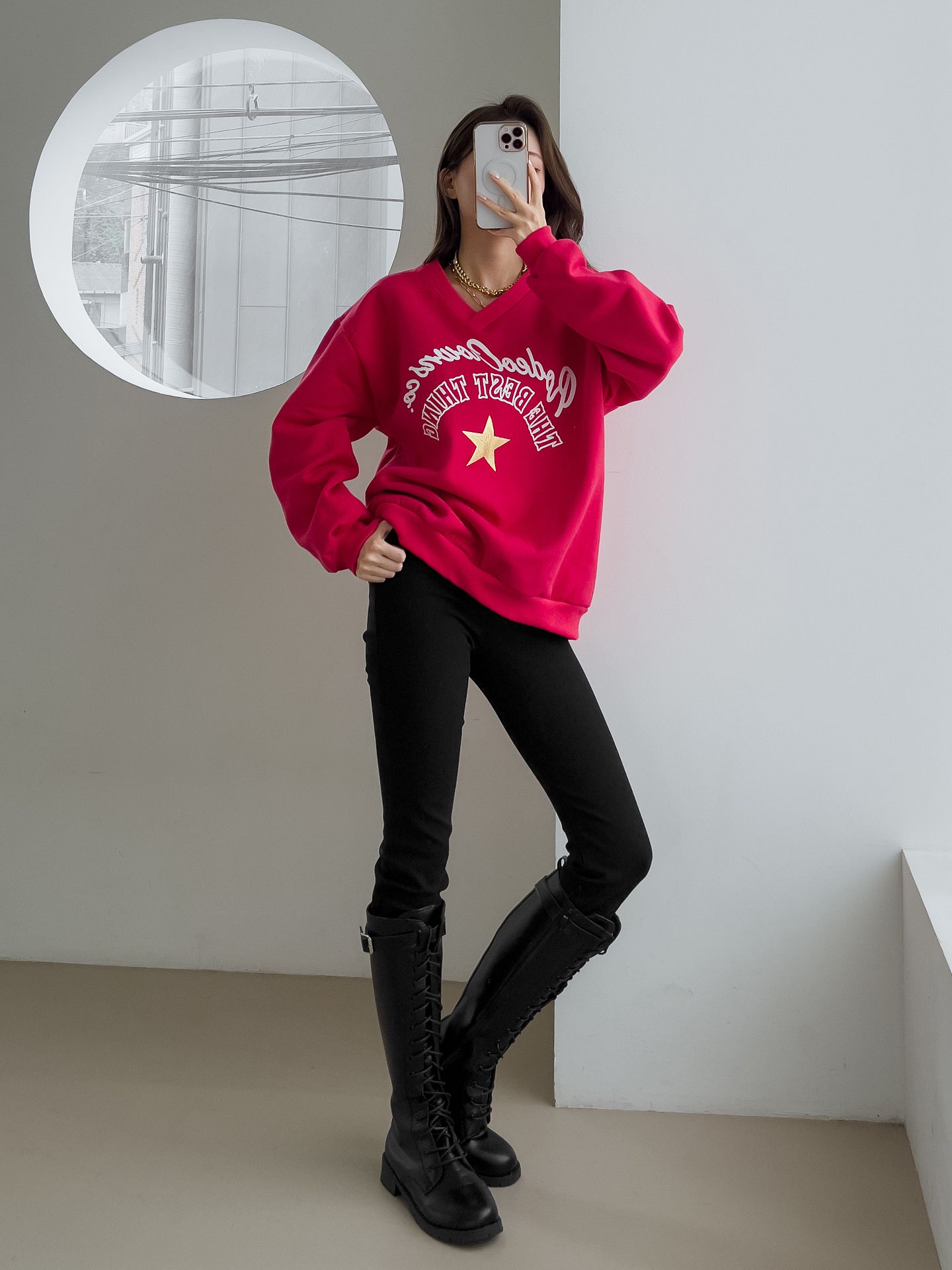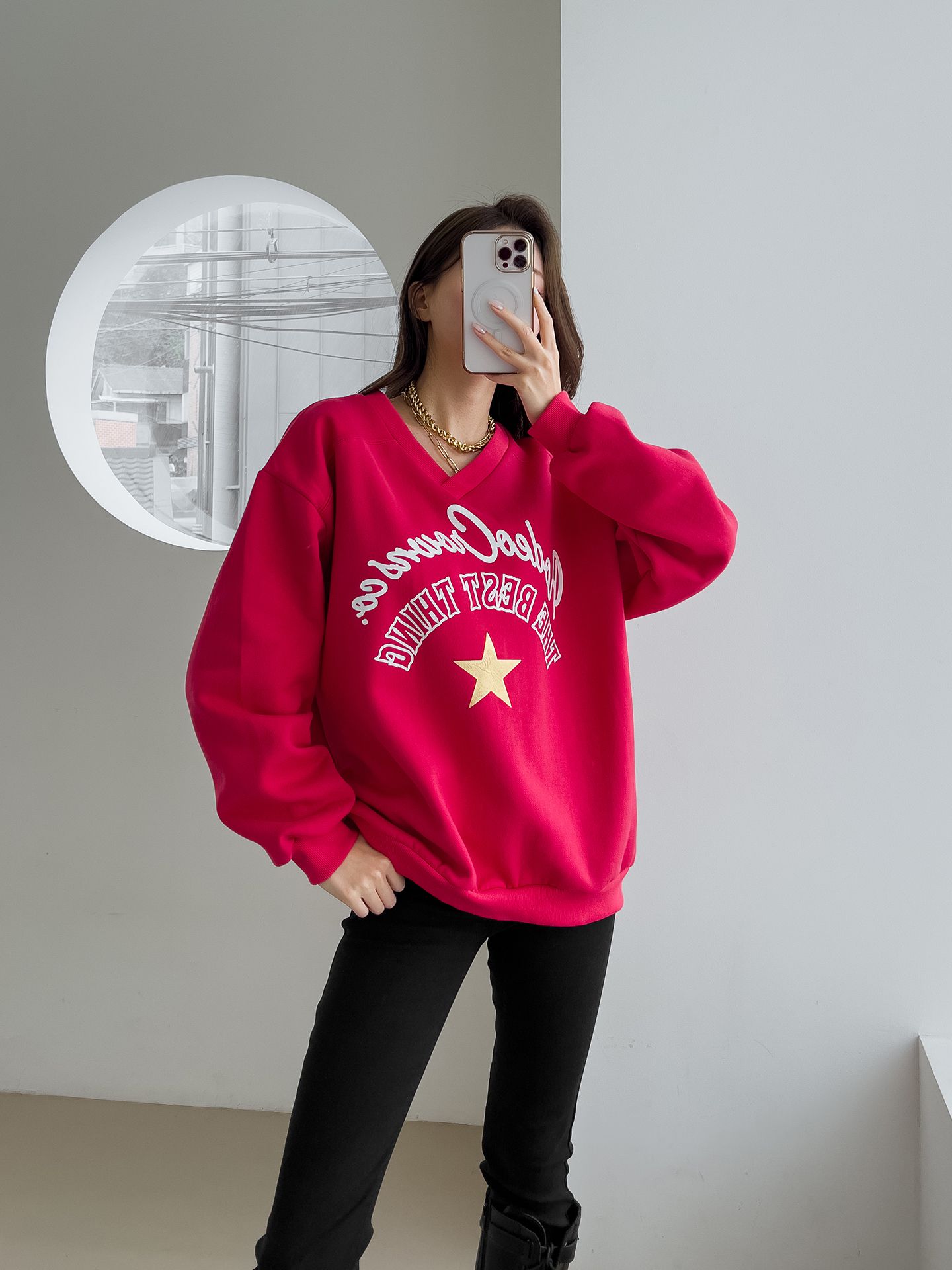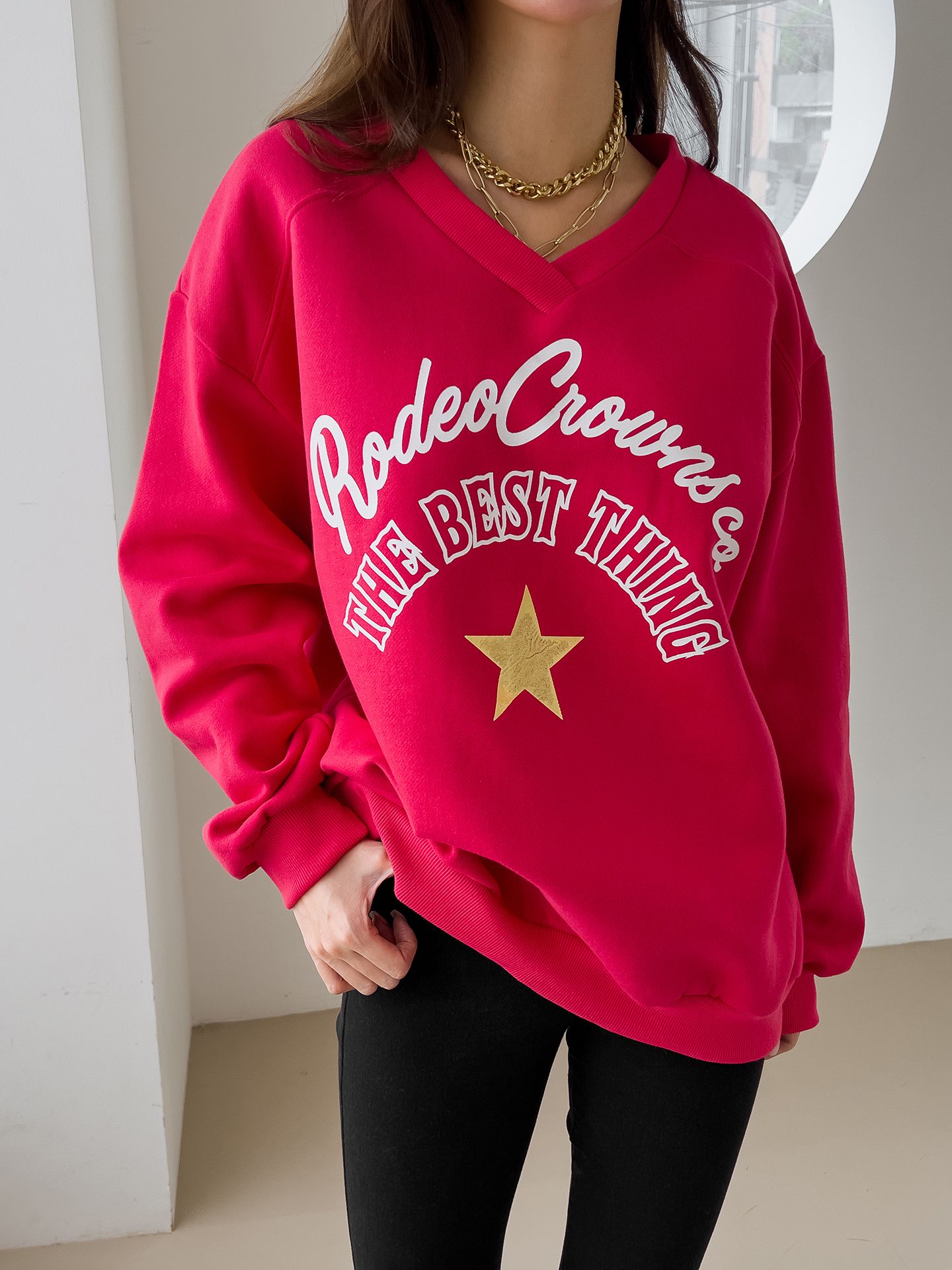 【C55799】韓國JNN 星星字母上衣-好氣色內刷毛V領寬鬆長版印花長袖★★
