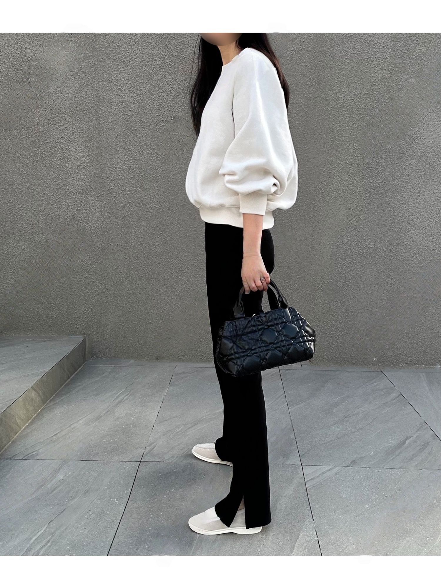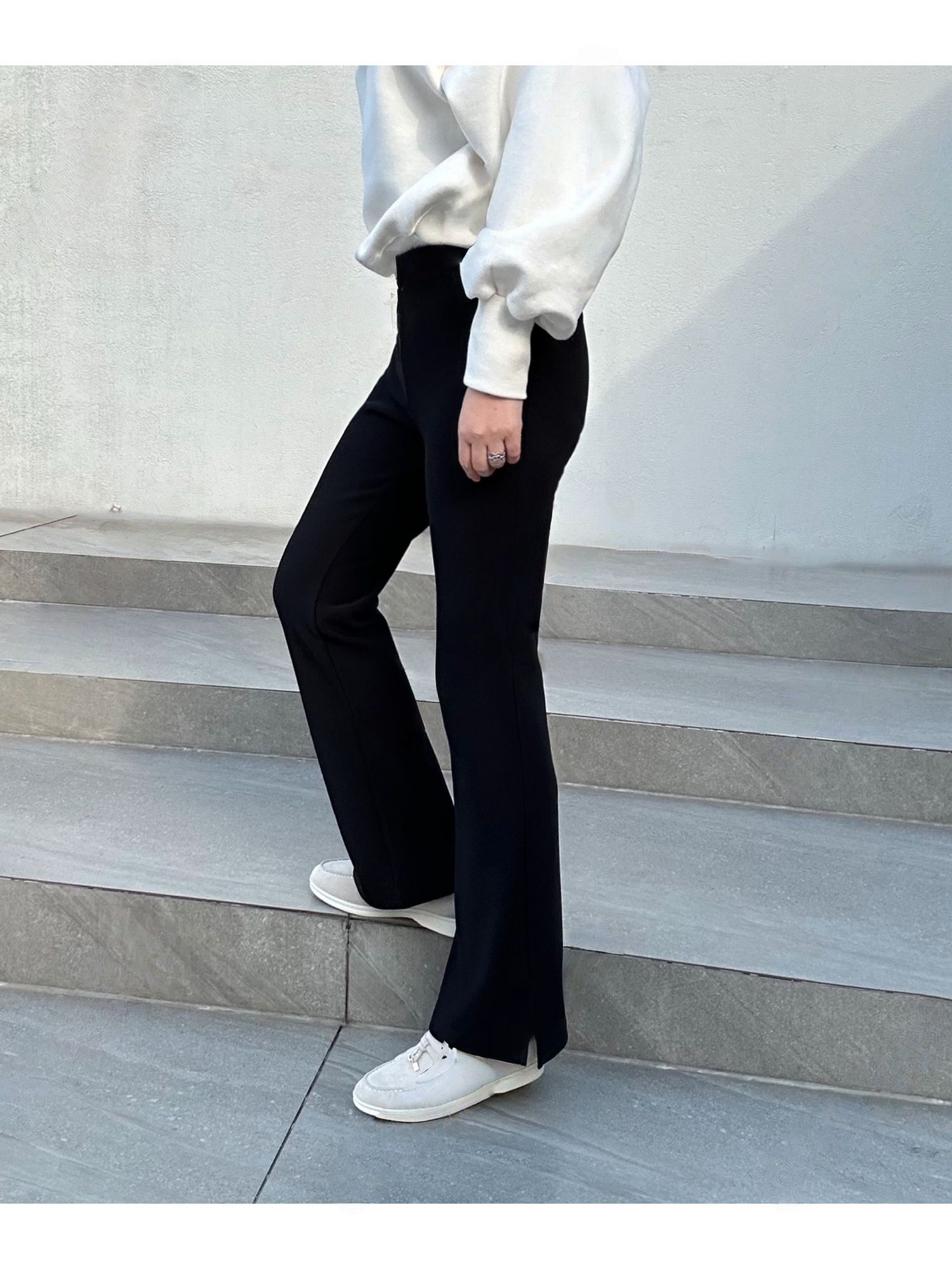 兩種尺寸/加寬褲頭/高腰褲/後口袋/褲腳開衩/彈力面料/包臀貼腿 - 休閒居家上班族簡約百搭素面高腰收腹喇叭褲長褲多尺寸FL黑色