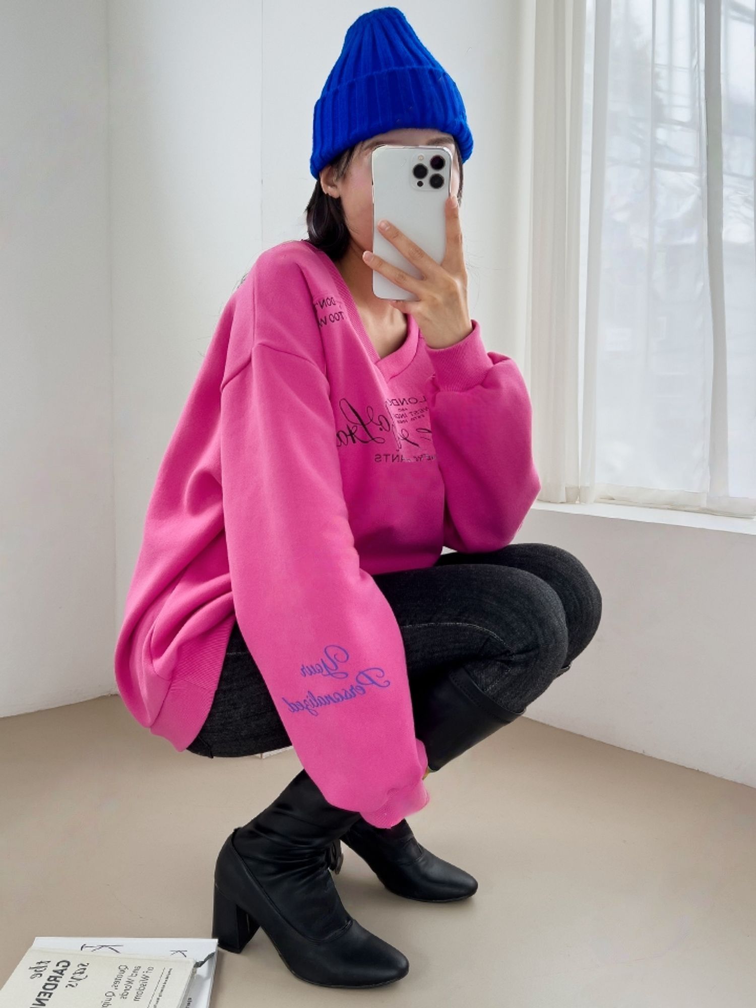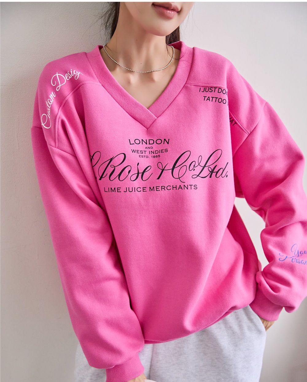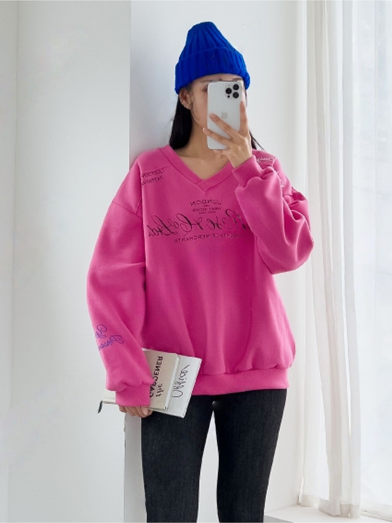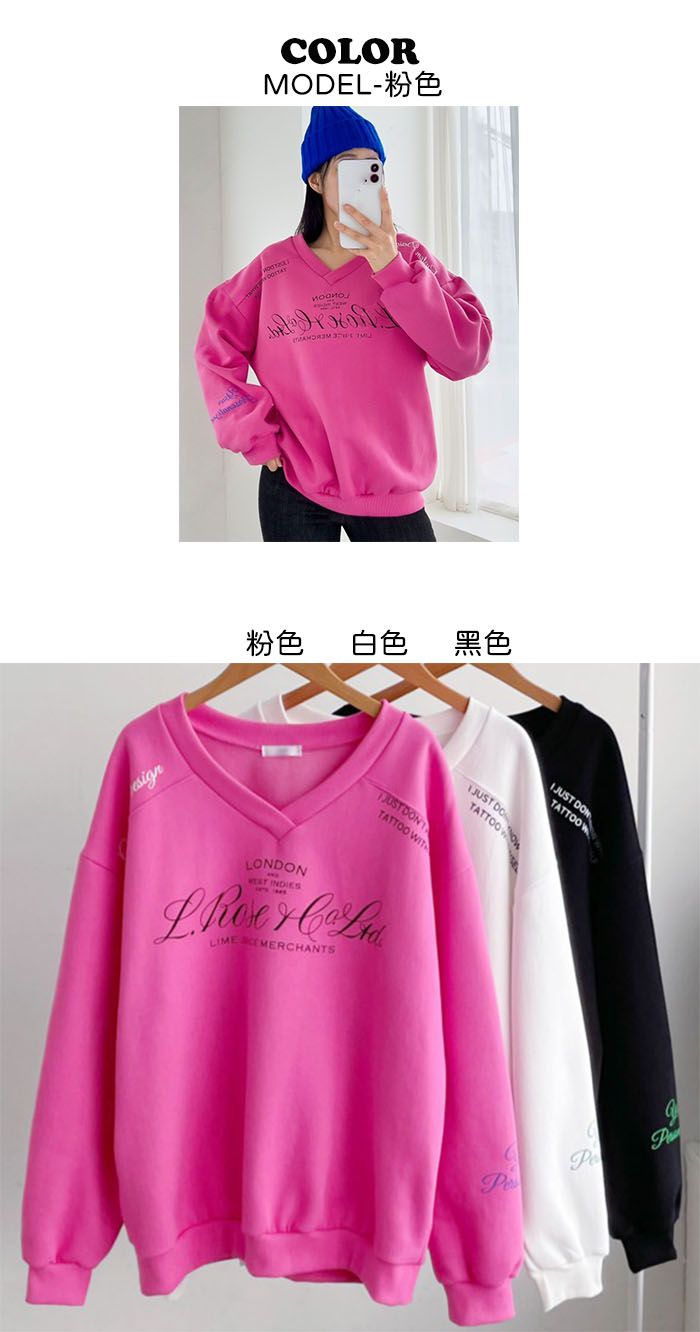 膠印字母/跳色字母/深V領/內刷毛/寬鬆長版/好氣色 - 休閒居家英文字母上衣字母T恤草寫字母大學T長袖上衣寬鬆大尺碼上衣長版上衣粉色黑色白色