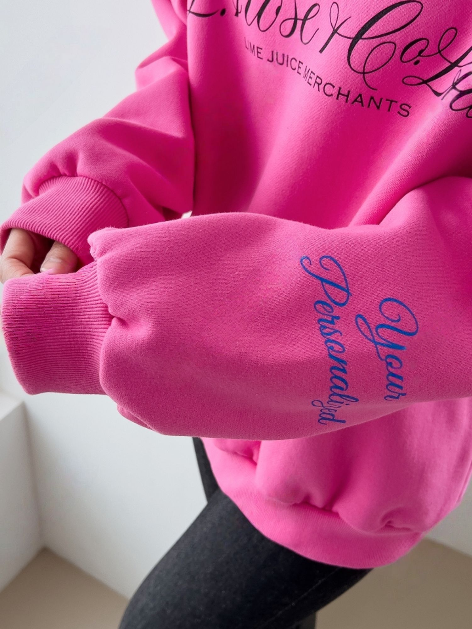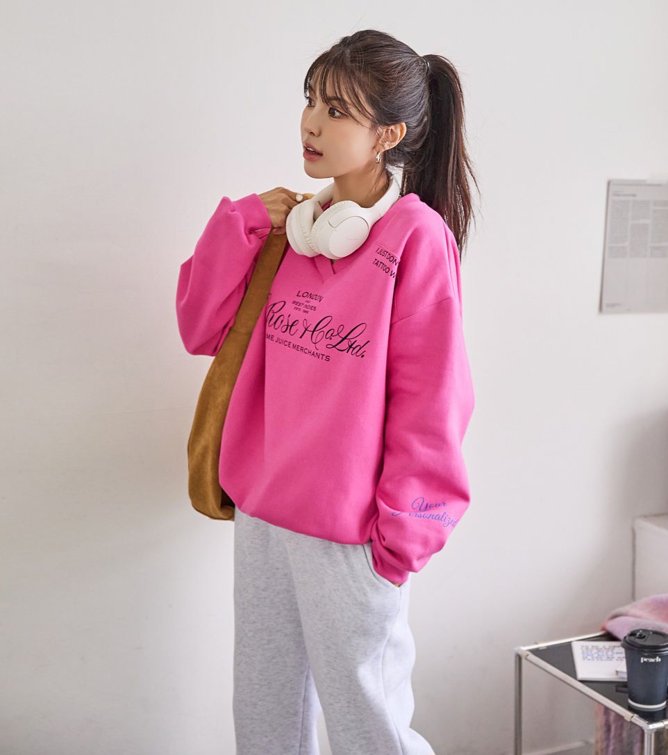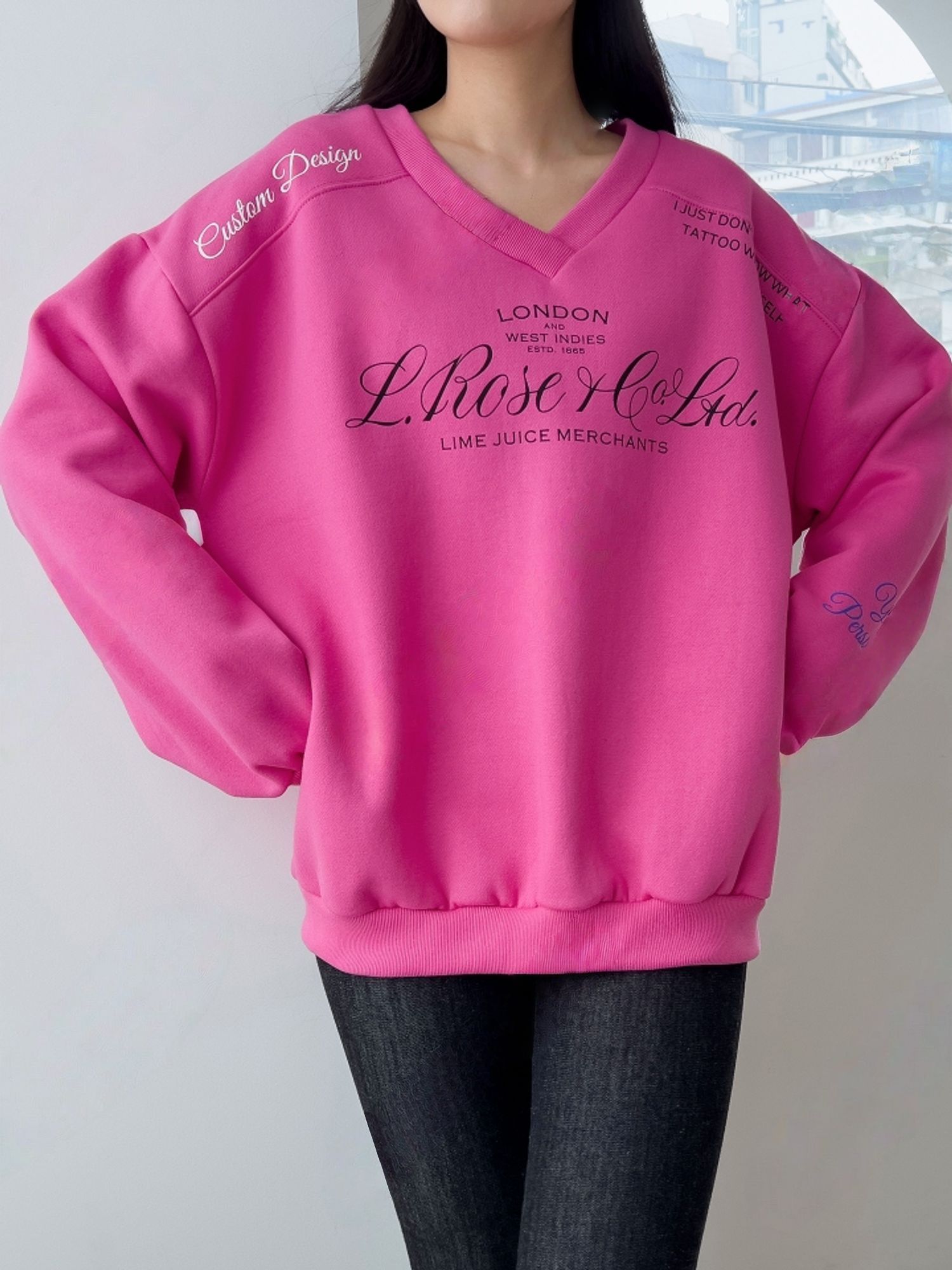 膠印字母/跳色字母/深V領/內刷毛/寬鬆長版/好氣色 - 休閒居家英文字母上衣字母T恤草寫字母大學T長袖上衣寬鬆大尺碼上衣長版上衣粉色黑色白色