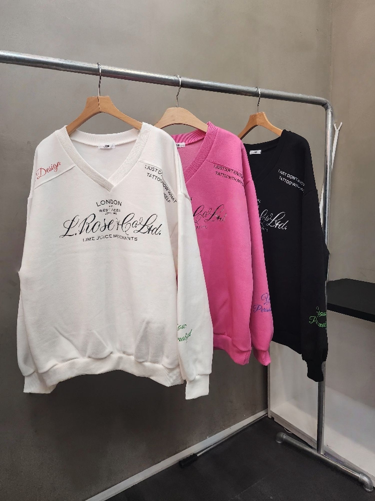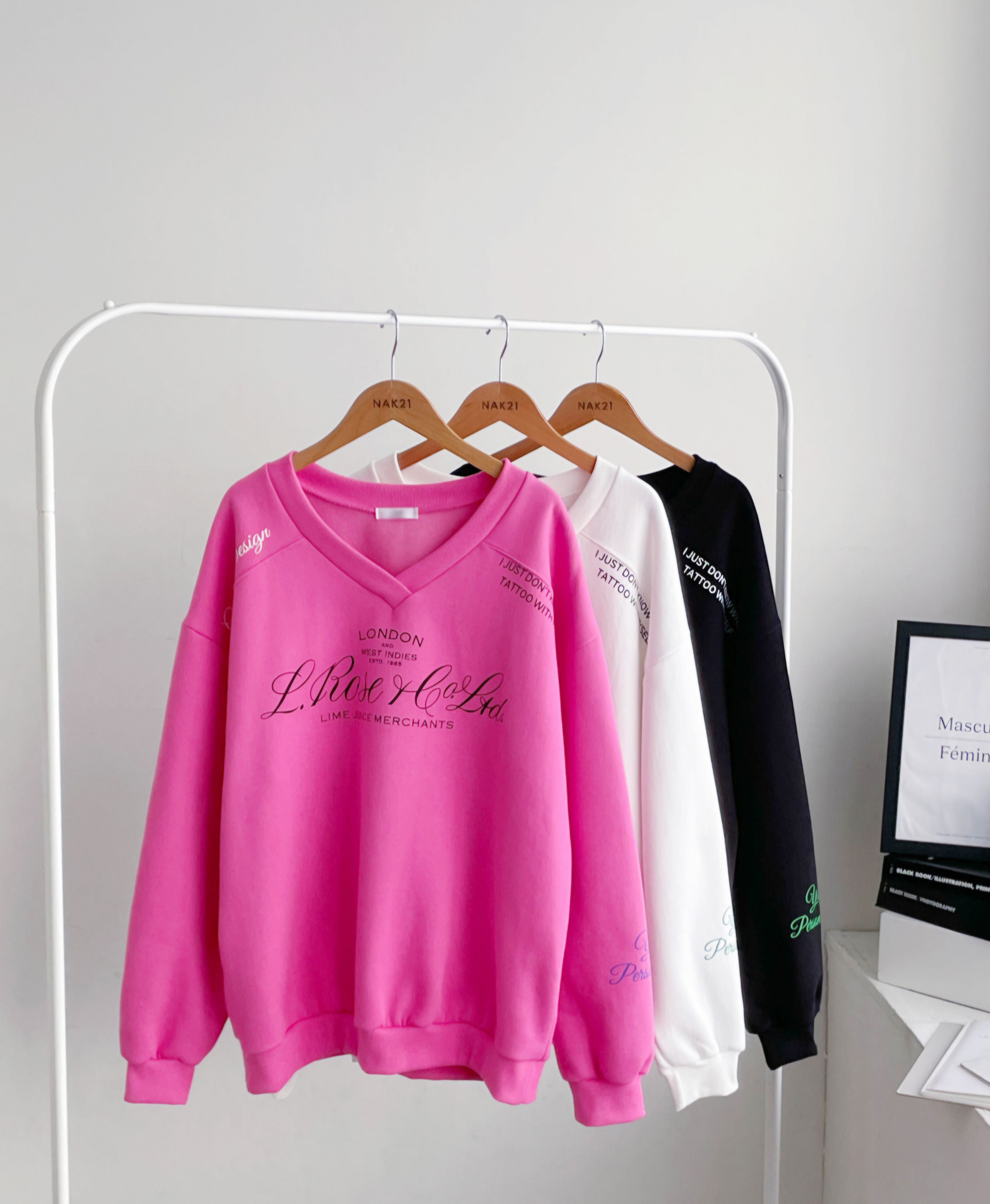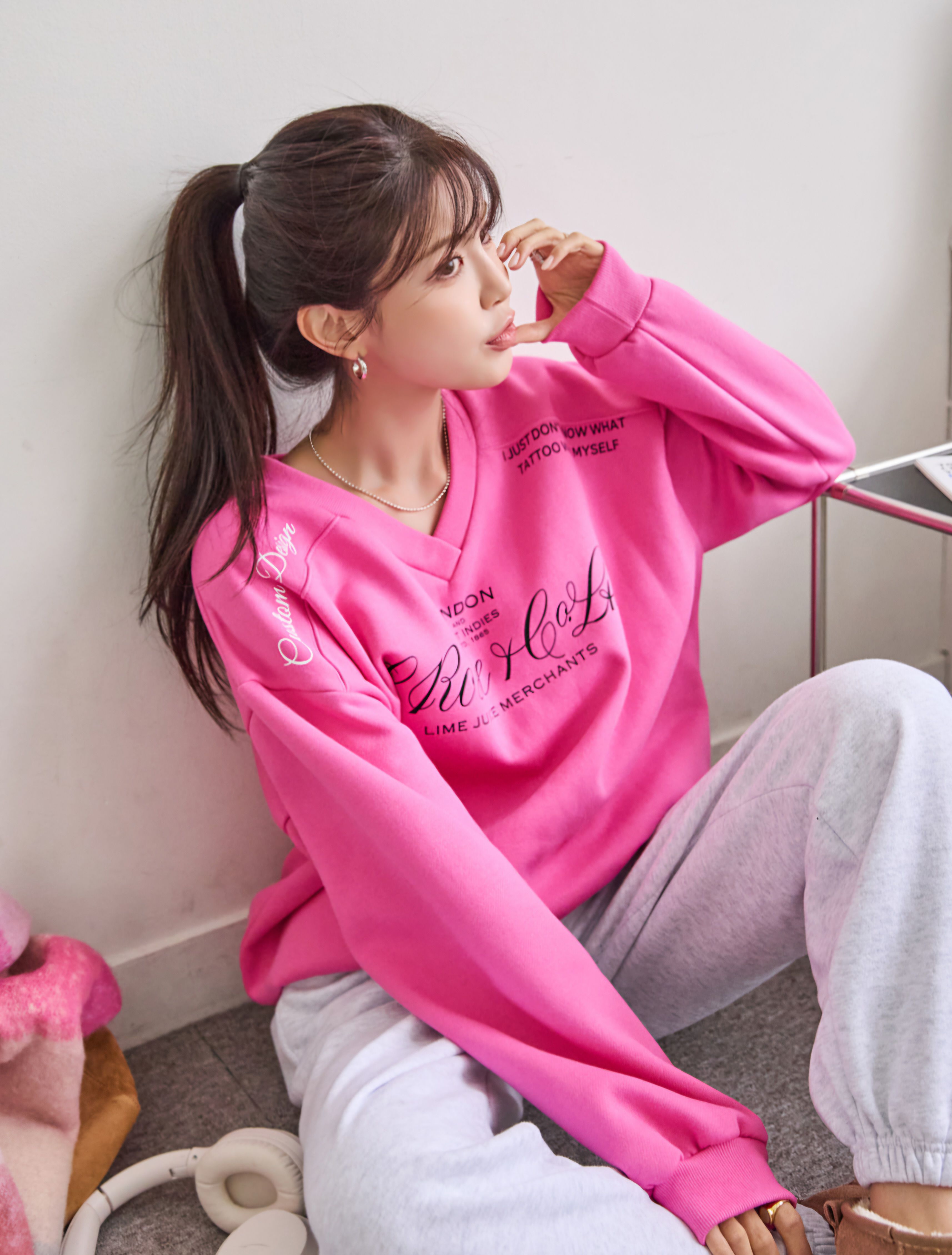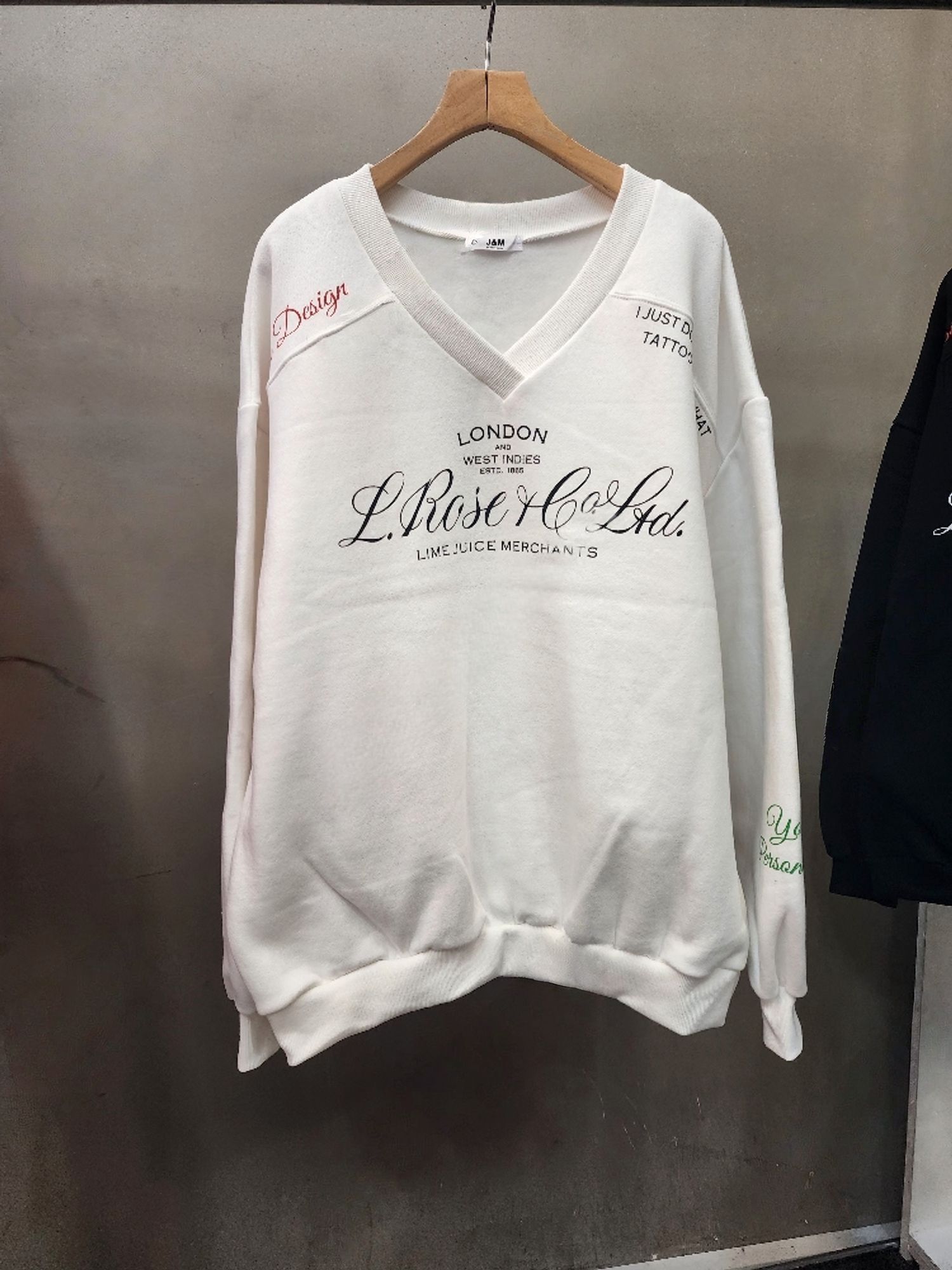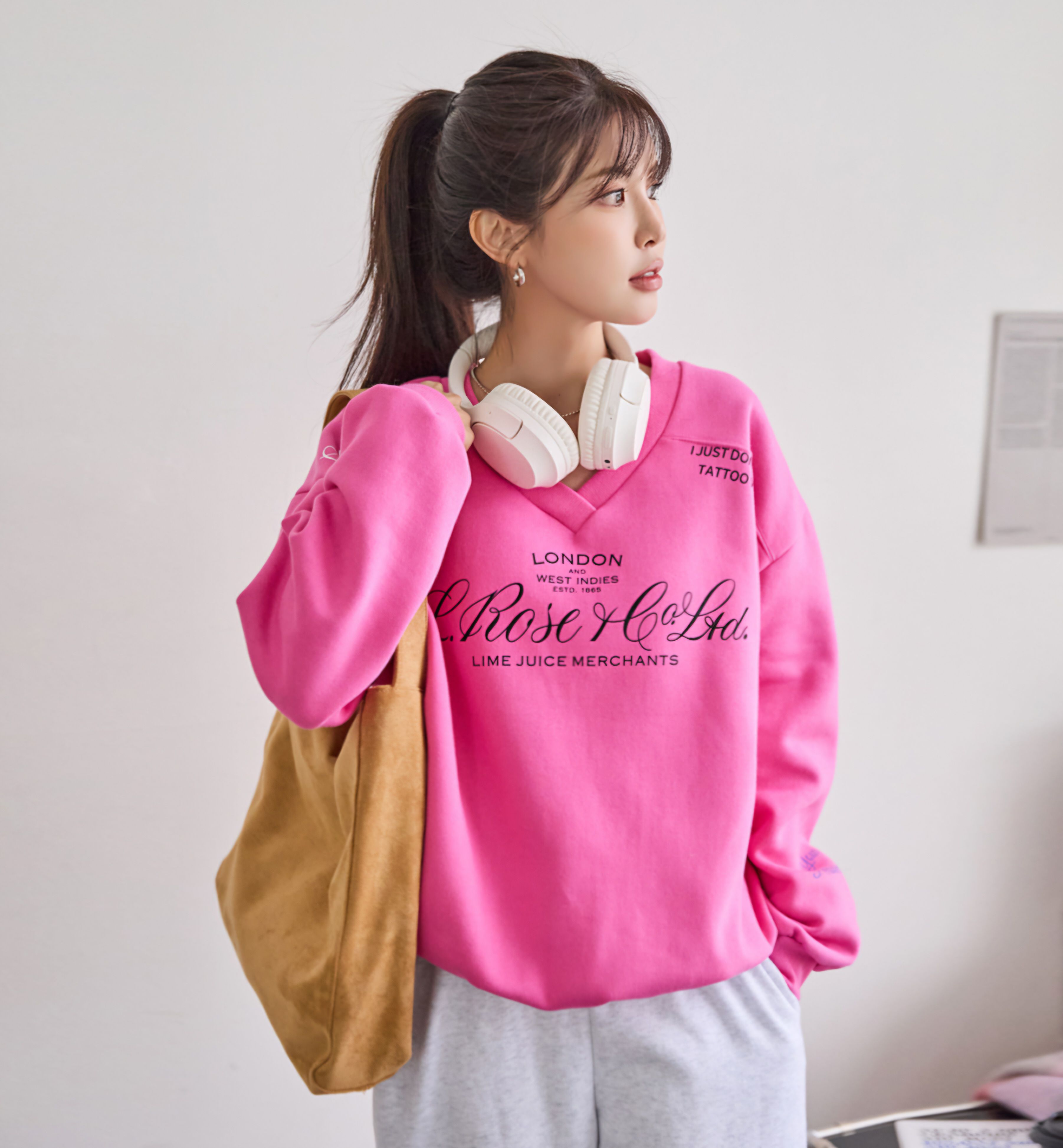 【C55804】韓國JNN 草寫字母大學T-深V領內刷毛寬鬆好氣色長袖上衣