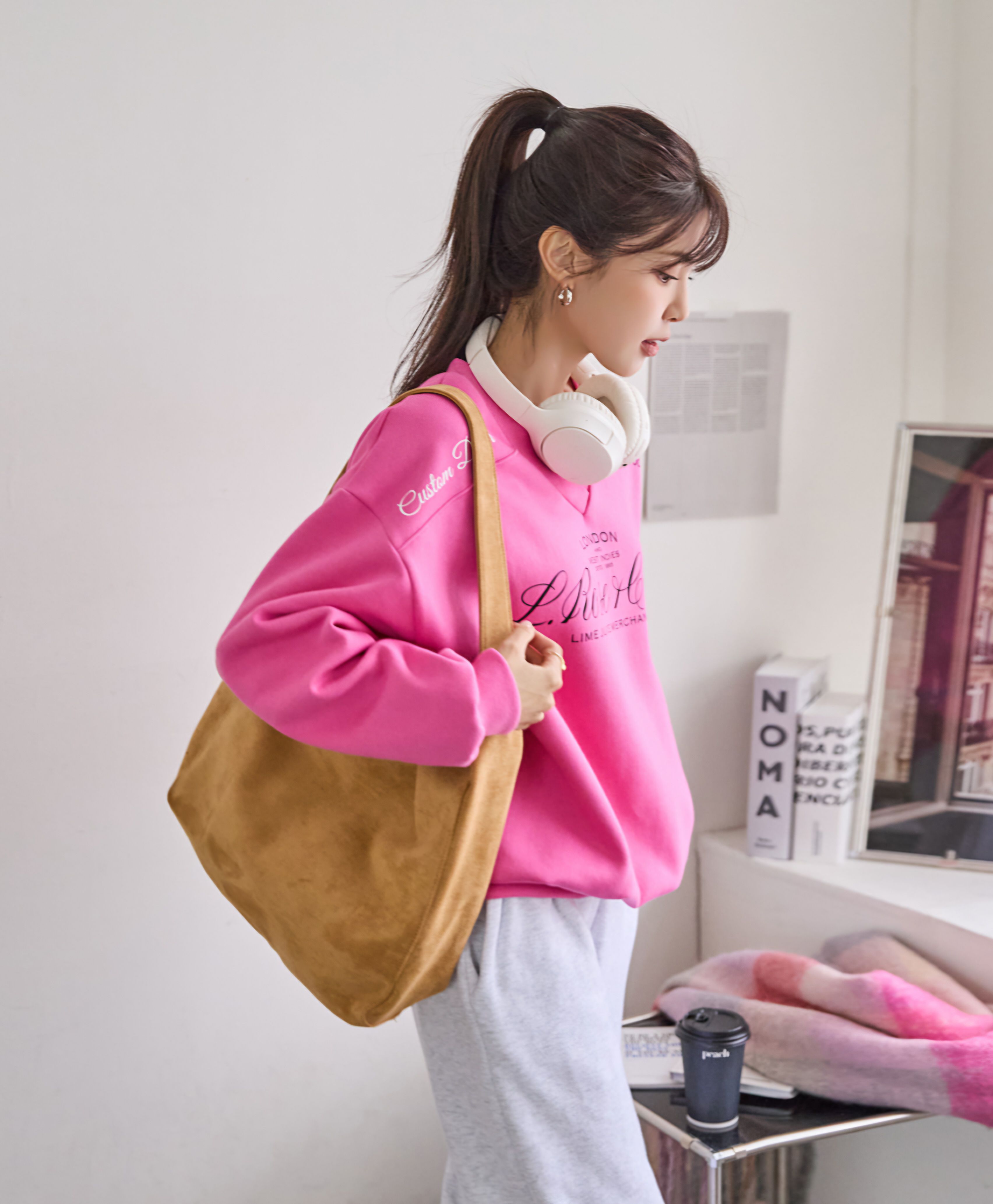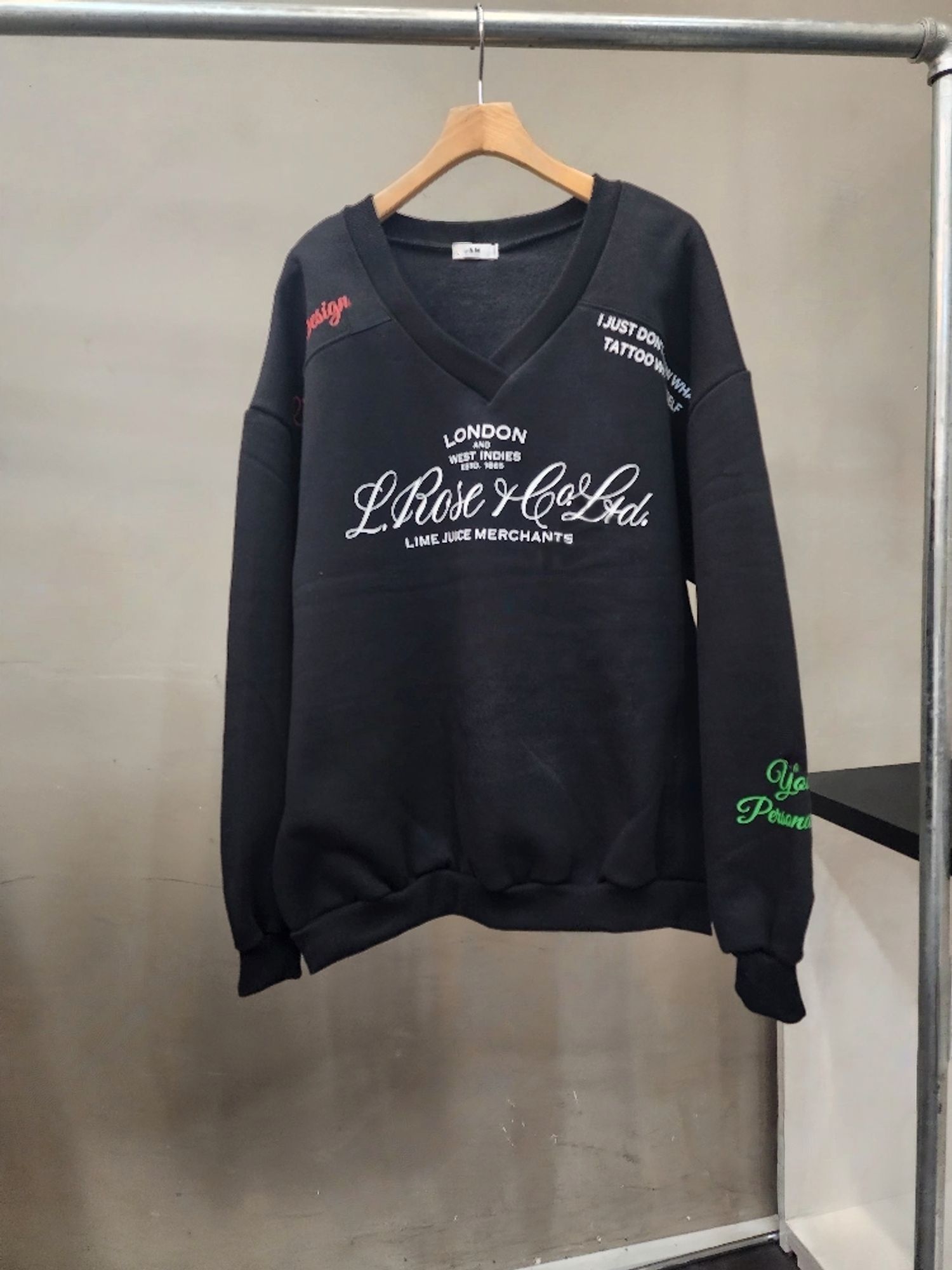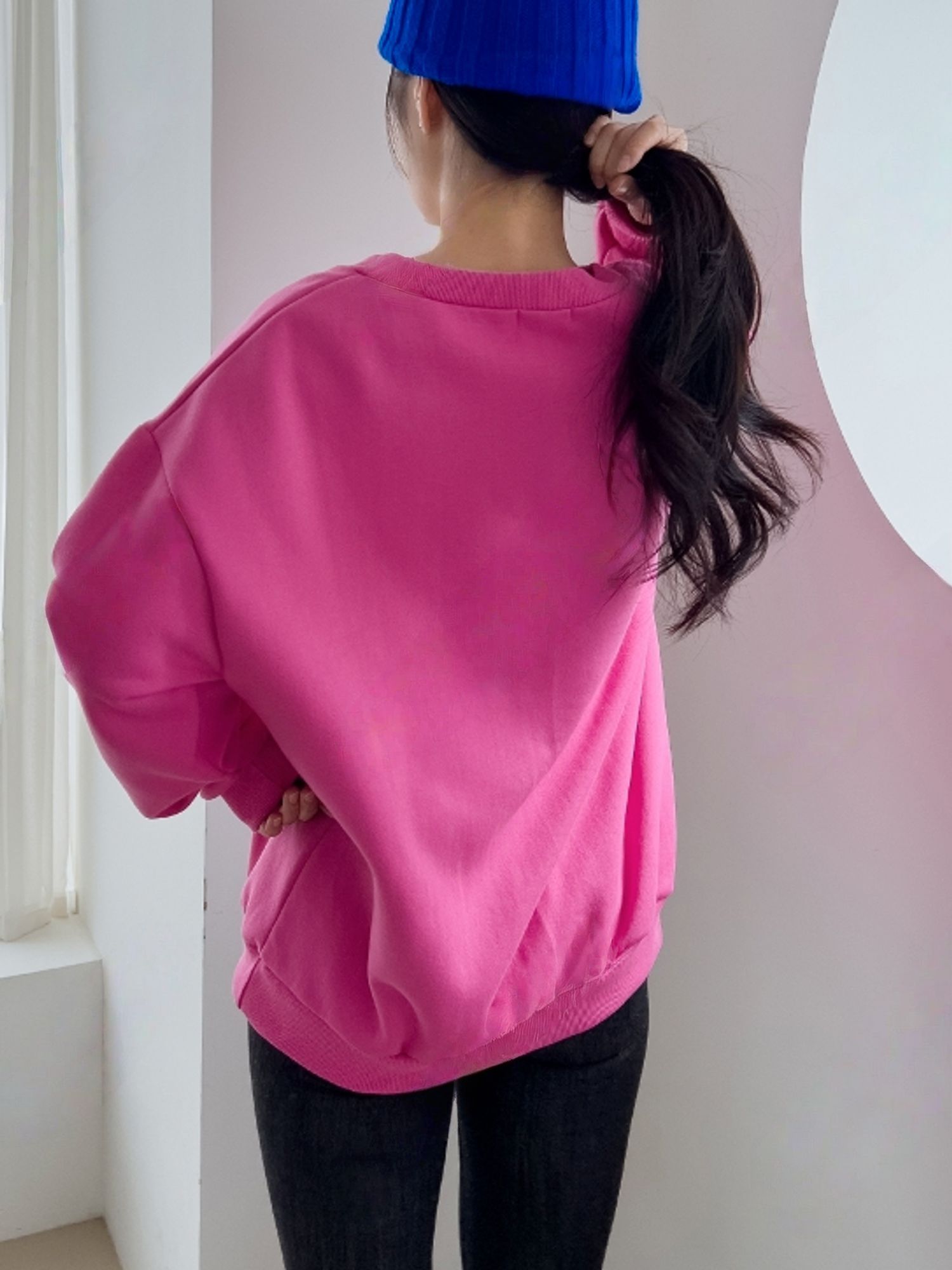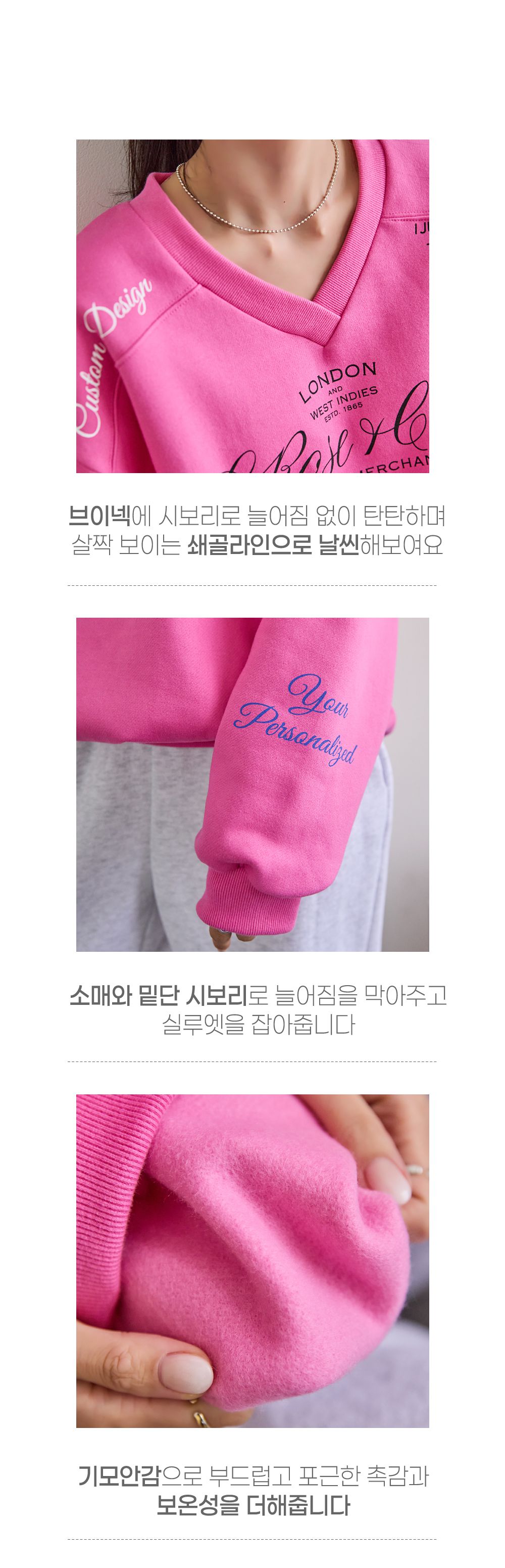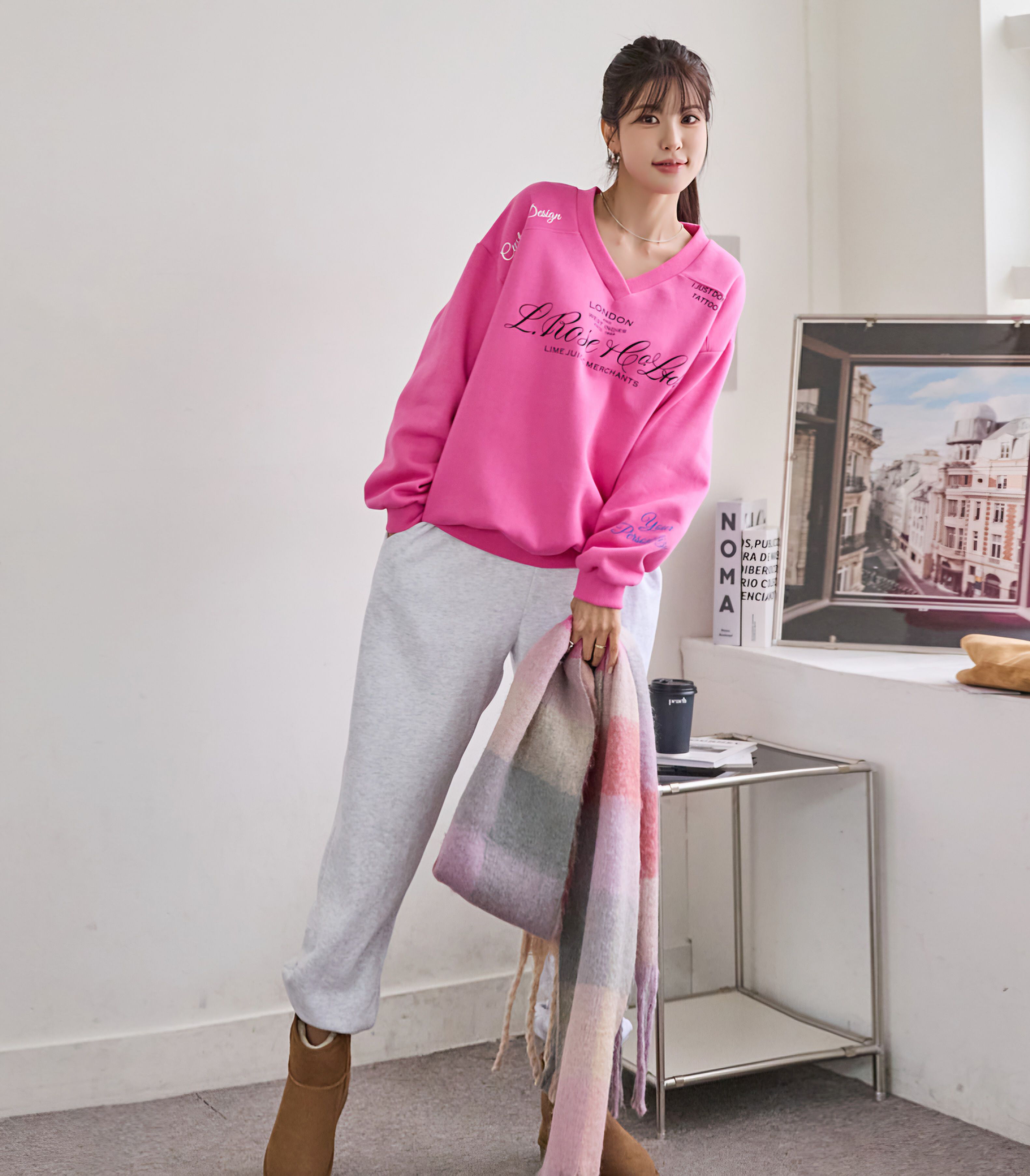 【C55804】韓國JNN 草寫字母大學T-深V領內刷毛寬鬆好氣色長袖上衣