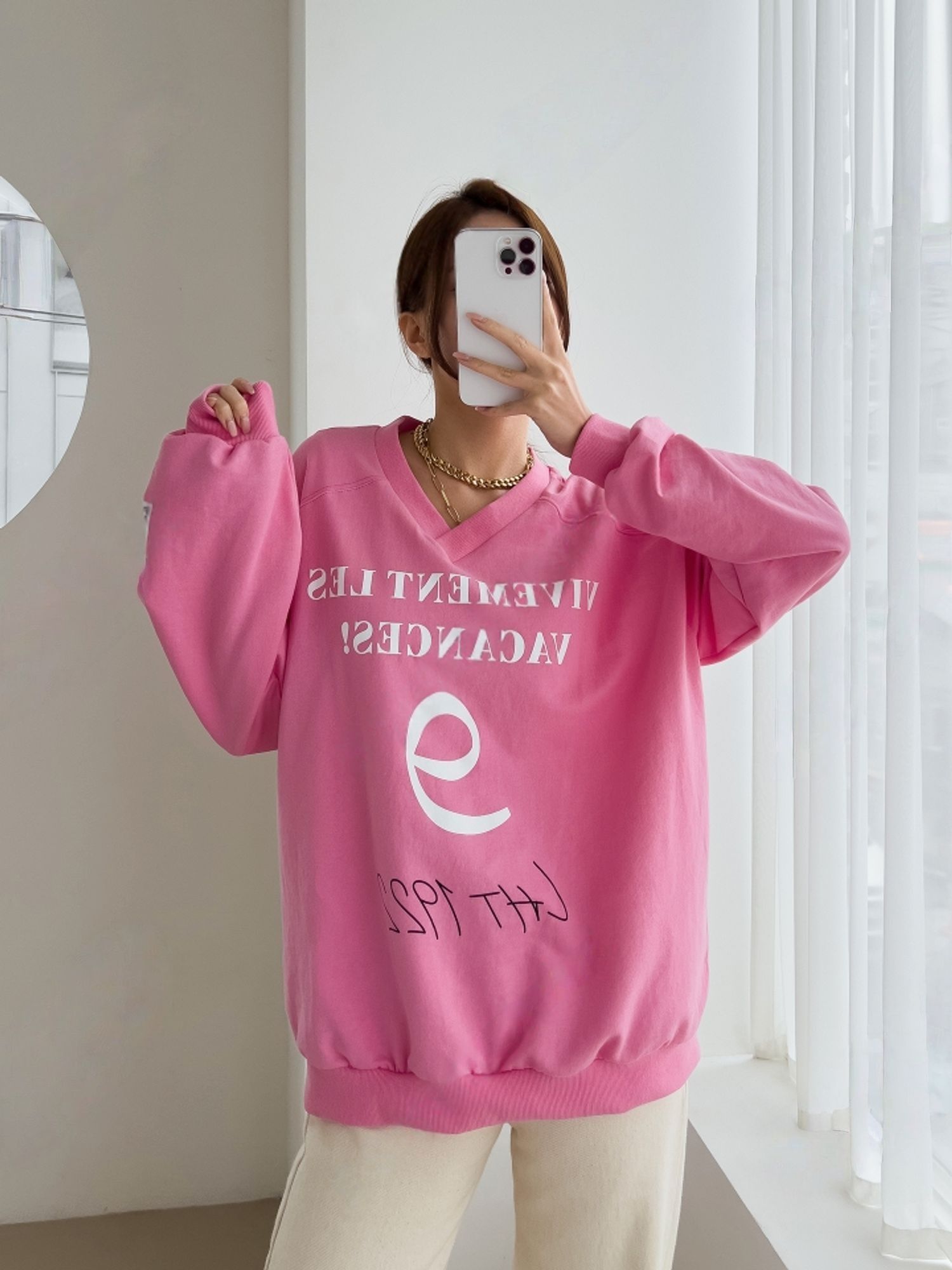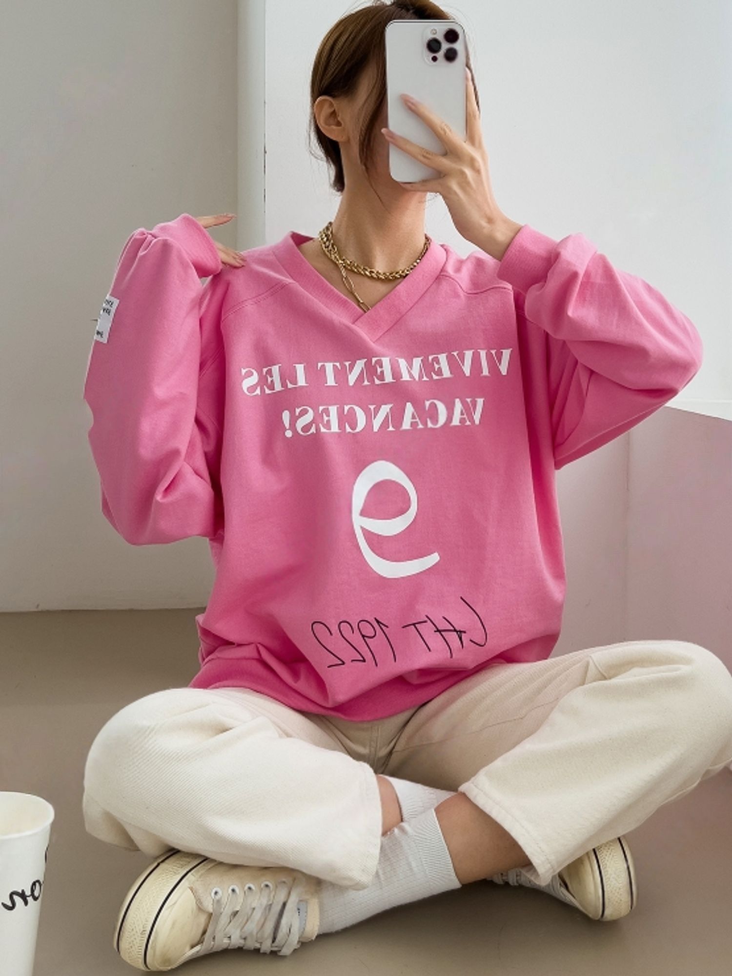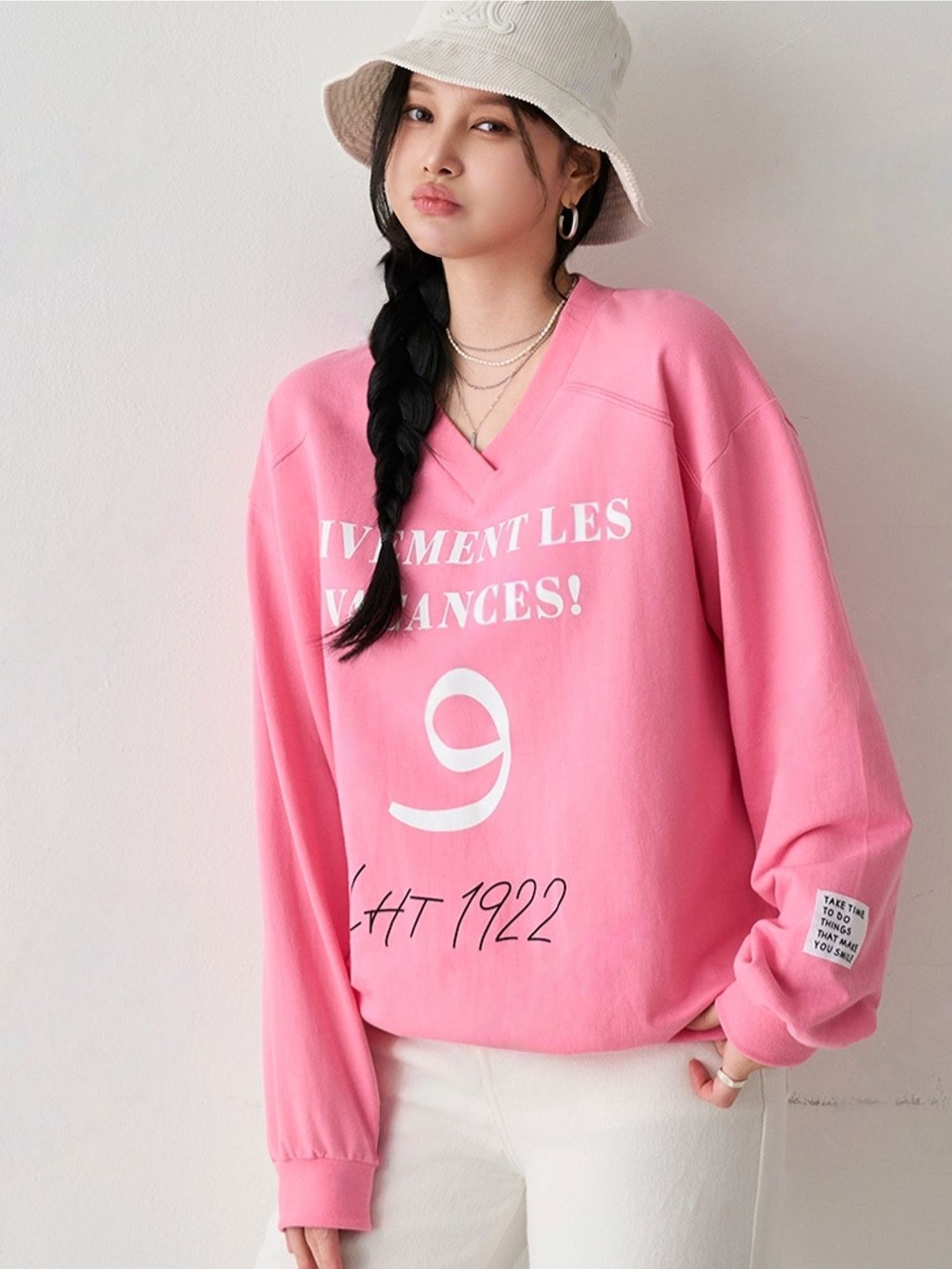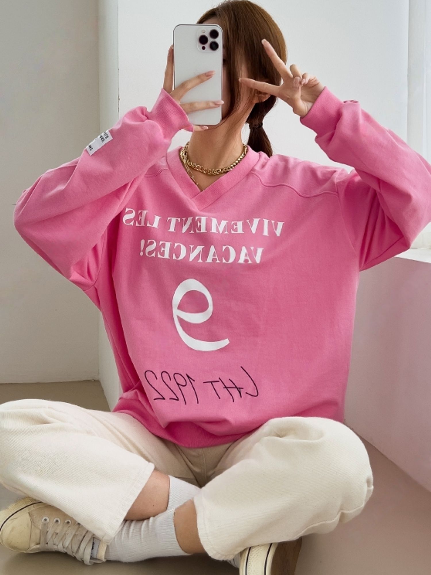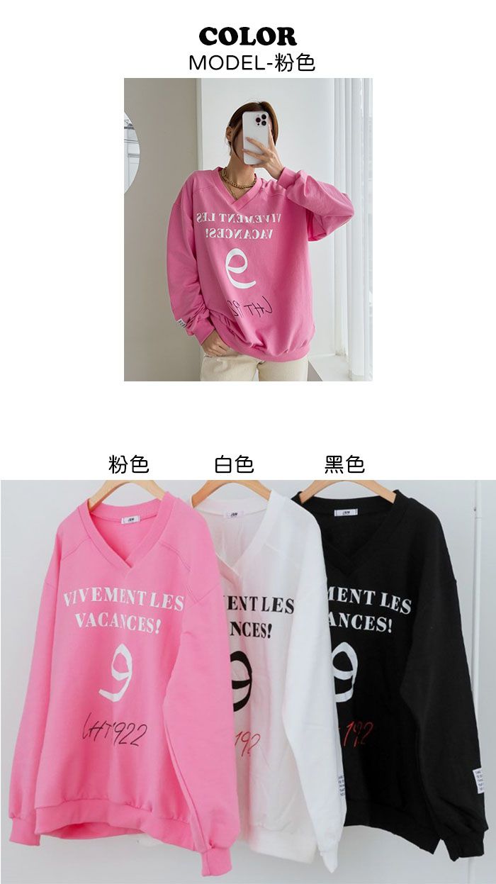 膠印字母/個性英文/數字98/深V領/好氣色/寬鬆版型/內裏毛圈棉 - 休閒居家英文字母上衣字母T恤布標袖字母上衣長袖上衣寬鬆大尺碼上衣粉色黑色白色
