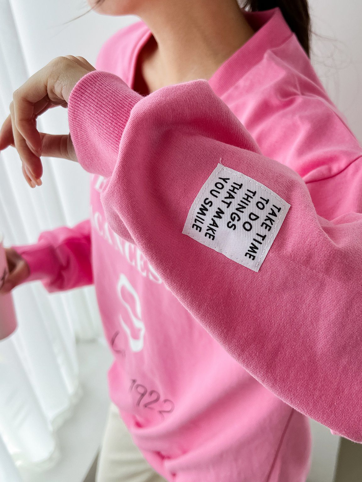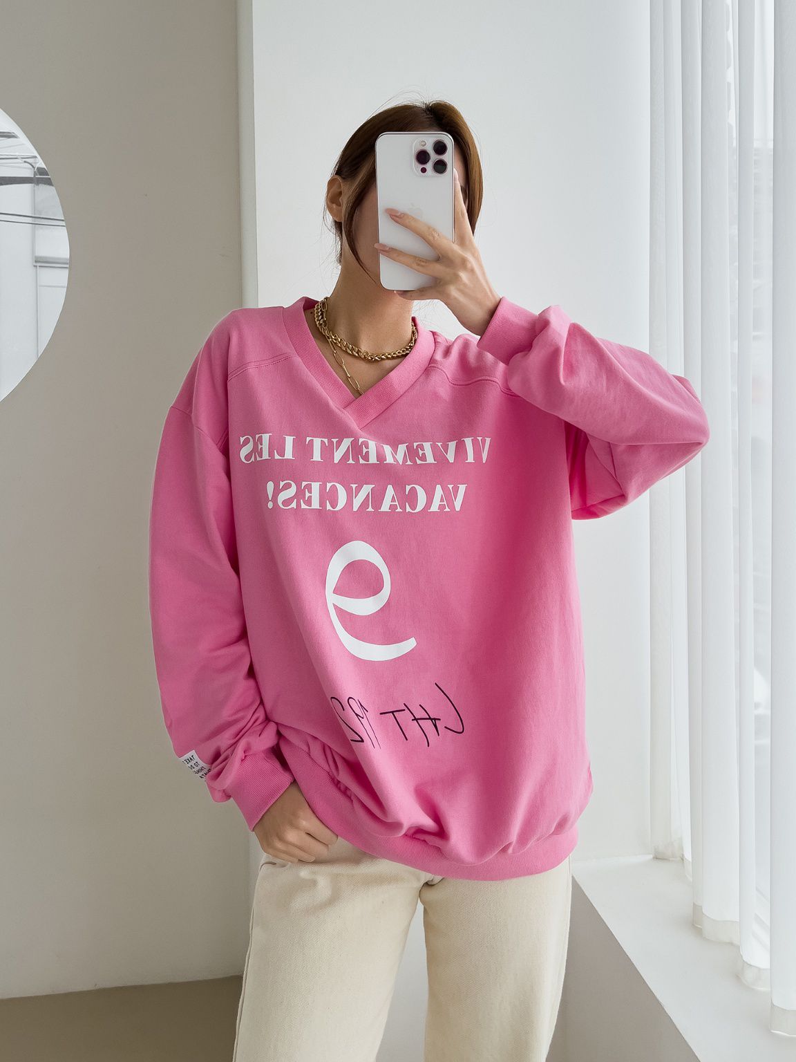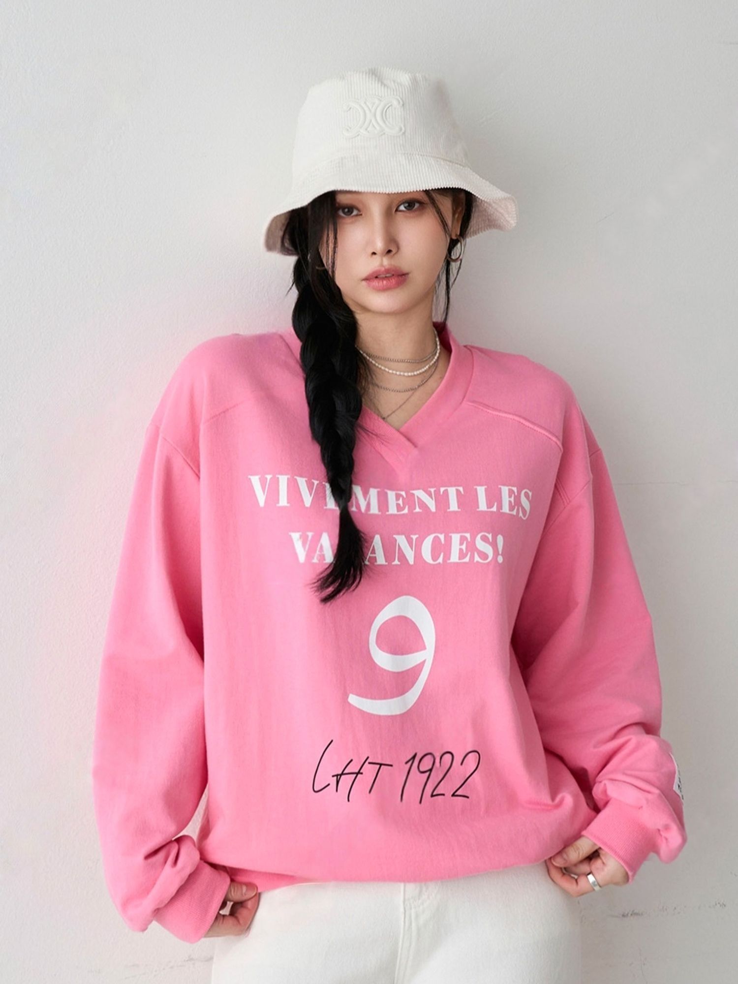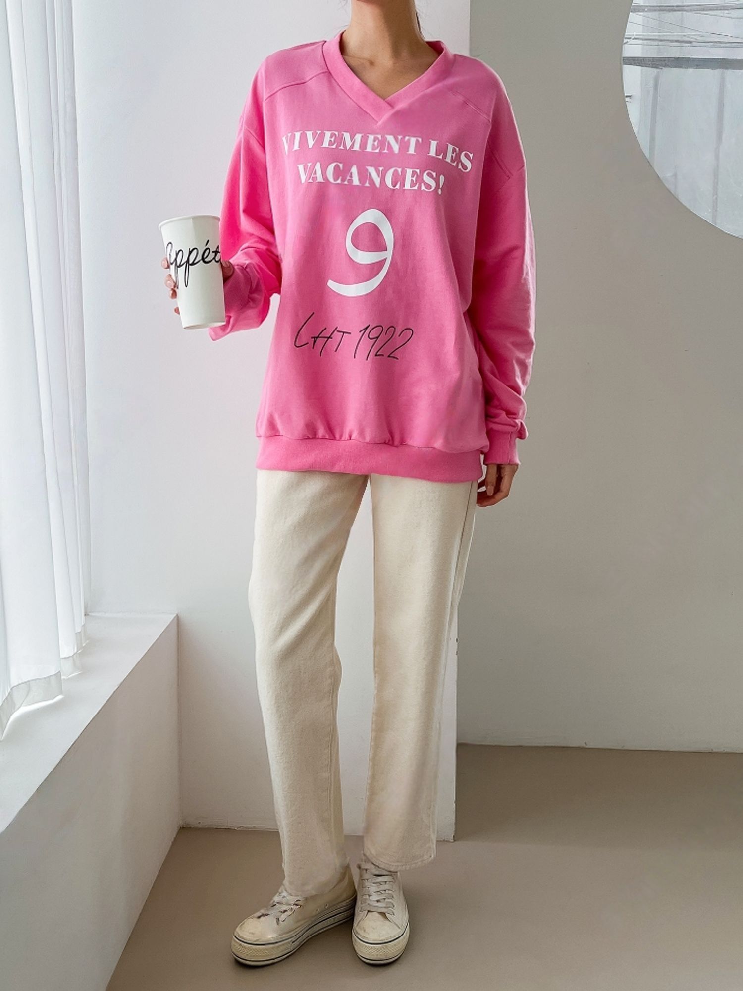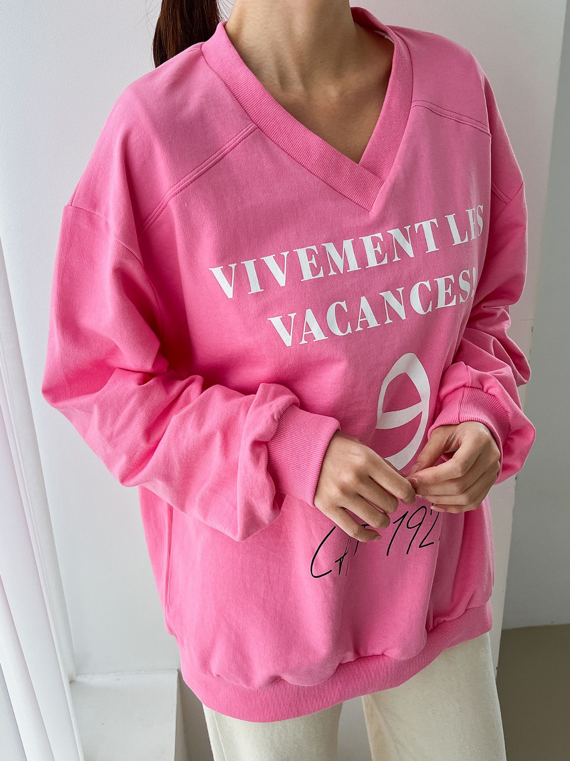 膠印字母/個性英文/數字98/深V領/好氣色/寬鬆版型/內裏毛圈棉 - 休閒居家英文字母上衣字母T恤布標袖字母上衣長袖上衣寬鬆大尺碼上衣粉色黑色白色