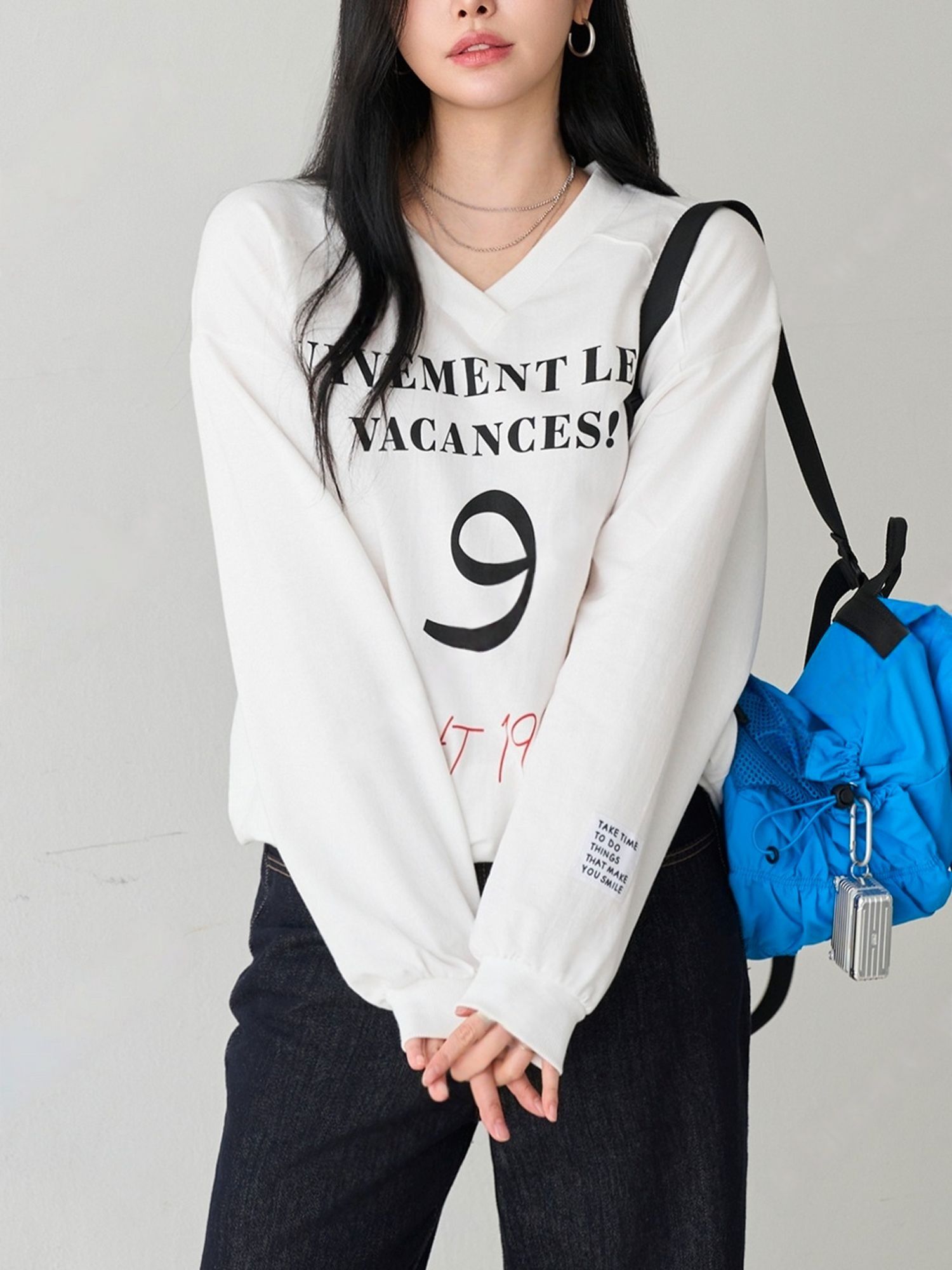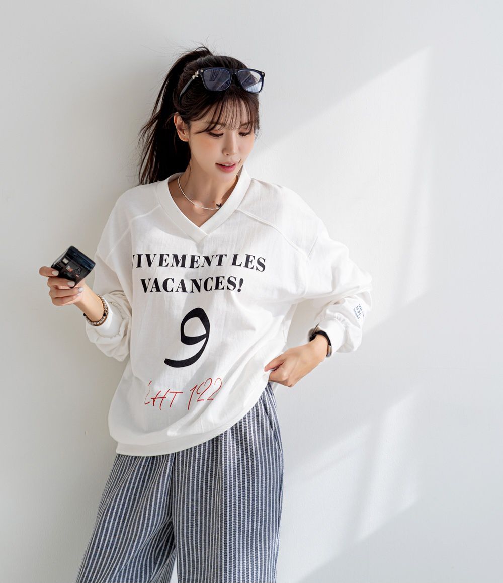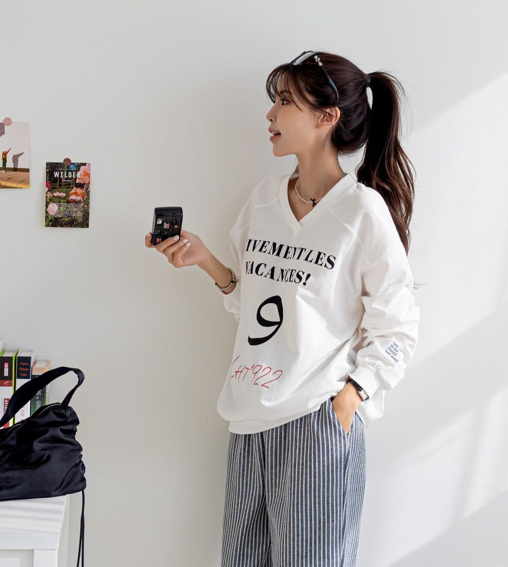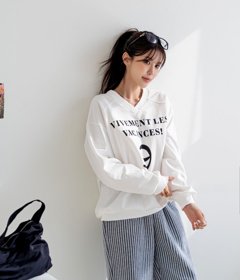 【C55814】韓國JNN 布標袖字母上衣-好氣色英文數字深V領寬鬆長袖