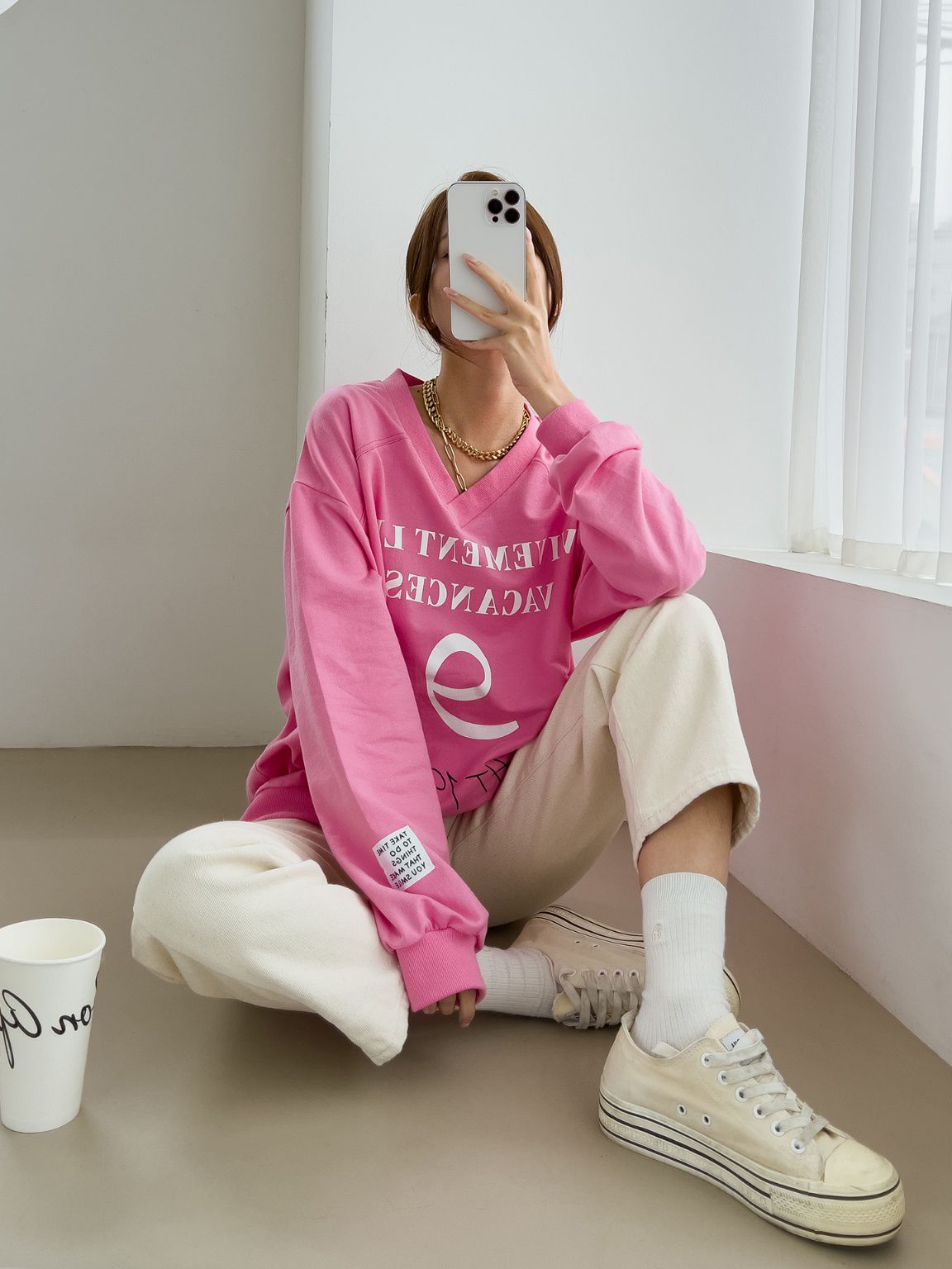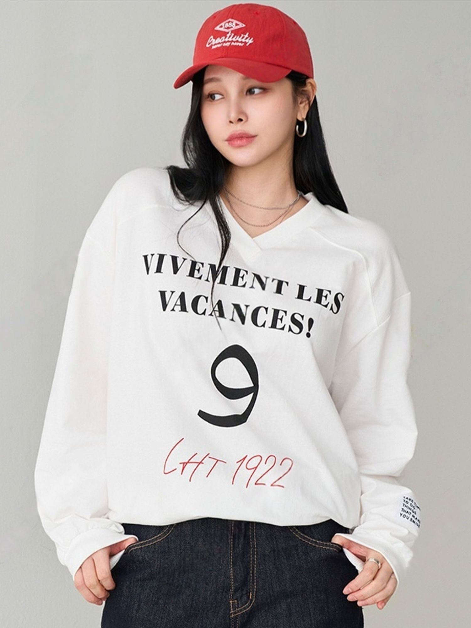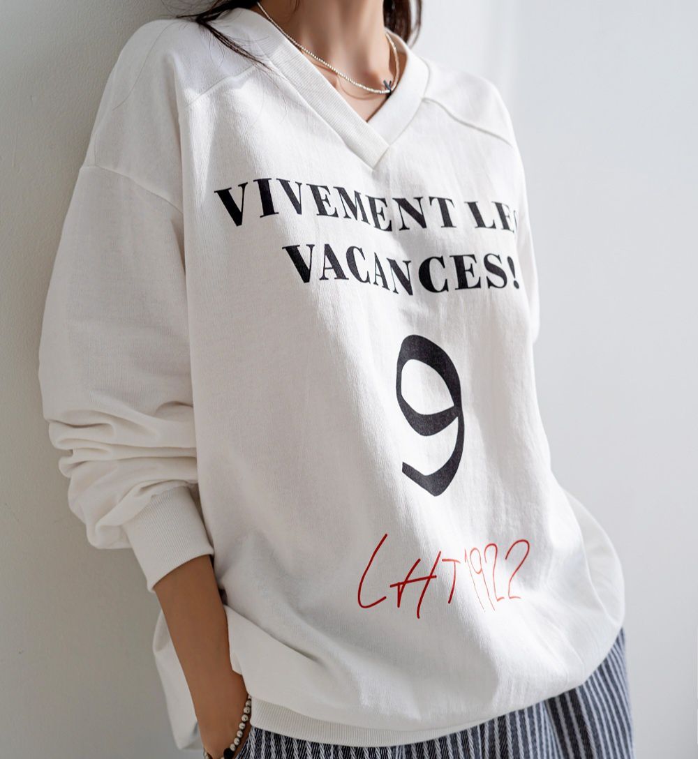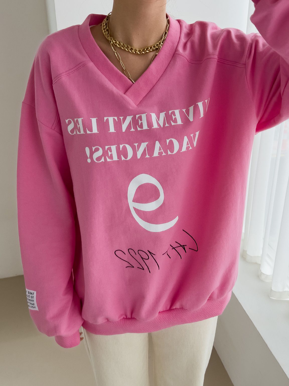 【C55814】韓國JNN 布標袖字母上衣-好氣色英文數字深V領寬鬆長袖