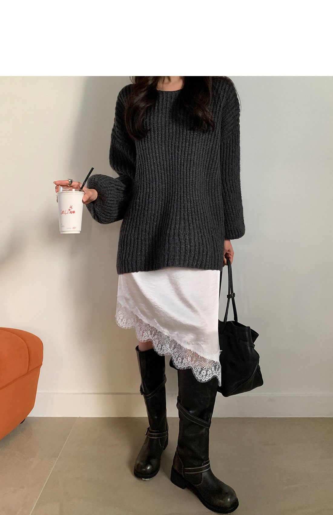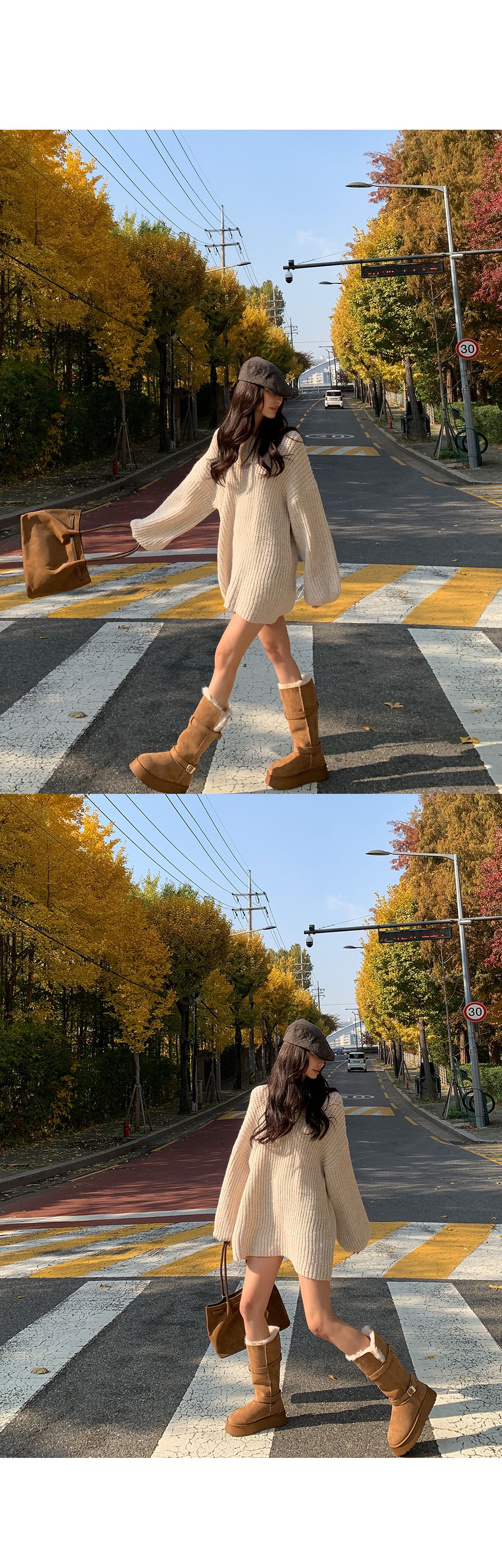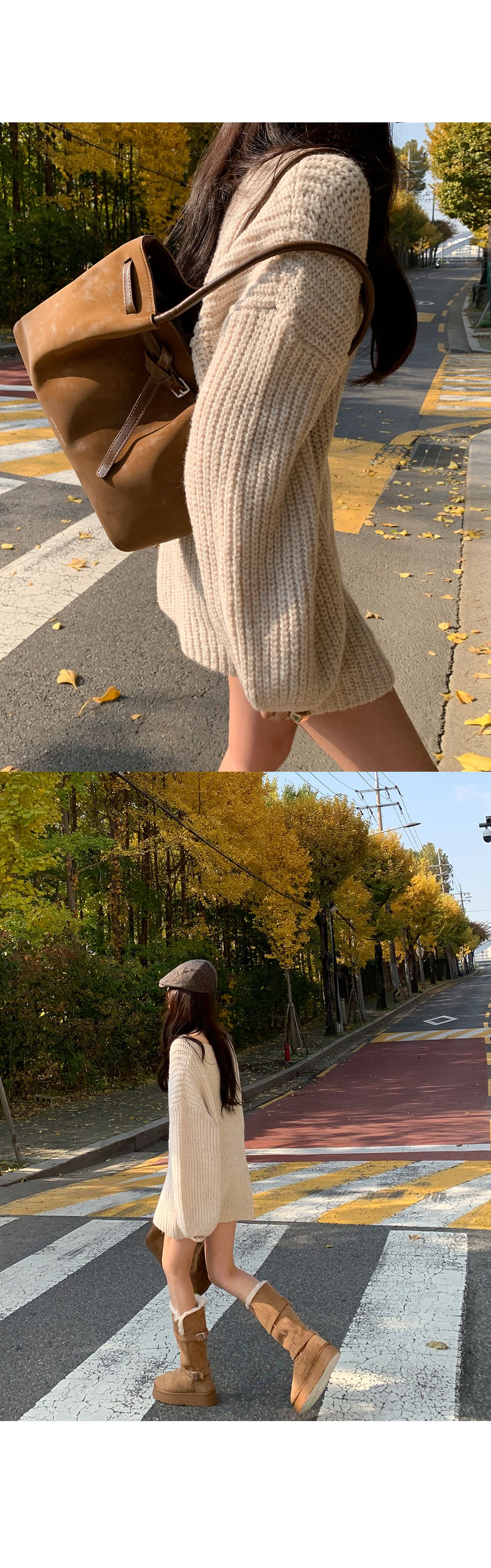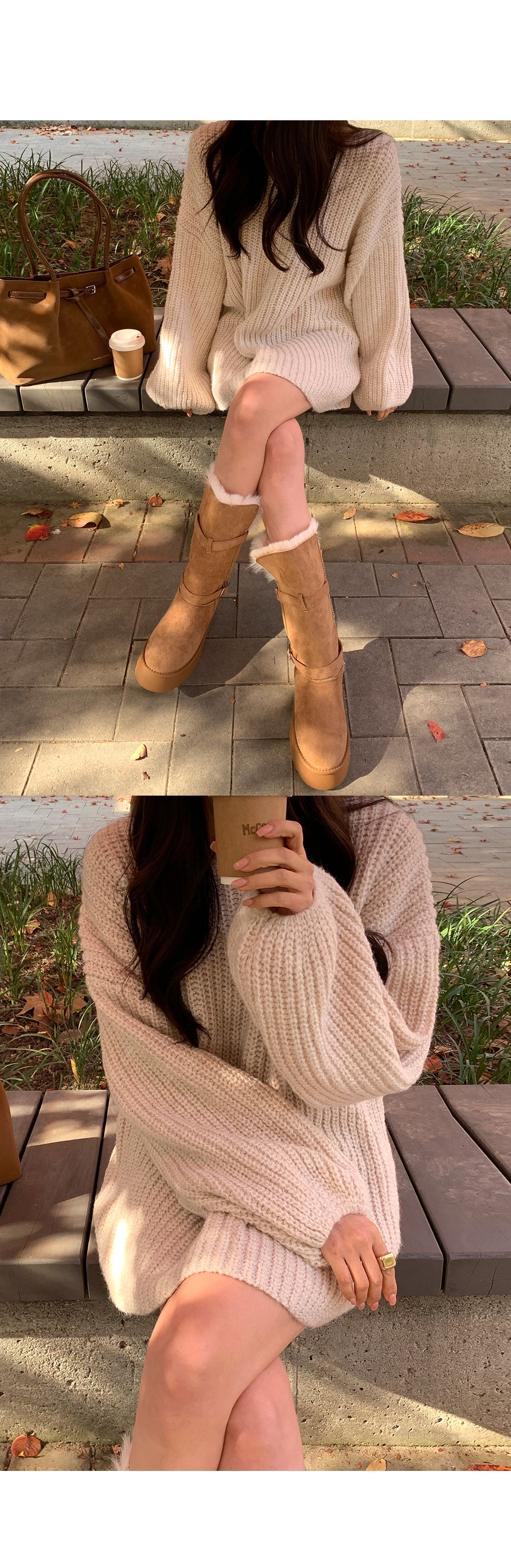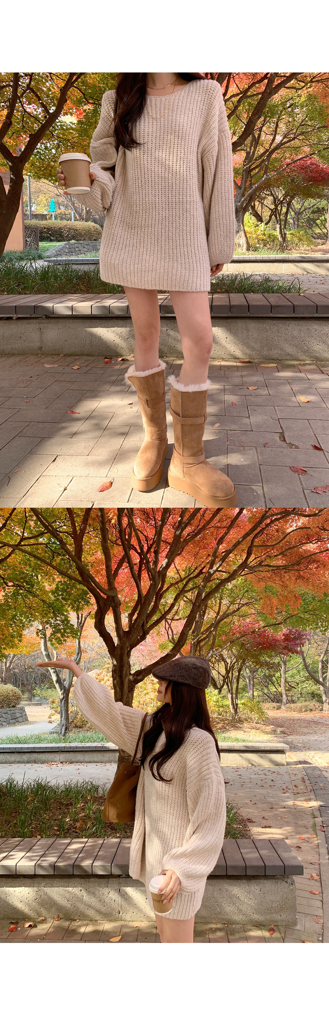 【C55815】韓國TMO 泡泡袖長版上衣-粗鉤針素面U領寬鬆長袖針織衫★★